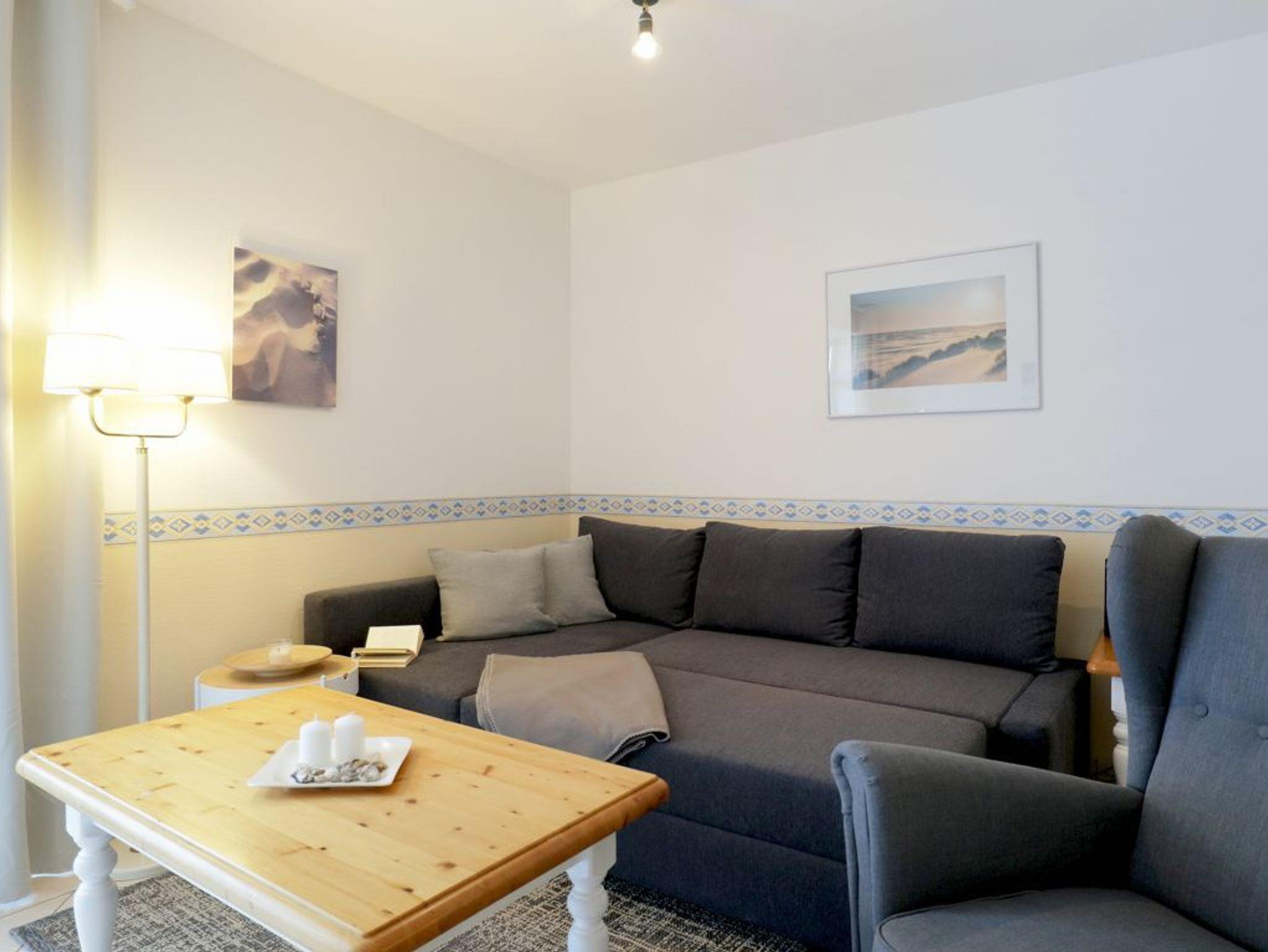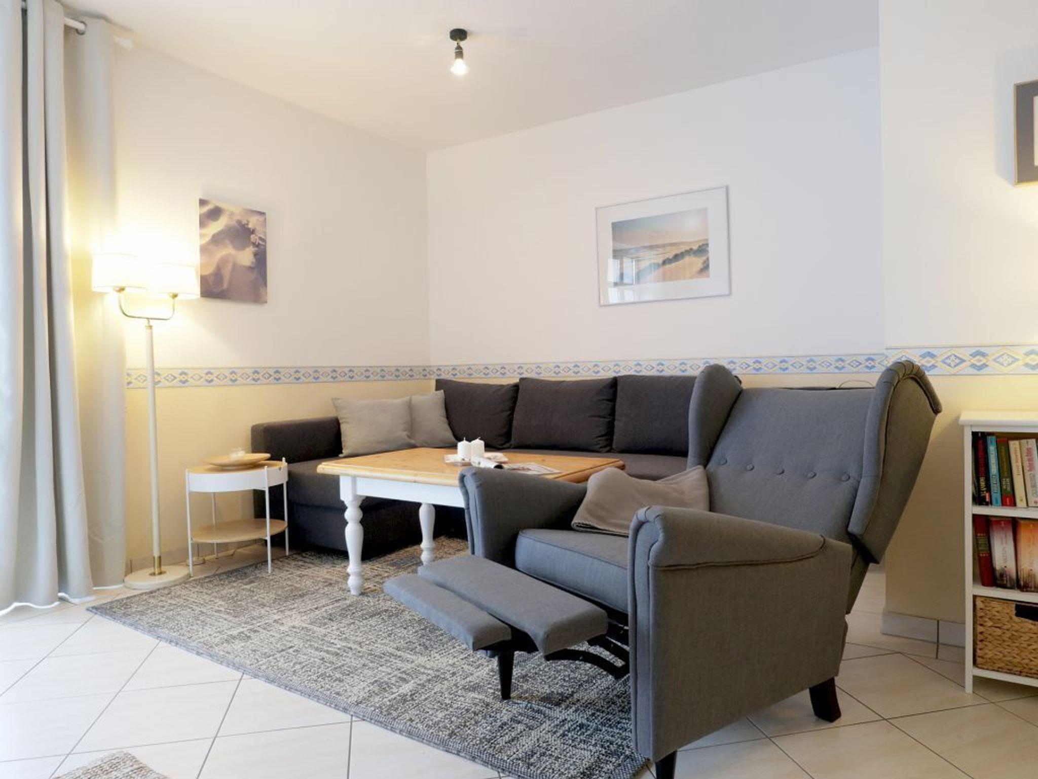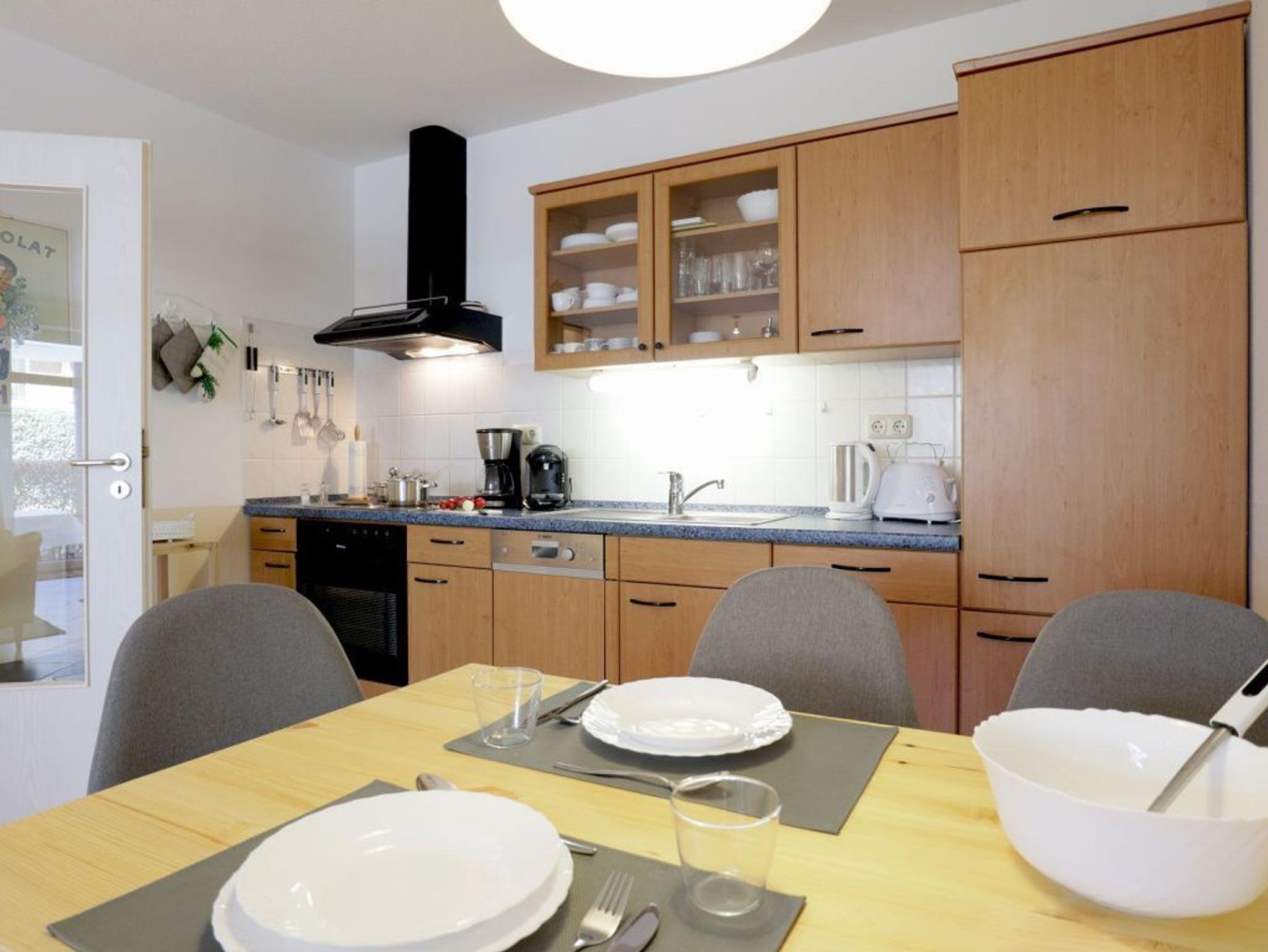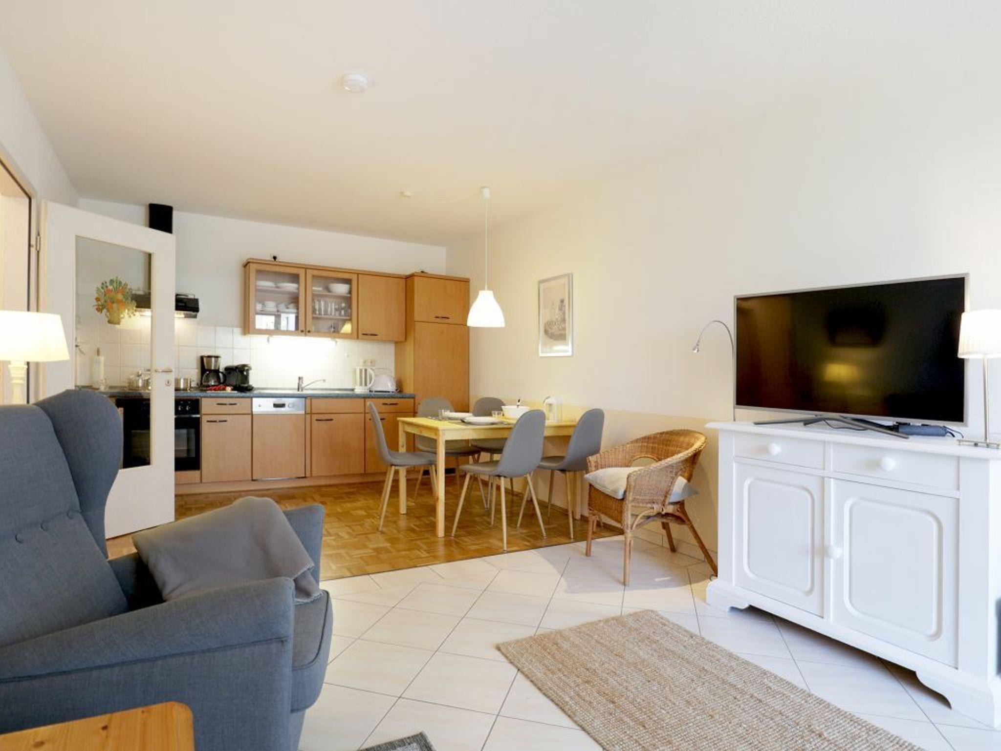 Das 2-Zimmer-Ferienappartement Haffblick 56 liegt im Erdgeschoss des Hauses und verfügt über eine Terrasse mit Grillmöglichkeit. Vom Wohnbereich gelangen Sie auf die geschützte Terrasse, welche in den Morgenstunden zum gemütlichen Frühstücken einlädt. Die Wohnfläche umfasst 49qm und eine Belegung ist mit bis zu 4 Personen möglich. Es empfängt Sie eine liebevoll möblierter Wohn-/Essbereich mit einem ausziehbaren Sofa, welches zwei weitere Schlafgelegenheiten bietet. Für gemeinsame Mahlzeiten ist ein Esstisch vorhanden. In der offenen Wohnküche können Sie bequem Ihre Urlaubsmahlzeiten zubereiten und sich somit bei Bedarf selbst versorgen. Ceranfeldherd, Backofen, Mikrowelle, Dunstabzugshaube gehören ebenso zur Ausstattung, wie Wasserkocher, Toaster, Kaffeemaschine und Geschirrspüler. Technische Unterhaltungselektronik bieten ein Fernseher mit Sky- Programmen/ Premiere, DVD-Player, eine Musikanlage sowie der gebührenfreie Internetzugang über WLAN. Geruhsame Nächte verbringen Sie in dem separaten Schlafzimmer mit Doppelbett und Kleiderschrank. Zugehörig ist ein innenliegendes Duschbad mit Waschtisch und WC. Allen Hausgästen stehen Waschmaschine und Wäschetrockner zur gemeinschaftlichen Nutzung gegen Gebühr zur Verfügung. Für Ihren PKW ist ein kostenfreier Außenstellplatz am Haus reserviert. Fahrradunterstellmöglichkeiten sind ebenfalls vorhanden. Bitte beachten Sie, dass in der Wohnung nicht geraucht werden darf und auch Haustiere nicht gestattet sind. Sie wohnen nur 200 Meter zum feinsandigen Strand mit guten Bademöglichkeiten.