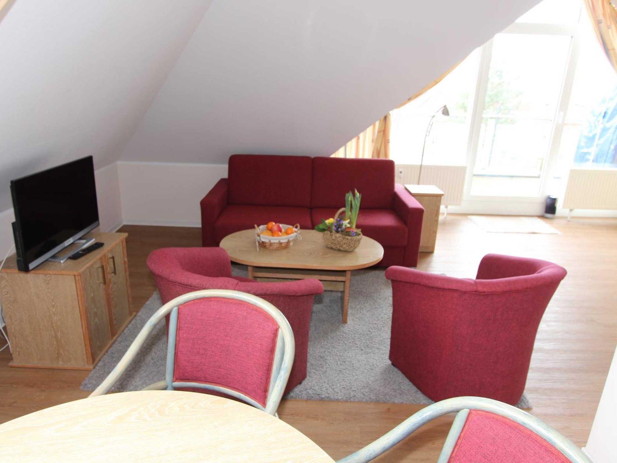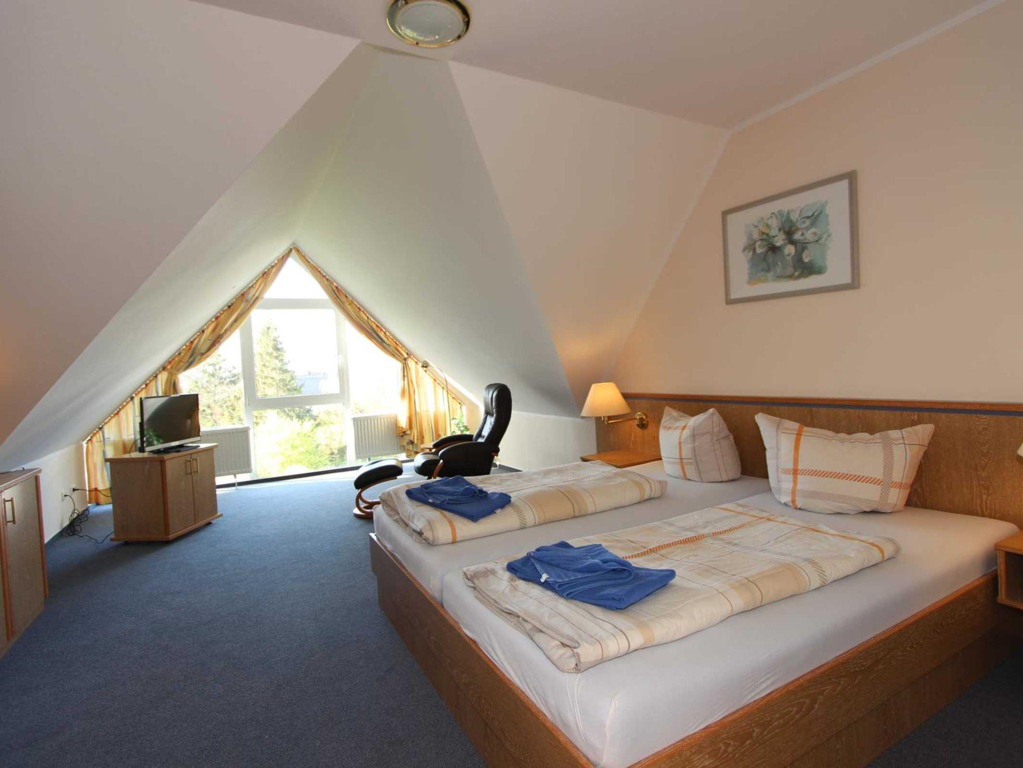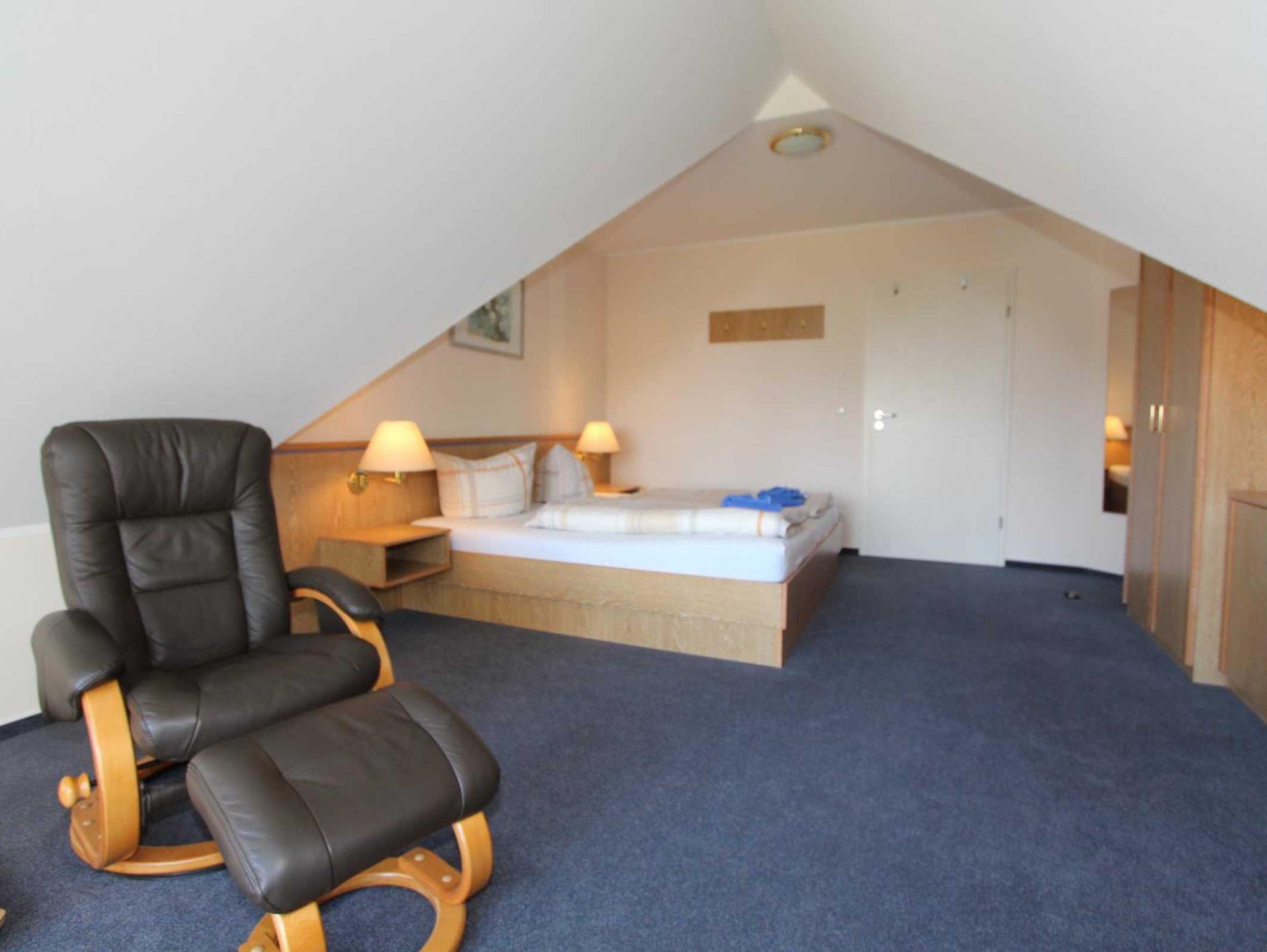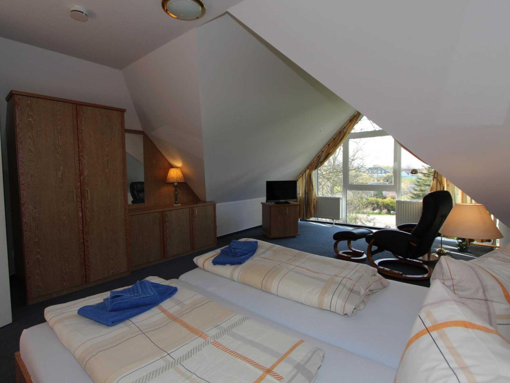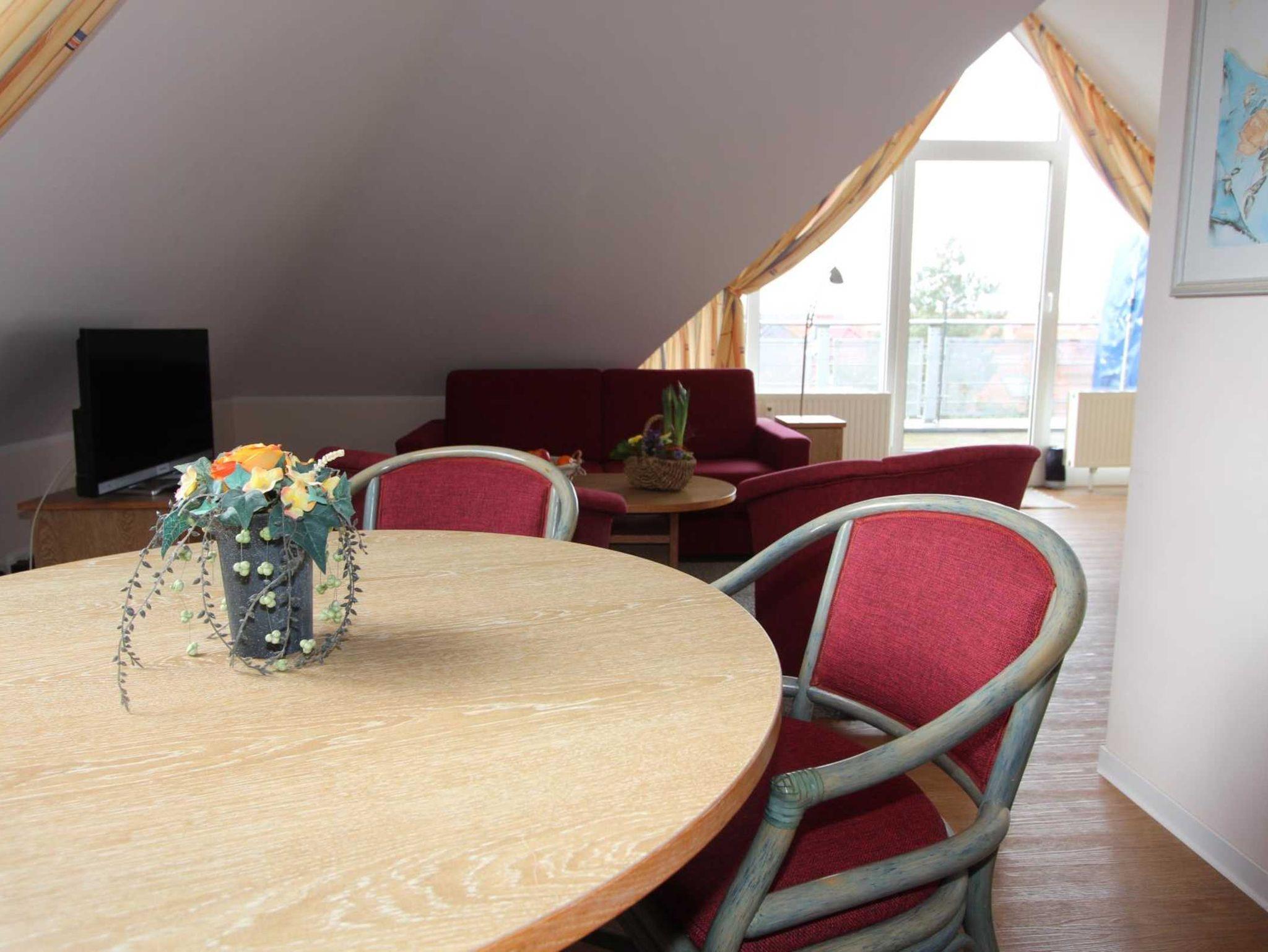 Sie wohnen in einem 2-Zimmer-Appartement für bis zu 4 Personen auf ca. 65 m² im Spitzboden der Residenz Seestern. Die Wohnung verfügt über ein großes Schlafzimmer mit Doppelbett und zusätlichen TV, ein großer heller Wohnraum mit bequemer Doppelbettcouch, separater Essplatz, voll ausgestatteter Küchenbereich mit Geschirrspüler und Mikrowelle, Dusche/WC, große Dachterrasse, SAT-TV und Telefon.
