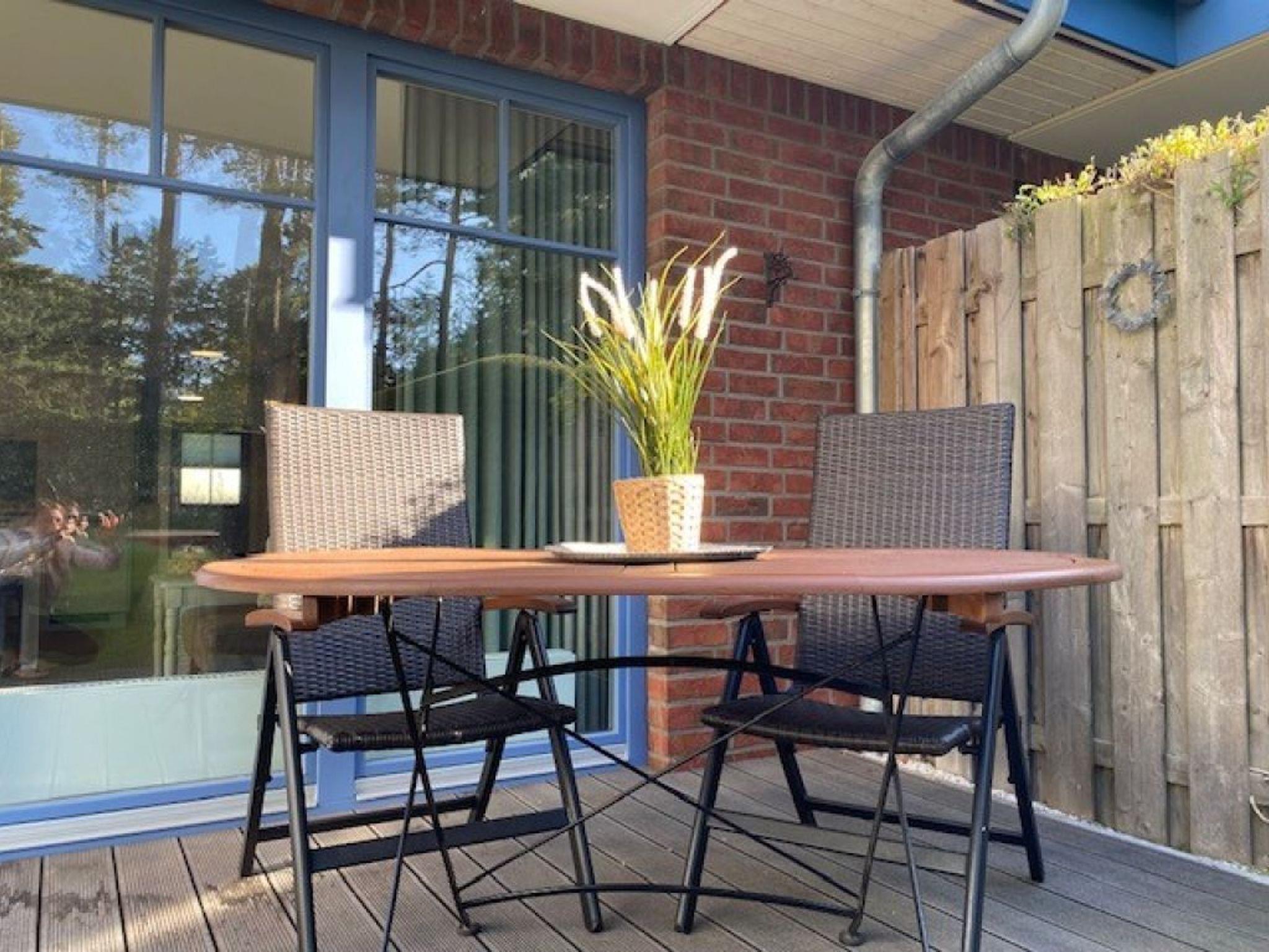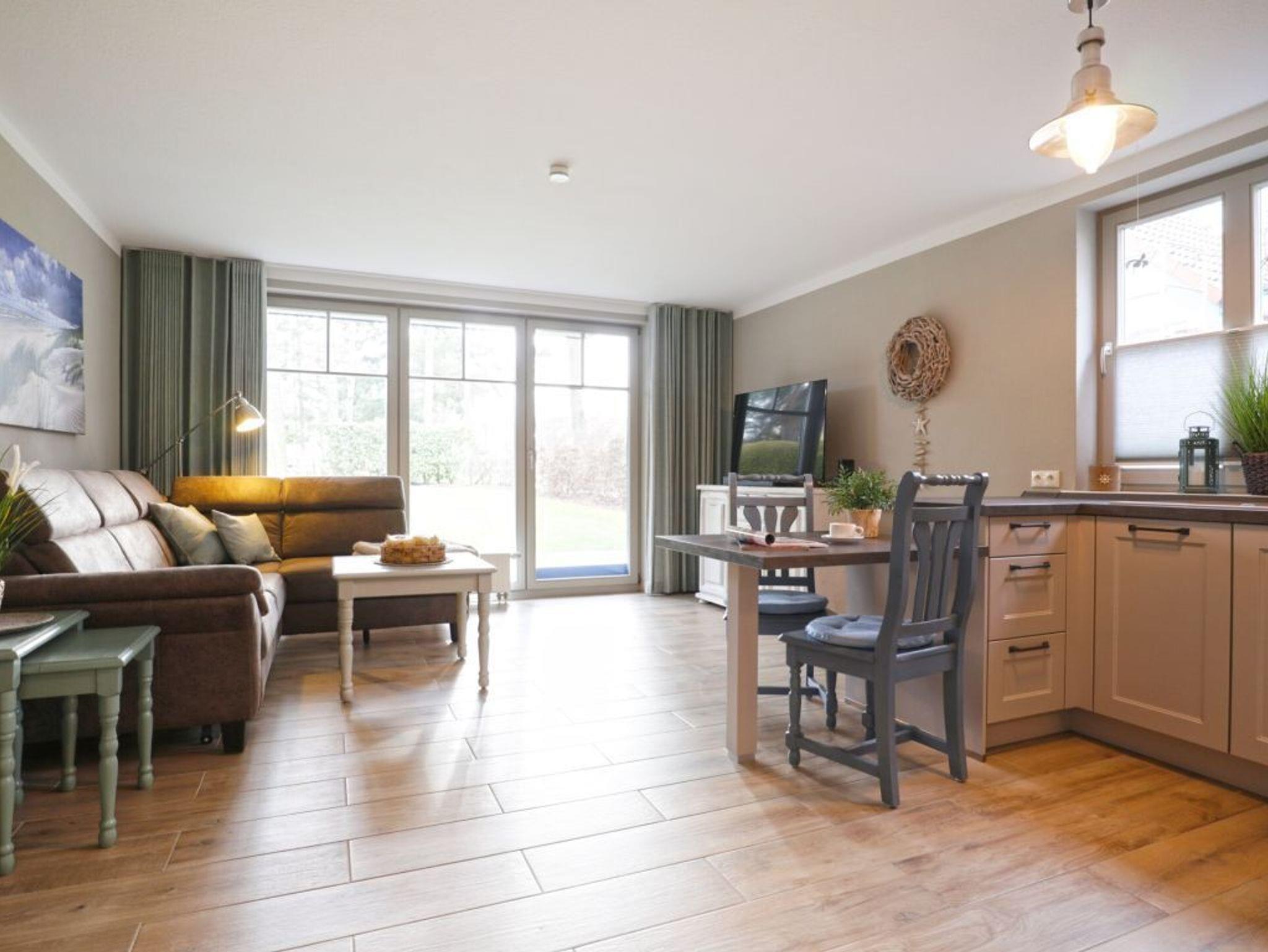 Die vollständig modernisierte 2-Zimmer Ferienwohnung Papillon 17-4, bietet eine geräumige Wohnfläche von 55qm und kann mit bis zu 3 Personen belegt werden.Die hochwertig möblierte Wohnung befindet sich im Erdgeschoss und bietet eine Terrasse mit Elektrogrillmöglichkeit. Der im offenen Stil gestaltete Wohn-/Essbereich ist mit einer gemütlichen Couch ausgestattet, welche sich leicht zu einem Schlafplatz mit den Maßen 180 x 200cm umwandeln lässt. Moderne Unterhaltungselektronik bieten Smart - TV mit Soundbase sowie Musikanlage und kostenfreies WLAN. Vollständig ausgestattet ist die offene Komfortküchenzeile, so dass Sie sich bei Bedarf selbständig mit Urlaubsmahlzeiten versorgen können. Ihre gemeinsamen Mahlzeiten nehmen Sie an einem Esstisch zu sich. Während der wärmeren Jahreszeit können Sie Ihre Mahlzeiten auch auf der saisonal möblierten Terrasse mit Blick ins Grüne genießen und wenn Sie mögen, gerne den hochwertigen Elektrogrill nutzen.