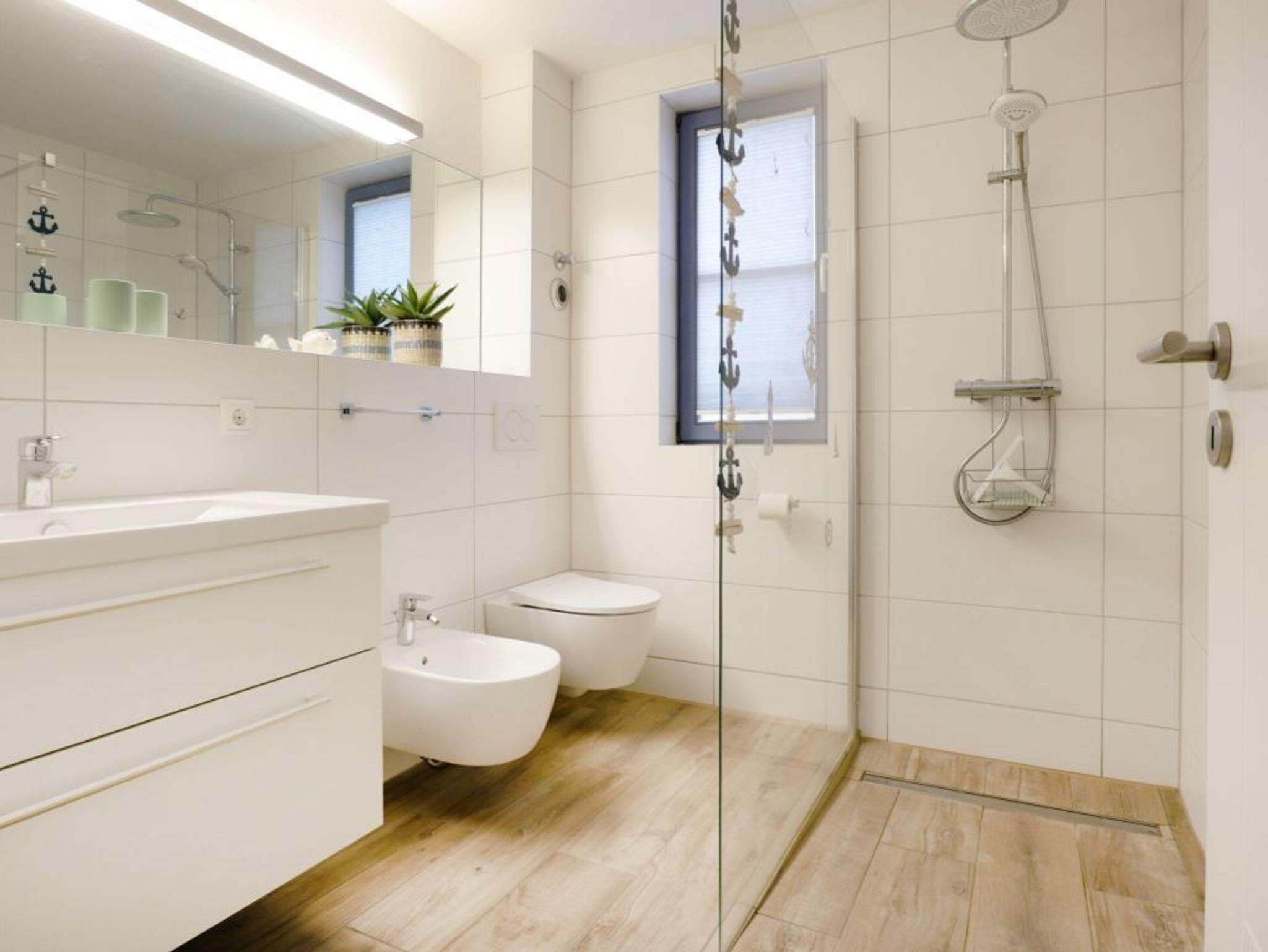 Die Wohlfühlwohnung besitzt ein separates, ausgesprochen behaglich möbliertes Schlafzimmer mit Doppelbett und Kleiderschrank. Freude bereitet ist das großzügige, ebenerdige Tageslicht Duschbad mit Waschtisch, Bidet und WC.