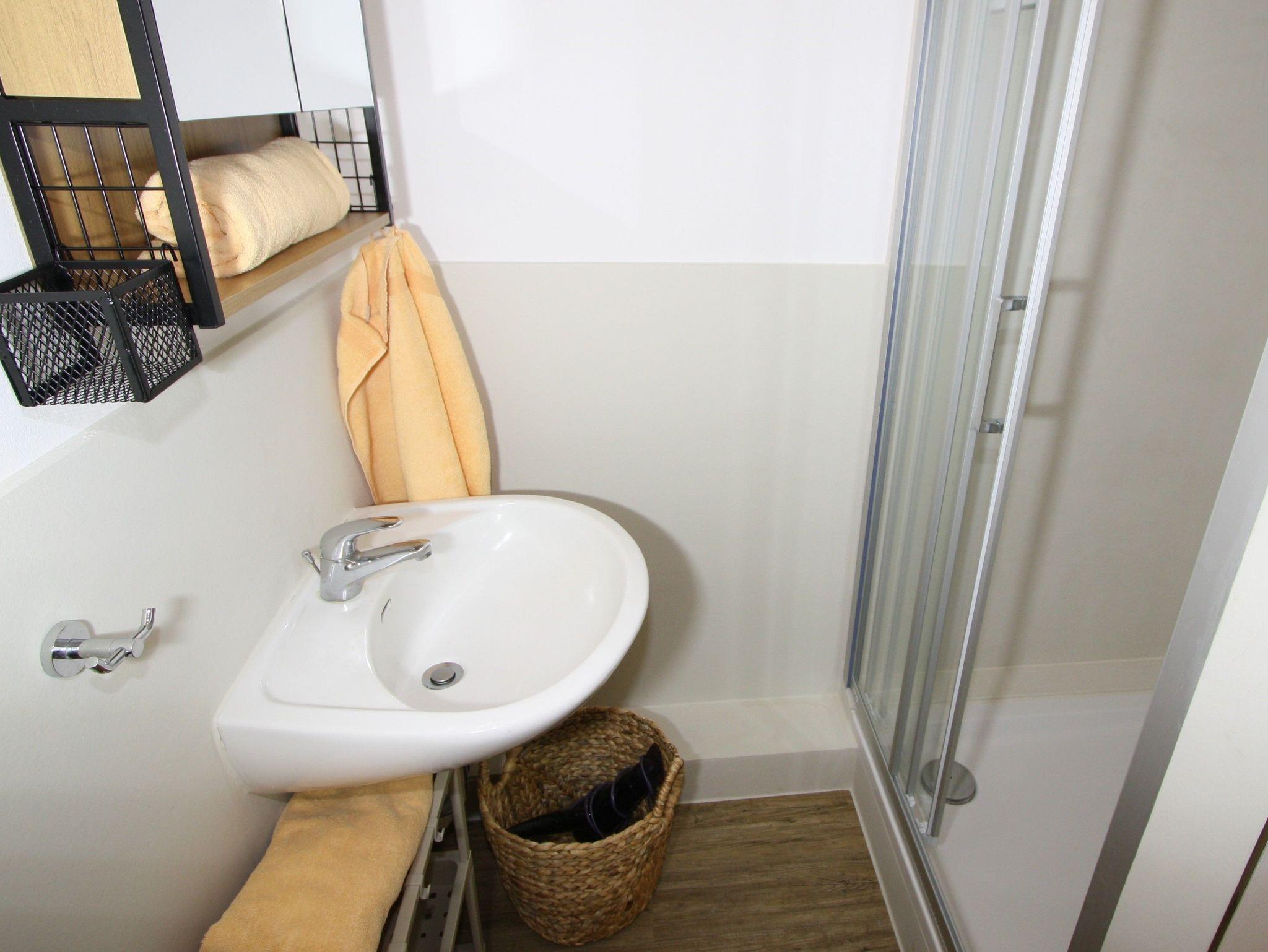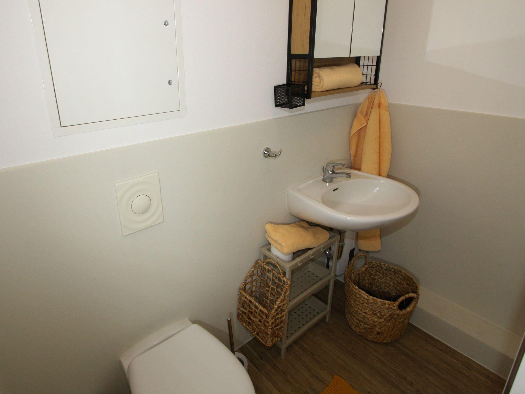 Das Badezimmer wurde komplett erneuert und der ehemals unpraktische Duschvorhang, wurde durch eine stilvolle Glastür ersetzt. Wände und Fußböden wurden erneuert und erstrahlen in einem warmen Ton.