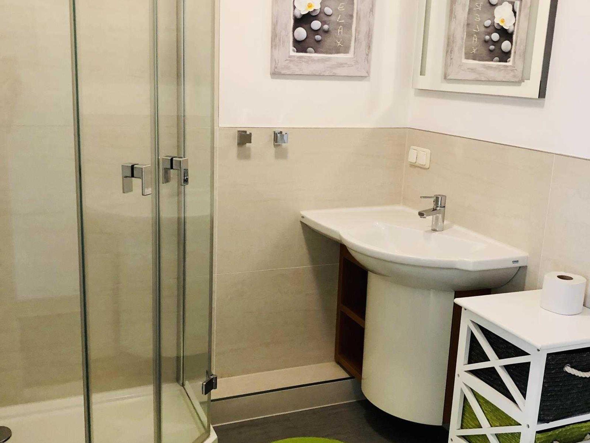 Im Bad sorgen hochwertige italienische Wand- und Bodenfliesen, ein moderner Keramag-Eckwaschtisch,eine ansprechende Fünfeckdusche , ein Handtuchwärmer und eine kuschelige Fußmatte für Ihr Wohlgefühl.