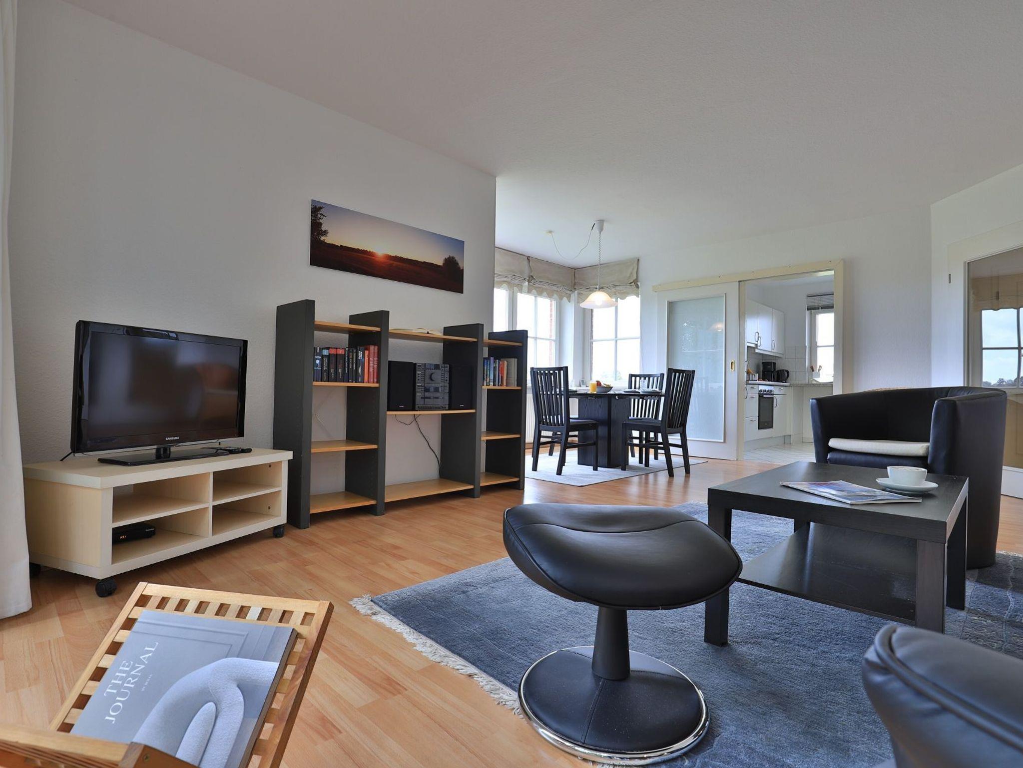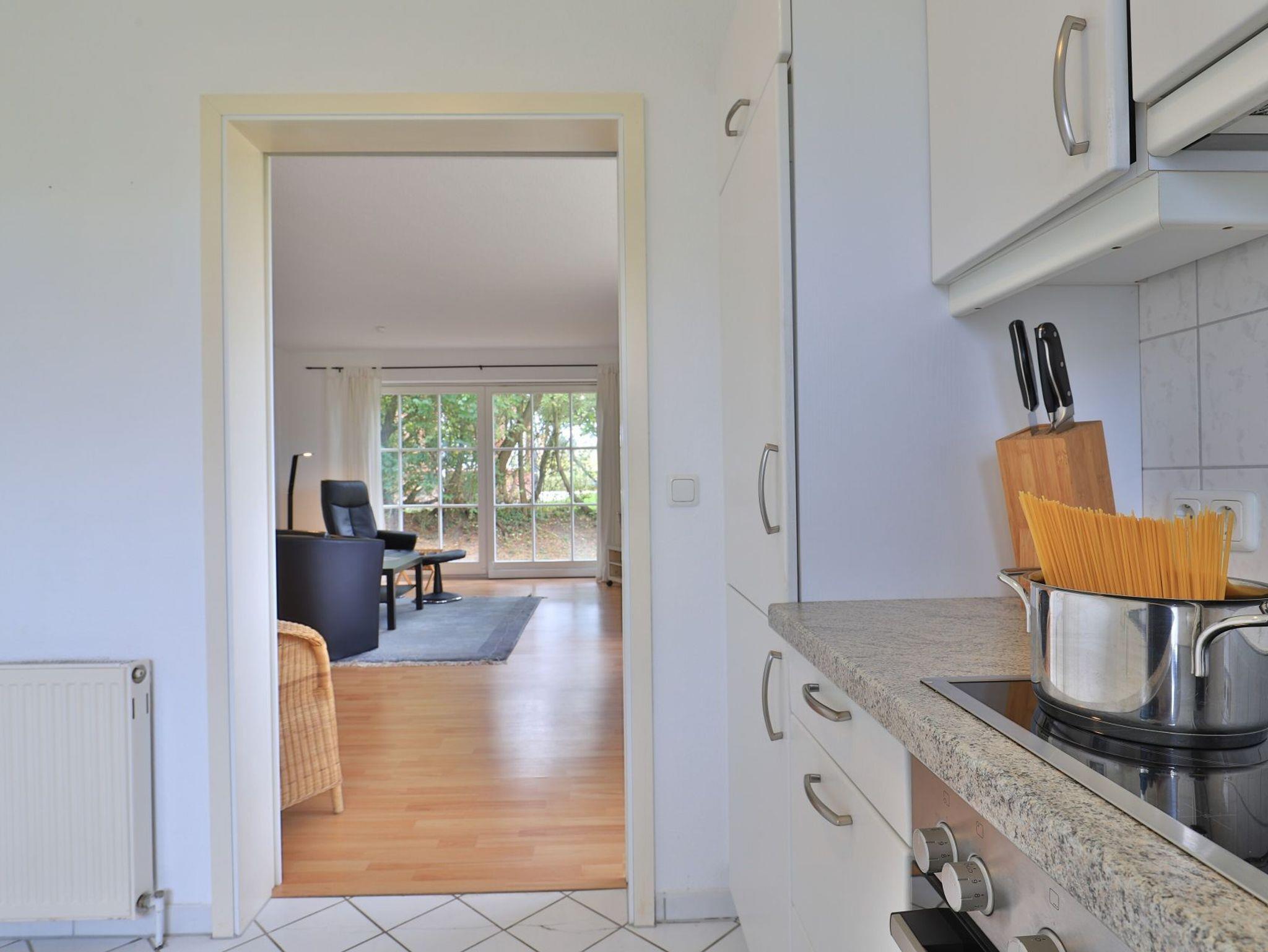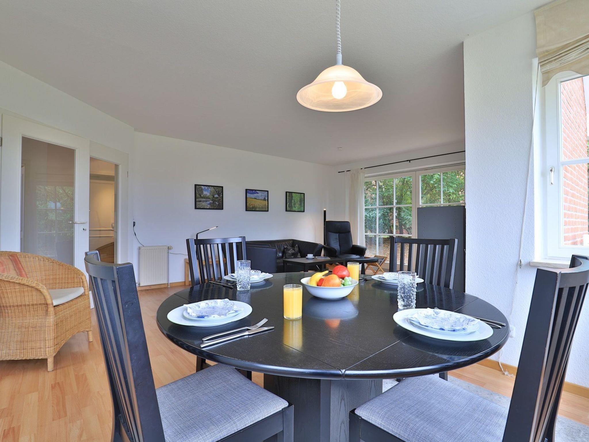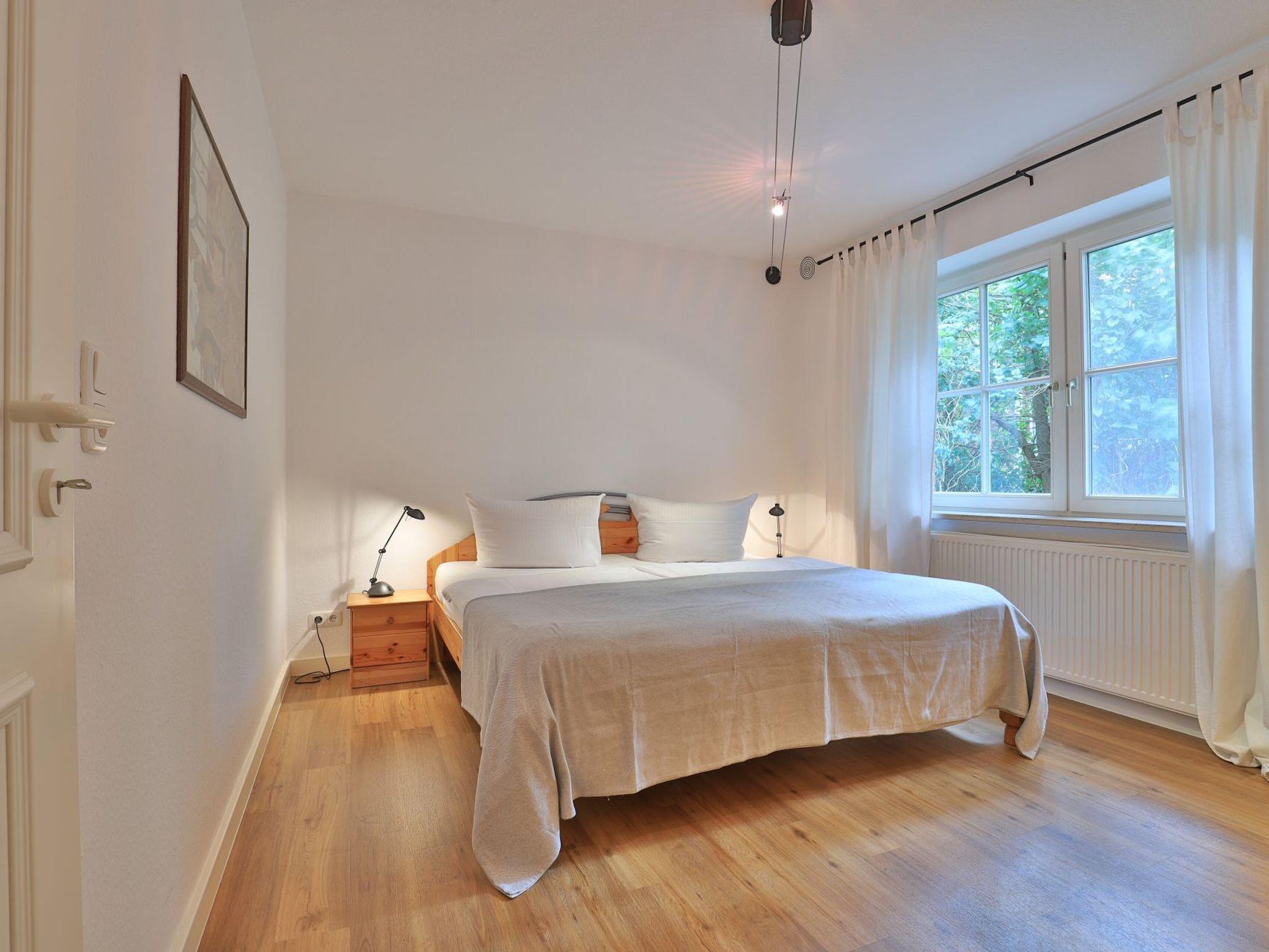 Das gut ausgestattete Erdgeschosswohnung bietet eine Wohnfläche von ca. 74qm und kann mit bis zu 4 Personen belegt werden. Durch bodentiefe Fenstertüren gleitet angenehmes Tageslicht in den Wohn und Essbereich, der seine Gäste mit einem Sofa, Lehnsessel und Esstisch empfängt. Auch ein Fernseher sowie ein Radio sind vorhanden. Den Internetanschluss nutzen Sie gebührenfrei. Eine separate Küche ermöglicht die Eigenversorgung. Herd, Backofen, Dunstabzug, Kühlschrank mit integr. Gefrierfach, Kaffeemaschine, Toaster, Geschirrspüler usw. sind vorhanden. Eine saisonal möblierte Terrasse in Süd-West Ausrichtung lädt zum Entspannen ein. Erholsame Nächte ermöglichen zwei separate Schlafzimmer, jeweils mit Doppelbett und Kleiderschrank.