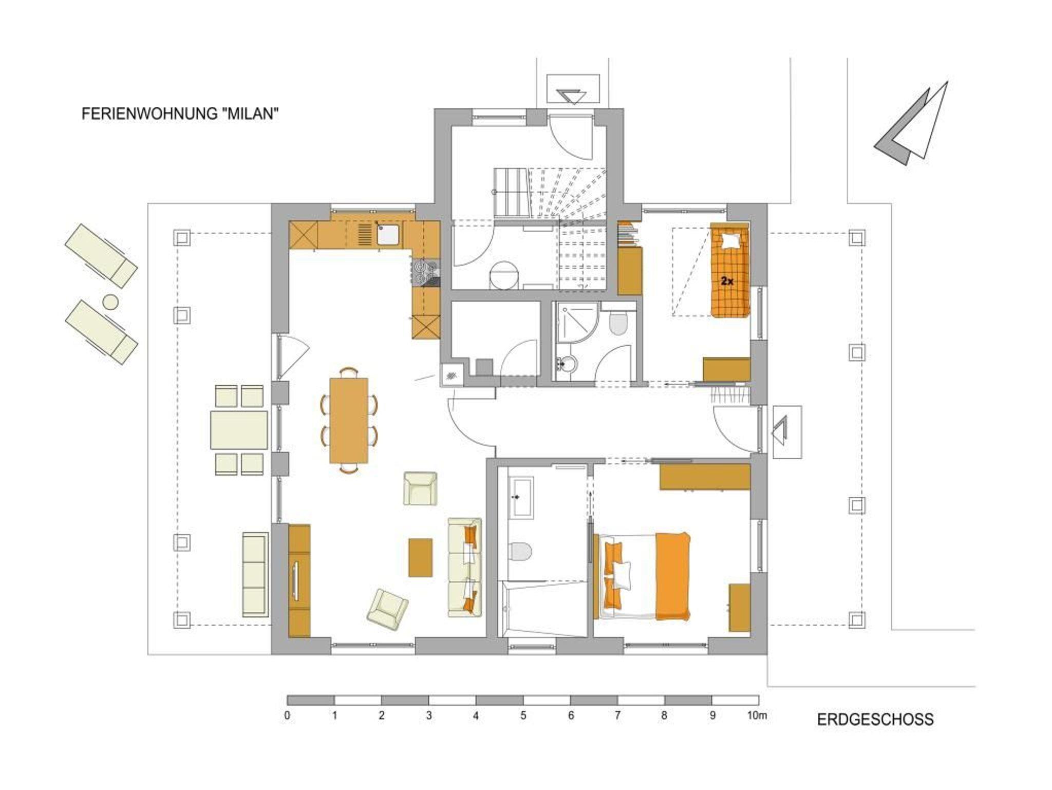Die barrierefreien und rollstuhlgerechte 3-Zimmer Ferienwohnung Milan ist eine 100qm große Erdgeschosswohnung mit Terrasse und Gartennutzung. Eine Belegung ist mit max. 6 Personen möglich.