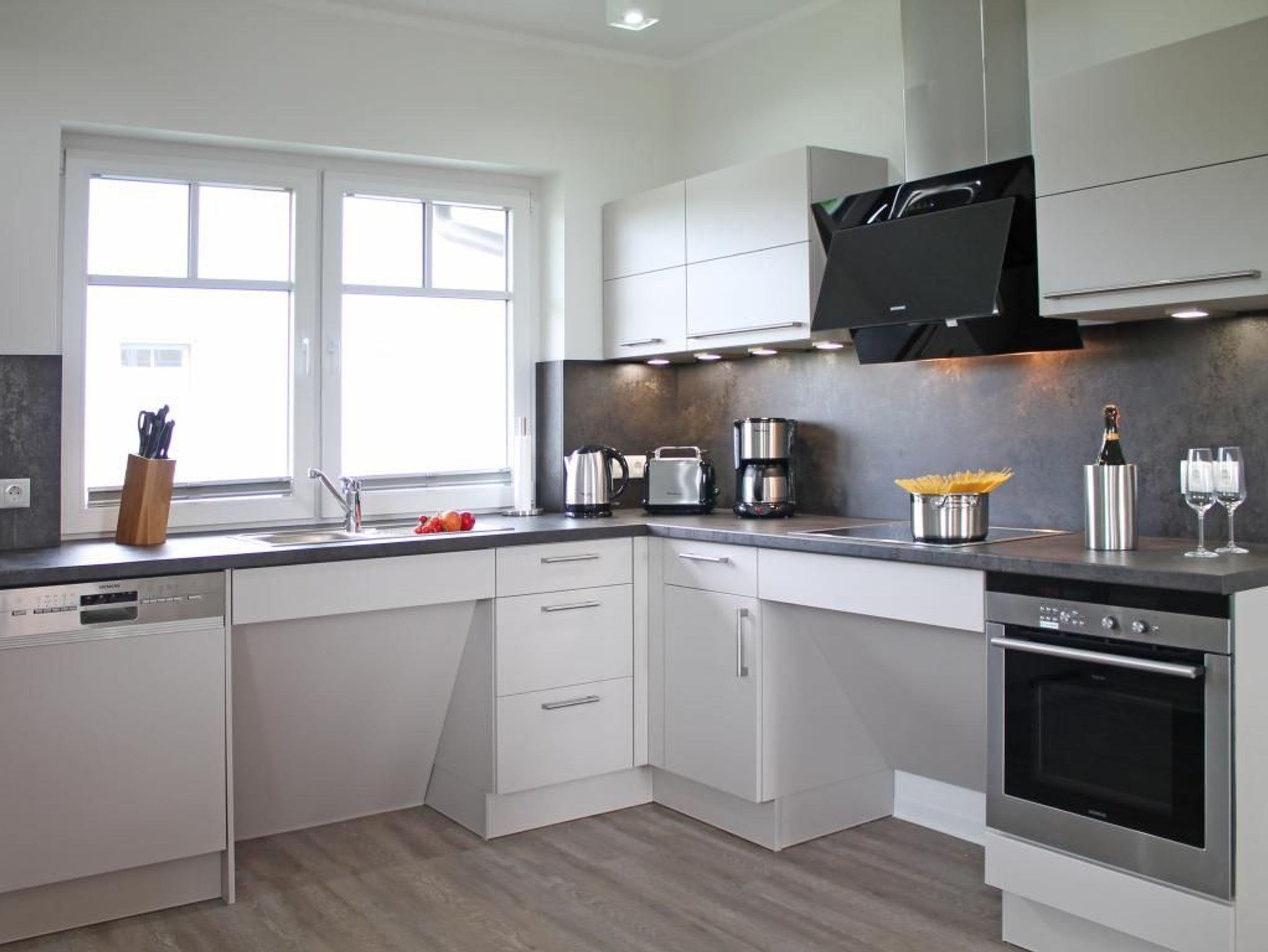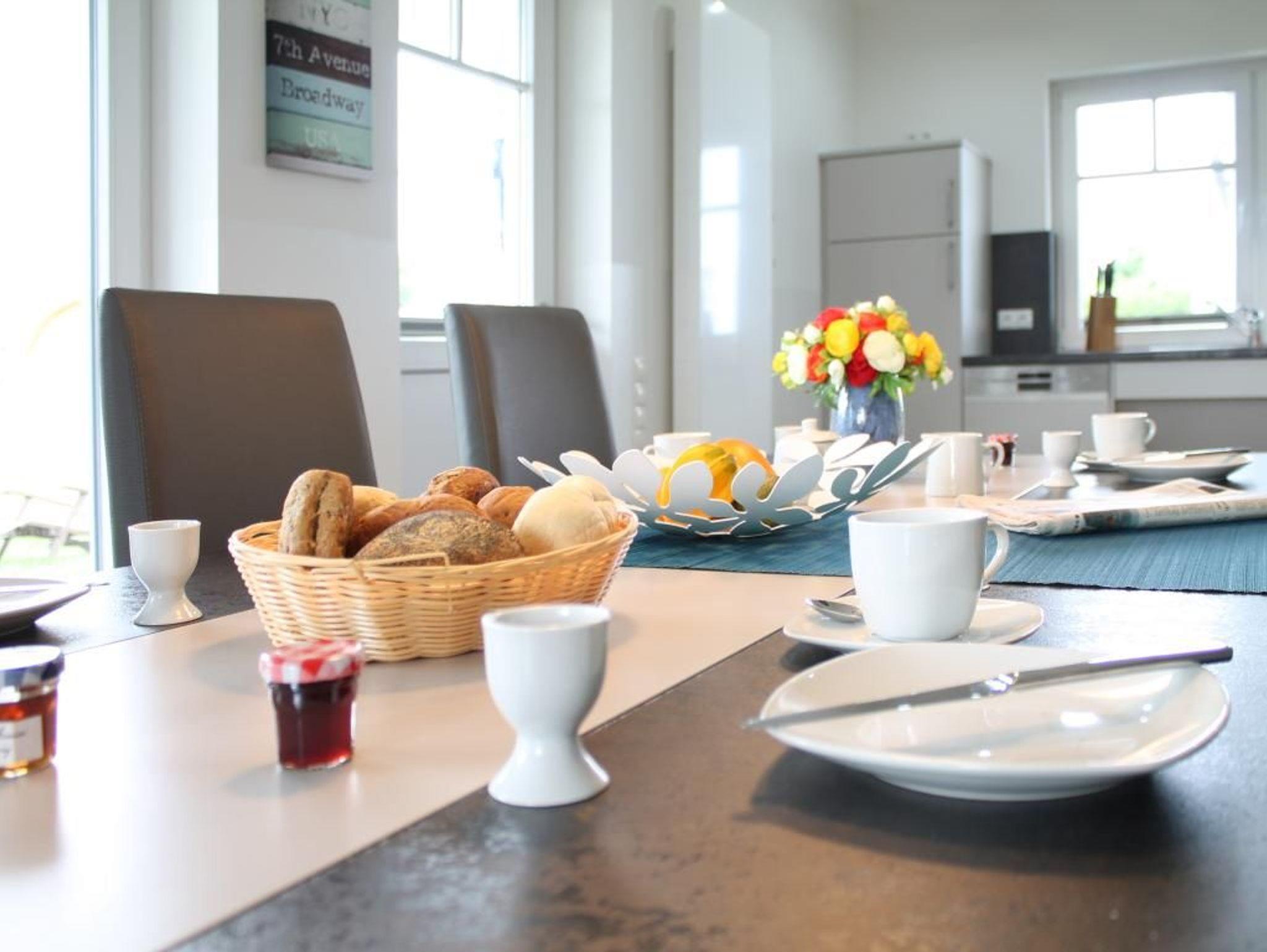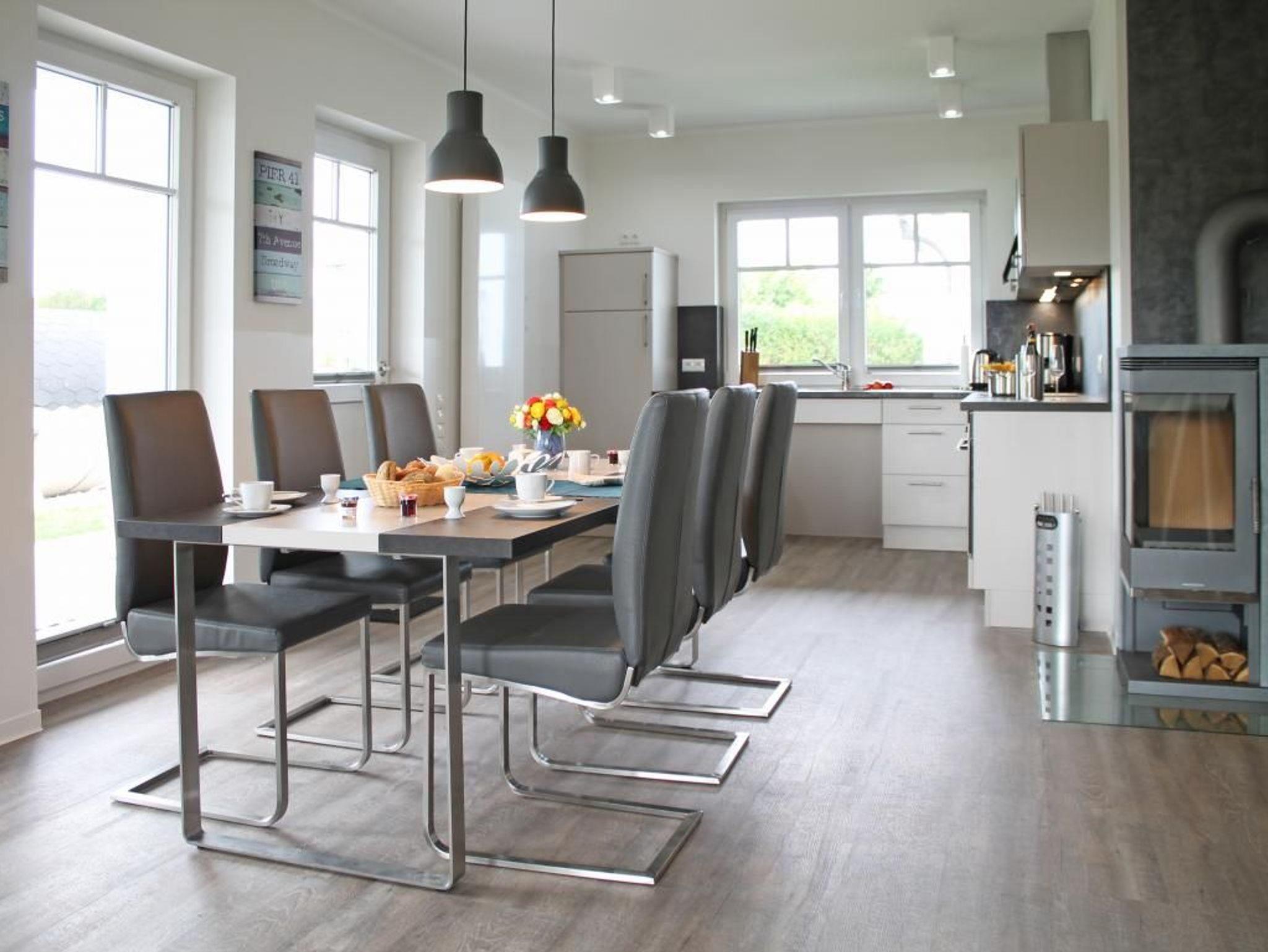 Technische Unterhaltung bieten ein Fernseher, Musikanlag, WLAN gebührenfrei. Besondere Behaglichkeit schenkt ein Kaminofen. Die offene Wohnküche ist bestens ausgestattet mit: Herd Backofen mit Mikrowellenfunktion, Dunstabzug, Kühlschrank mit Gefrierfach, Geschirrspüler, Wasserkocher, Toaster, Kaffeemaschine usw. Am großen Esstisch können Sie Ihre Mahlzeiten zu sich nehmen. Während der wärmeren Jahreszeit können Sie die großzügige, saisonal möblierte Süd-West Terrasse mit angrenzendem Rasengrundstück genießen. Die hauseigene Garten-Fasssauna steht allen Hausgästen gegen Gebühr zur Verfügung. Das Domizil verfügt über zwei separate Schlafzimmer. Eines mit Doppelbett, Kleiderschrank, Fernseher und zudem mit einem eigenen Tageslichtduschbad mit ebenerdiger Dusche, Waschtisch, WC. Im zweiten Schlafzimmer befindet sich ein ausziehbares Einzelbett, Kleiderschrank, Kommode, Fernseher. Ein zweites Duschbad, Waschtisch, WC, ist ebenfalls vorhanden.