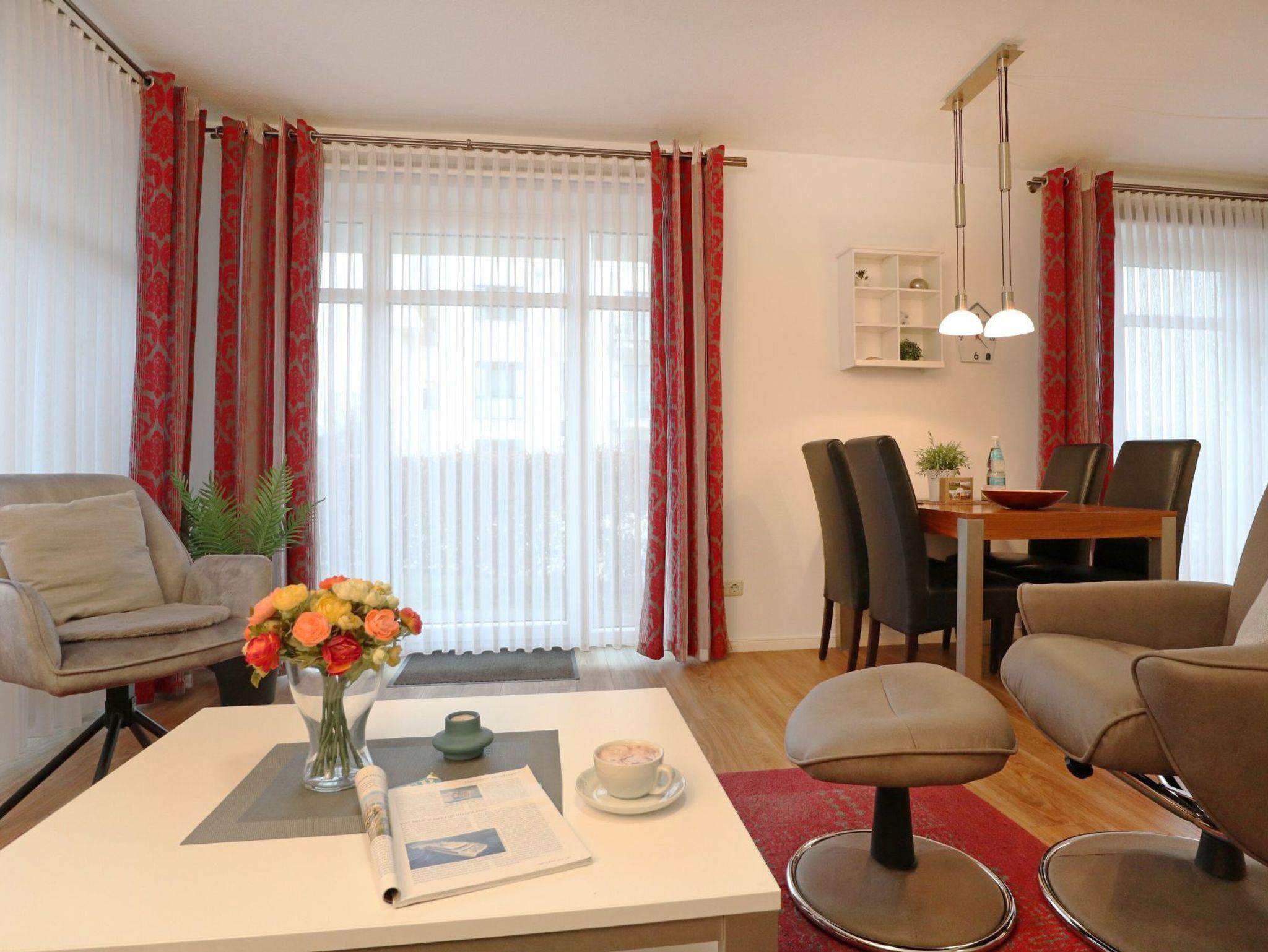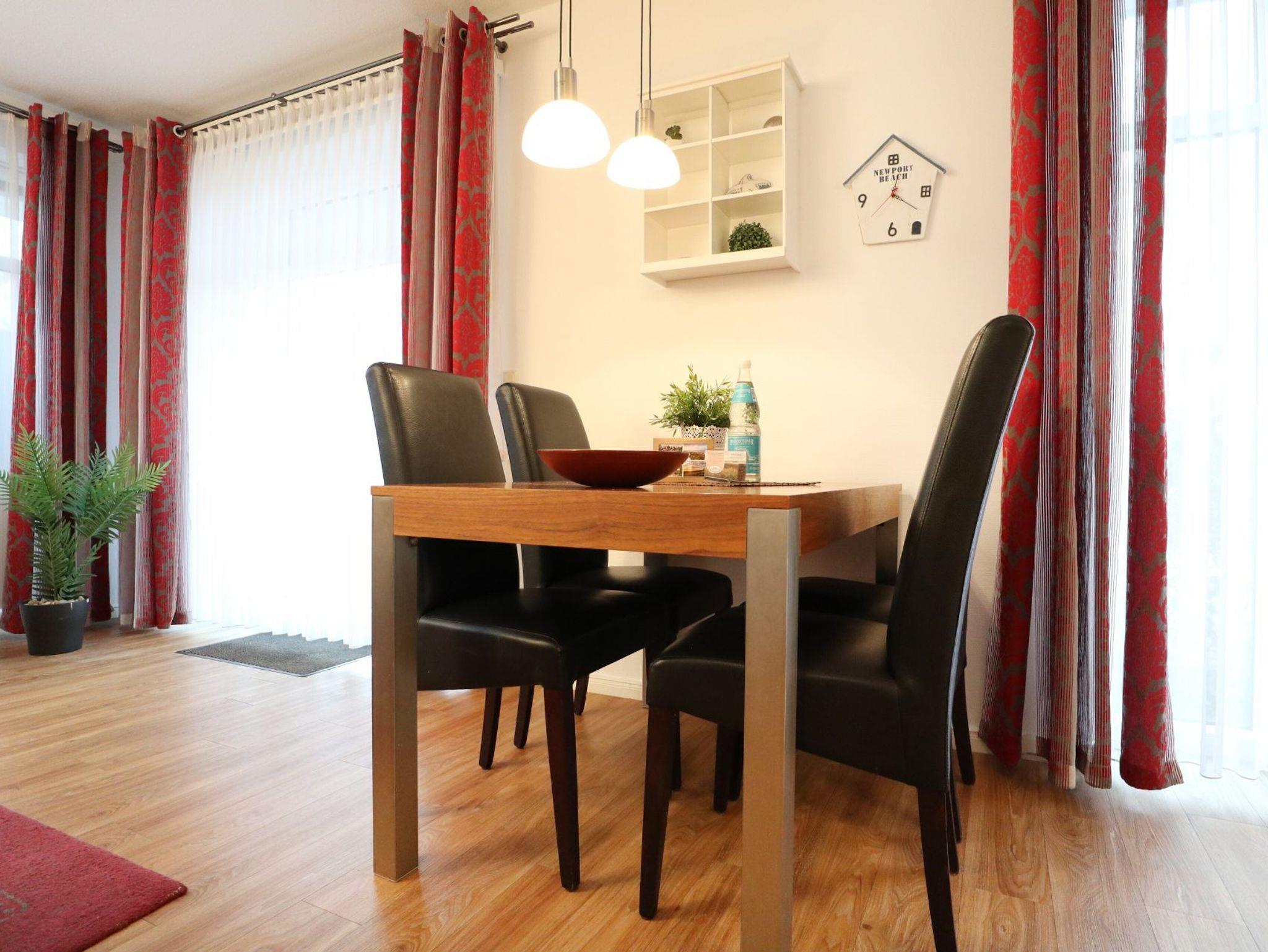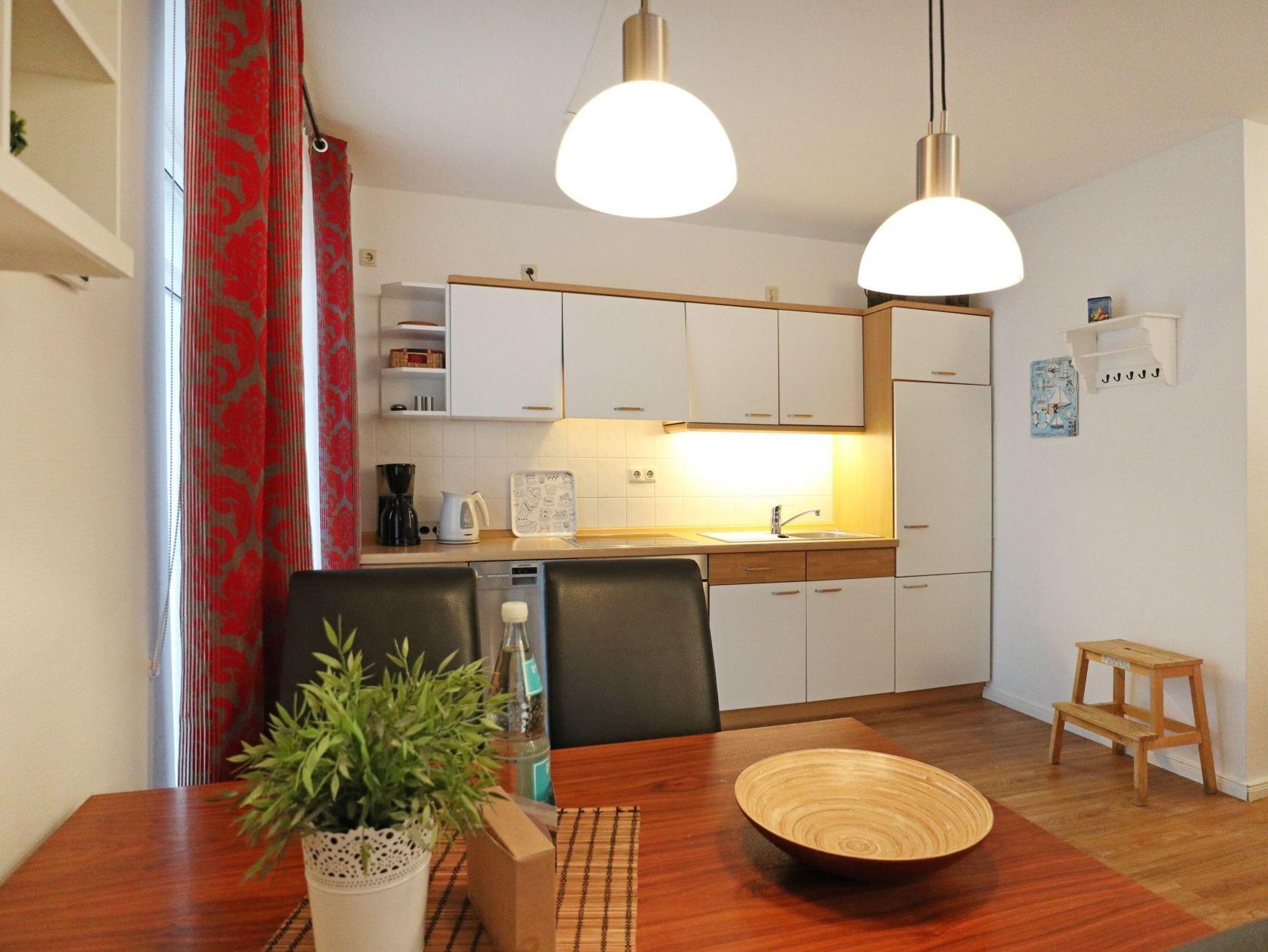 Das 2-Zimmer-Ferienappartement Haffblick 56 liegt im Erdgeschoss des Hauses und verfügt über eine Nord-/Ost Terrasse mit Grillmöglichkeit. Die Wohnfläche umfasst 49qm und eine Belegung ist mit bis zu 4 Personen möglich. Es empfängt Sie eine liebevoll möblierter Wohn-/Essbereich mit einem ausziehbaren Sofa, welches zwei weitere Schlafgelegenheiten bietet. Für gemeinsame Mahlzeiten ist ein Esstisch vorhanden. In der offenen Wohnküche können Sie bequem Ihre Urlaubsmahlzeiten zubereiten und sich somit bei Bedarf selbst versorgen. Ceranfeldherd, Backofen, Mikrowelle, Dunstabzugshaube gehören ebenso zur Ausstattung, wie Wasserkocher, Toaster, Kaffeemaschine und Geschirrspüler. Technische Unterhaltungselektronik bieten ein Fernseher mit Sky- Programmen, DVD-Player, eine Musikanlage sowie der gebührenfreie Internetzugang über WLAN. Geruhsame Nächte verbringen Sie in dem separaten Schlafzimmer mit großem Boxspringbett (180 x 200 cm) und Kleiderschrank. Zugehörig ist ein innenliegendes Duschbad mit Waschtisch und WC. Allen Hausgästen stehen Waschmaschine und Wäschetrockner zur gemeinschaftlichen Nutzung gegen Gebühr zur Verfügung. Für Ihren PKW ist ein kostenfreier Außenstellplatz am Haus reserviert. Fahrradunterstellmöglichkeiten sind ebenfalls vorhanden. Bitte beachten Sie, dass in der Wohnung nicht geraucht werden darf und auch Haustiere nicht gestattet sind. Sie wohnen nur 200 Meter zum feinsandigen Strand mit guten Bademöglichkeiten.