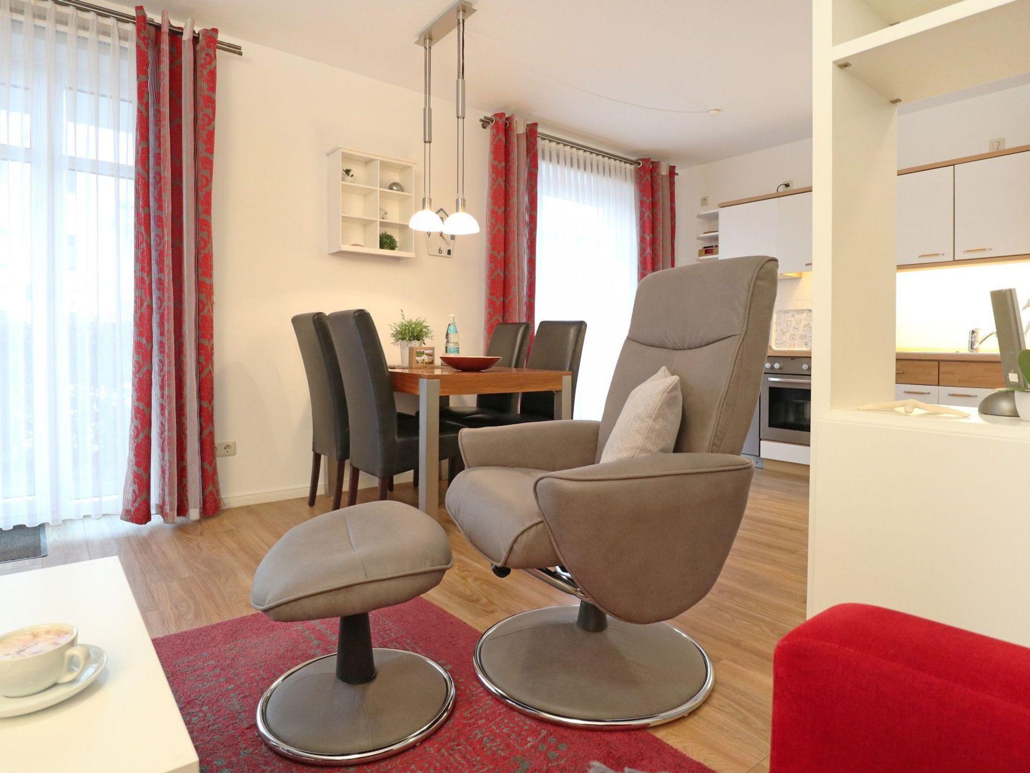 Die Residenz Haffblick ist eine zentral, dennoch ruhig gelegene Appartementanlage bestehend aus vier Häusern mit jeweils 17 Wohneinheiten. In nur 200 Meter befindet sich der Ostseestrand. Das Ortszentrum ist in wenigen Schritten erreicht. Die beliebte Ferienanlage liegt gleichzeitig nah zum Naturschutzgebiet an den Haffwiesen auch nah dem Tarnewitzer Urwald. Ganzjährig bietet der hauseigene Wellnessbereich Sauna, sowie Infrarot Wärmekabinen gegen Gebühr. Ein Fitnessraum steht kostenfrei zur Verfügung. Ebenfalls kostenlos sind WLAN sowie Sky Programme Fußball Bundesliga -Sport- Cinema- Disney. Jeder der Wohneinheiten ist individuell ausgestattet, komfortabel möbliert und verfügt über Terrasse oder Balkon, teilweise zwei Balkone. Zudem gibt es auf dem Grundstück Pavillons mit Blick auf die Pferdewiesen. In jedem der Häuser befinden sich Waschmaschine und Wäschetrockner mit Münzeinwurf. Zugehörig ist ein PKW -Außenstellplatz pro Ferienwohnung. Teilweise sind Haustiere gestattet. Gäste der Residenz Haffblick verbringen einen entspannten Aufenthalt und genießen gleichzeitig die nahe Lage zu vielen Annehmlichkeiten des Ostseebades. Restaurants sowie Cafe´s und Geschäfte sind in Kürze erreicht. Die hier beschriebene 2-Zimmer-Erdgeschoss-Wohnung Haffblick 52 mit Strandkorb auf der Terrasse, bietet eine Wohnfläche von 50qm und ist für eine Belegung mit maximal 4 Personen gut geeignet. Die schicke Einrichtung lädt zum Entspannen ein. Ein separates Schlafzimmer mit Doppelbett, sowie zwei weitere Schlafgelegenheiten im Wohnraum sind vorhanden. Zugehörig ist ein modernes Duschbad. Es handelt sich um eine Wohneinheit für Nichtraucher. Haustiere sind herzlich willkommen.