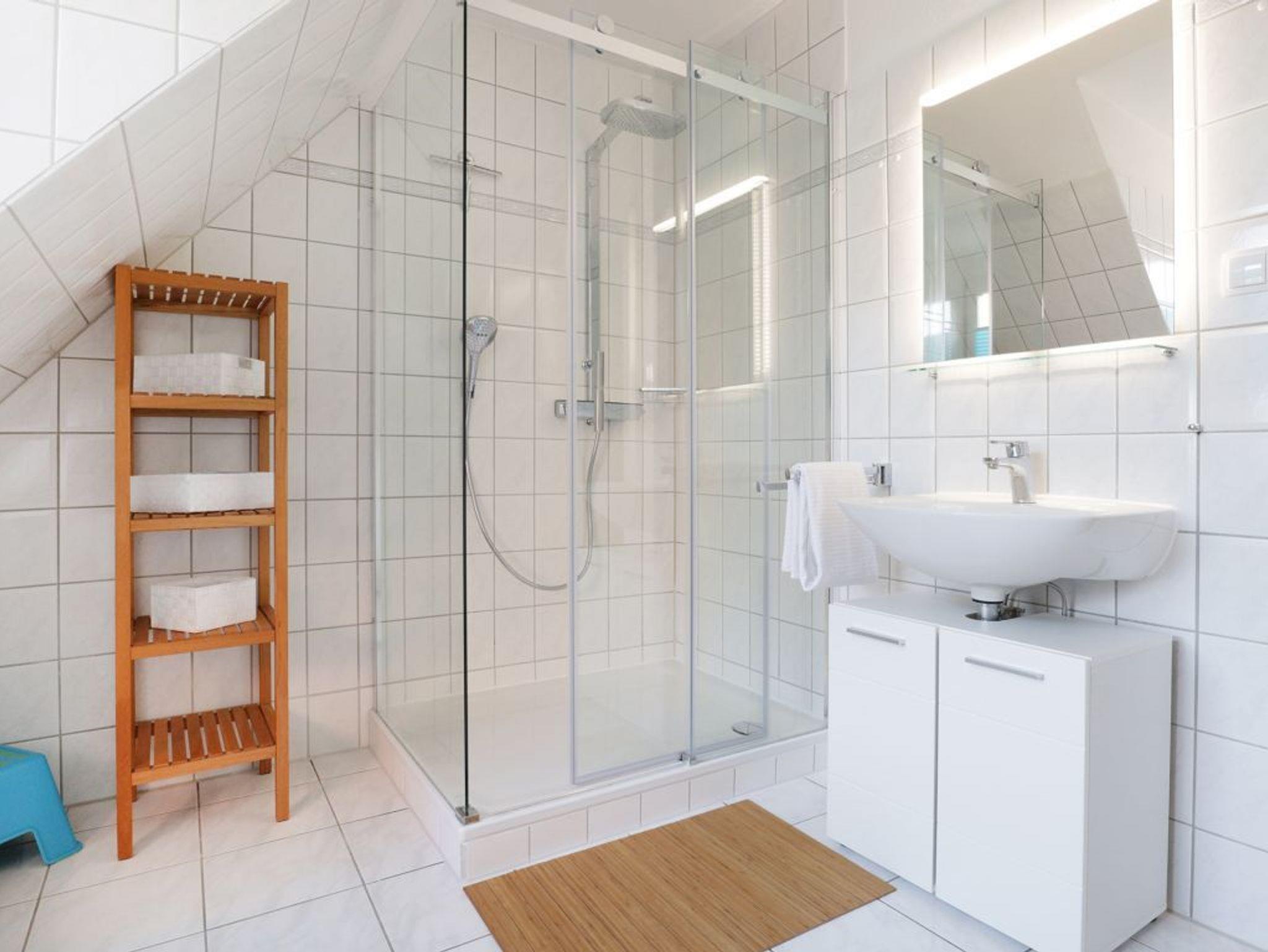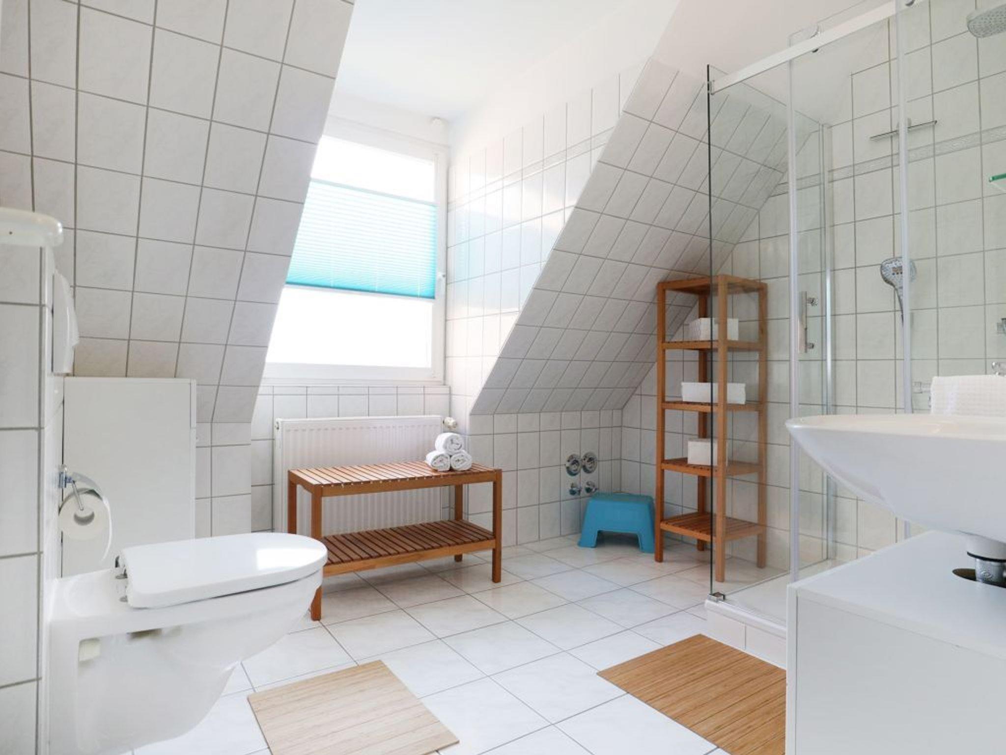 Das Ferienappartement besitzt 2 Schlafzimmer 1x mit Doppelbett, Kleiderschrank, Fernseher und 1x über eine Treppe erreichbar ein weiteres Schlafzimmer mit Doppelbett, Kommoden zudem eine Couch. Der obere Treppenteil ist mit einem ausziehbaren Treppenschutz versehen. Kinderspielzeug ist vorhanden. Des Weiteren ist auf der unteren Wohnebene ein geräumiges Badezimmer mit Tageslichtfenster und Regendusche mit Massagefunktion.