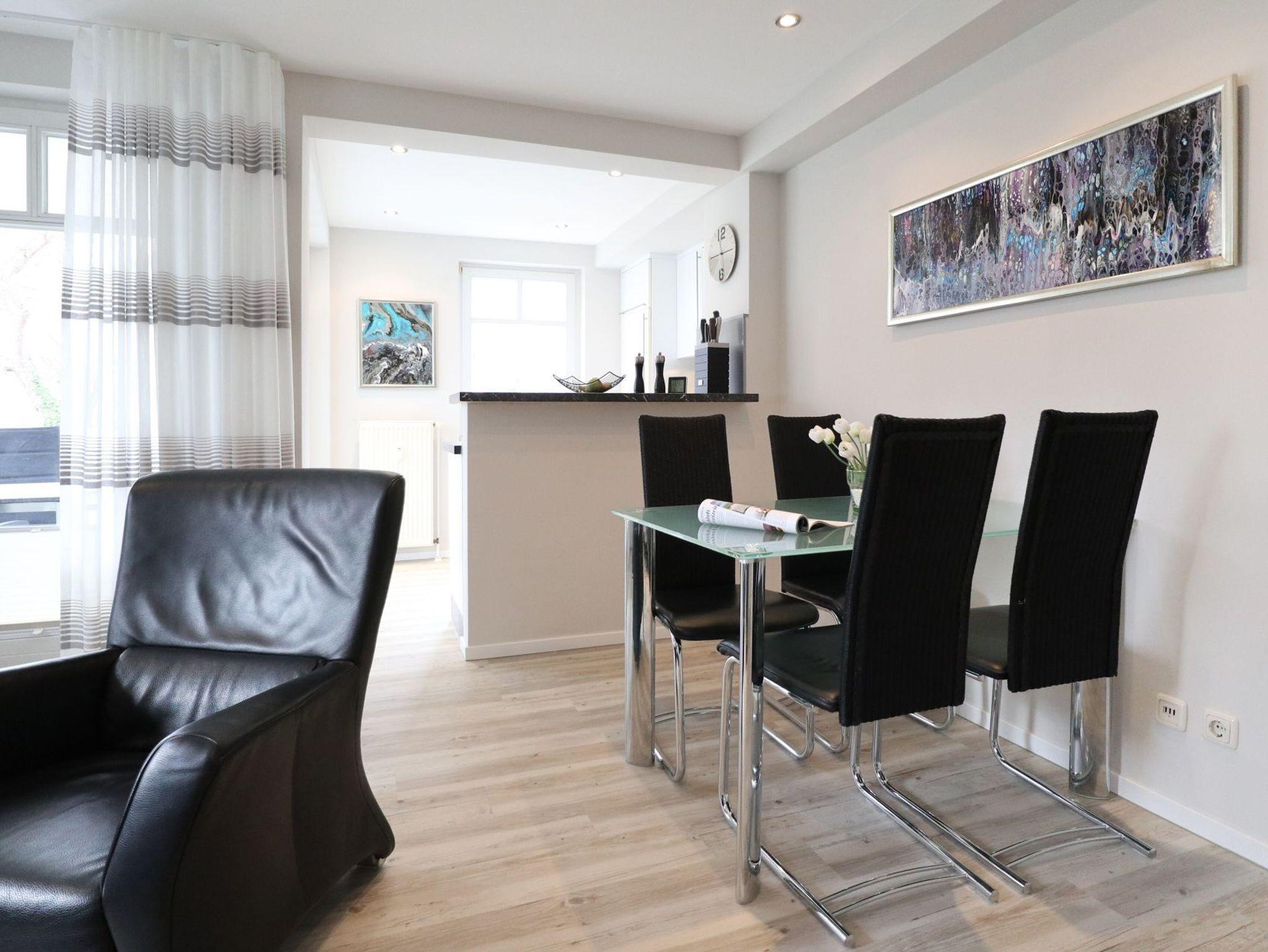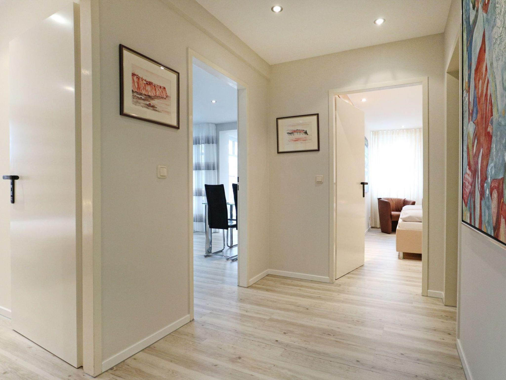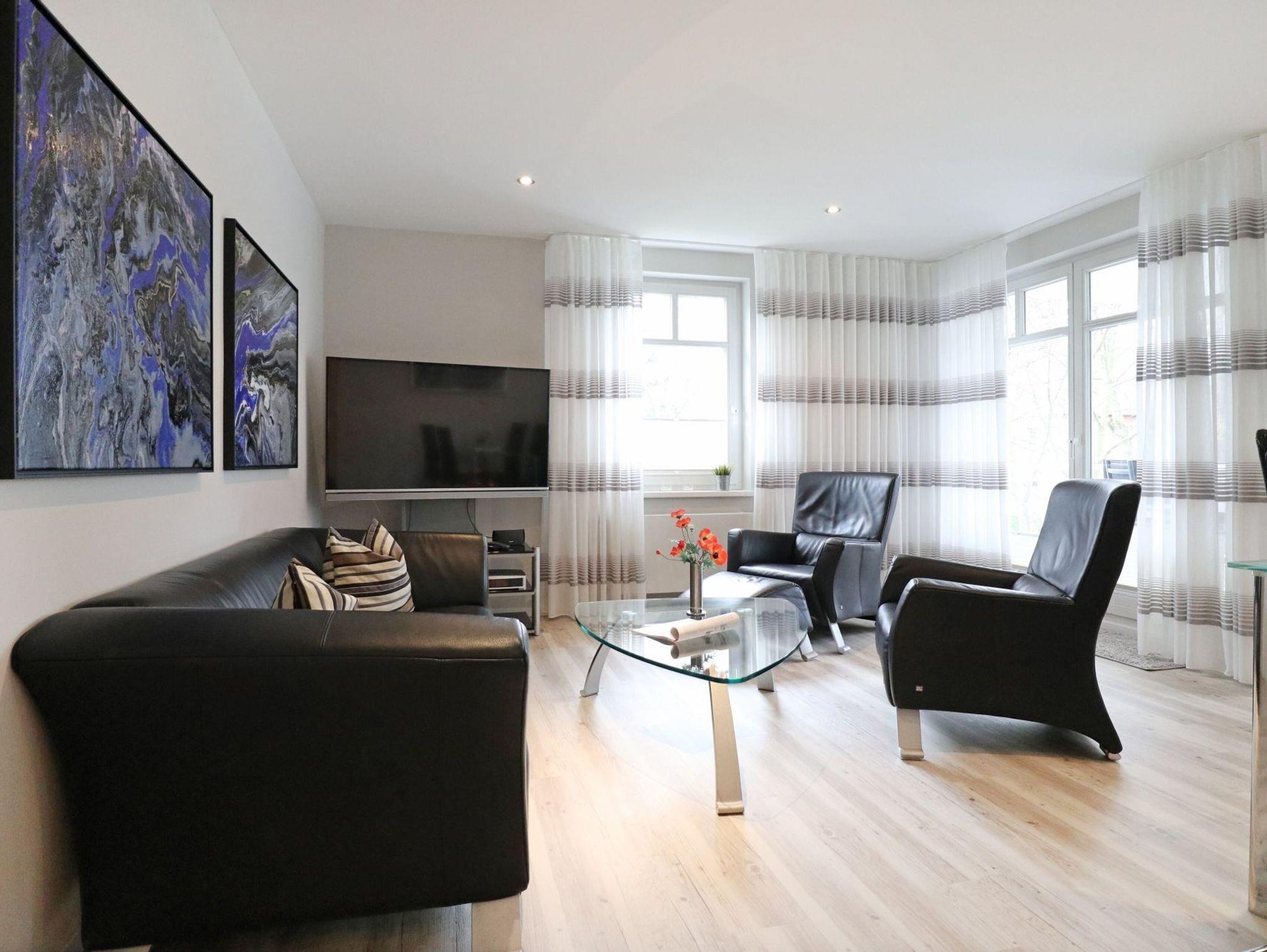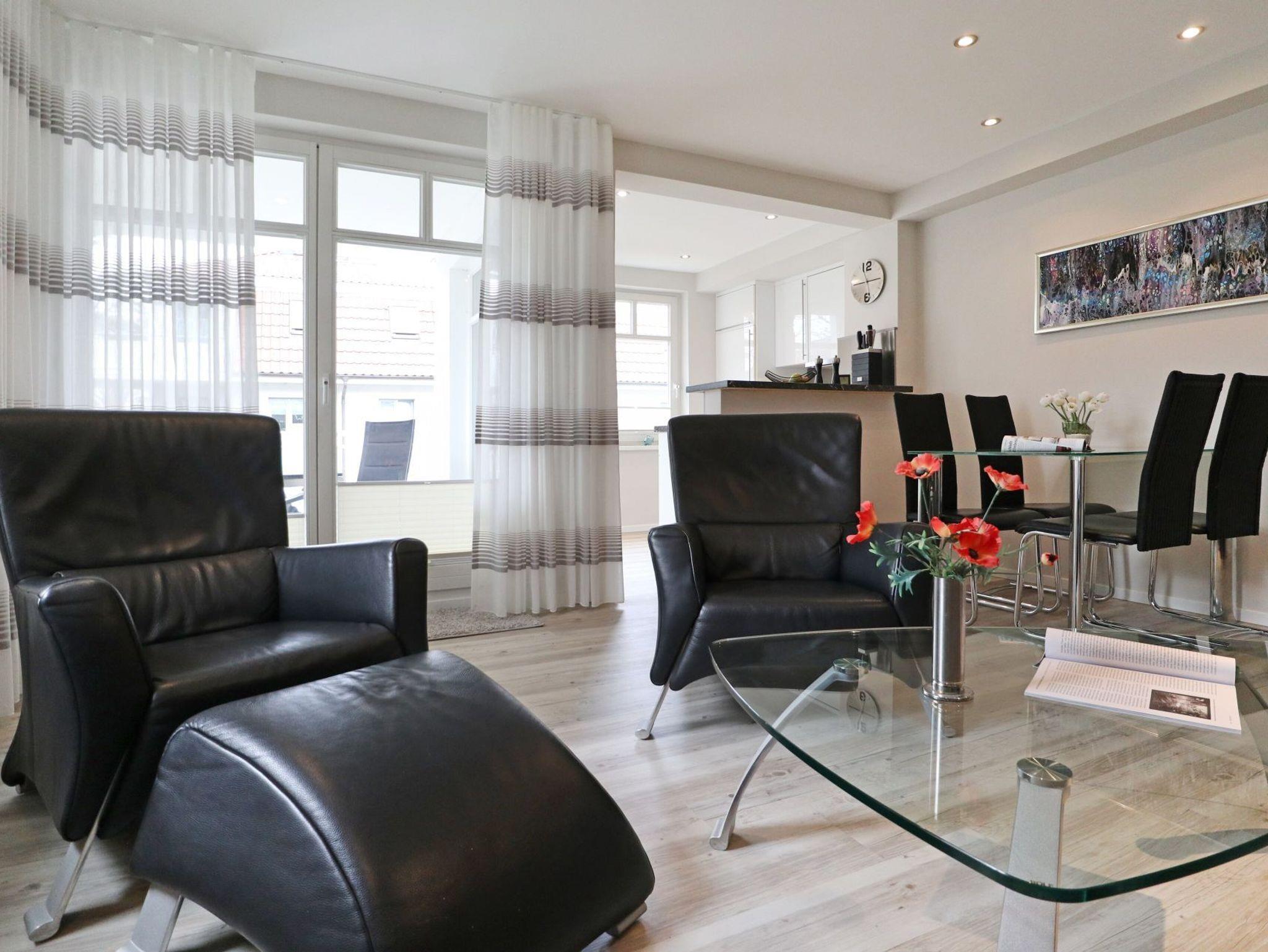 Die behagliche, komfortabel eingerichtete 2-Zimmer-Ferienwohnung befindet sich im 1. Obergeschoss und bietet auf 67qm Wohnfläche Platz für bis zu 4 Personen. Der gemütliche Wohn-/Essbereich ist mit zwei komfortablen Sofas, einem Relax-Sessel und einem großen Esstisch ausgestattet. Unterhaltung bieten ein Fernseher, DVD-Player, Videorecorder und eine Musikanlage. Den Internetzugang über WLAN nutzen Sie ohne Gebühr. Die separate Küche ist ideal für die Selbstversorgung und verfügt über Herd, Backofen, Kühlschrank mit Gefrierfach, Geschirrspüler sowie Toaster, Wasserkocher und Kaffeemaschine. Genießen Sie Ihre Mahlzeiten im Essbereich oder auf dem sonnigen, saisonal möblierten Balkon. Das geräumige Schlafzimmer bietet ein Doppelbett und einen Kleiderschrank, während das modernisierte Duschbad mit Waschtisch und WC ausgestattet ist. Eine Waschmaschine steht kostenfrei zur Verfügung, und Ihr PKW kann in der hauseigenen Tiefgarage geparkt werden, von wo aus Sie mit dem Fahrstuhl direkt zur Wohnungsetage gelangen.
