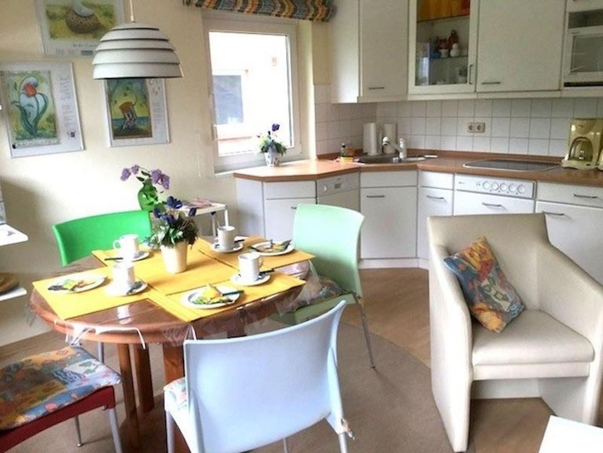 Vom Wohnzimmer gehen Sie direkt auf die angrenzende Terrasse. Diese ist voll möbliert mit Strandkorb, Tisch, Stühlen, Sonnenschirm sowie Sonnenliegen. Hier haben Sie einen freien Blick auf das angrenzende Grün.