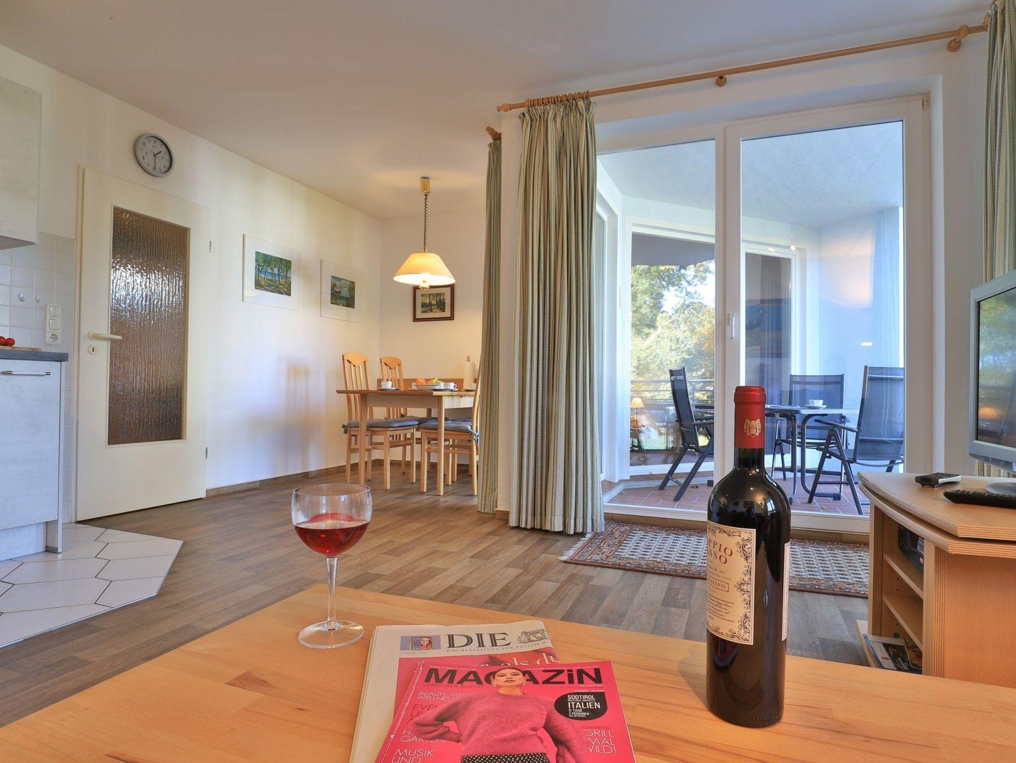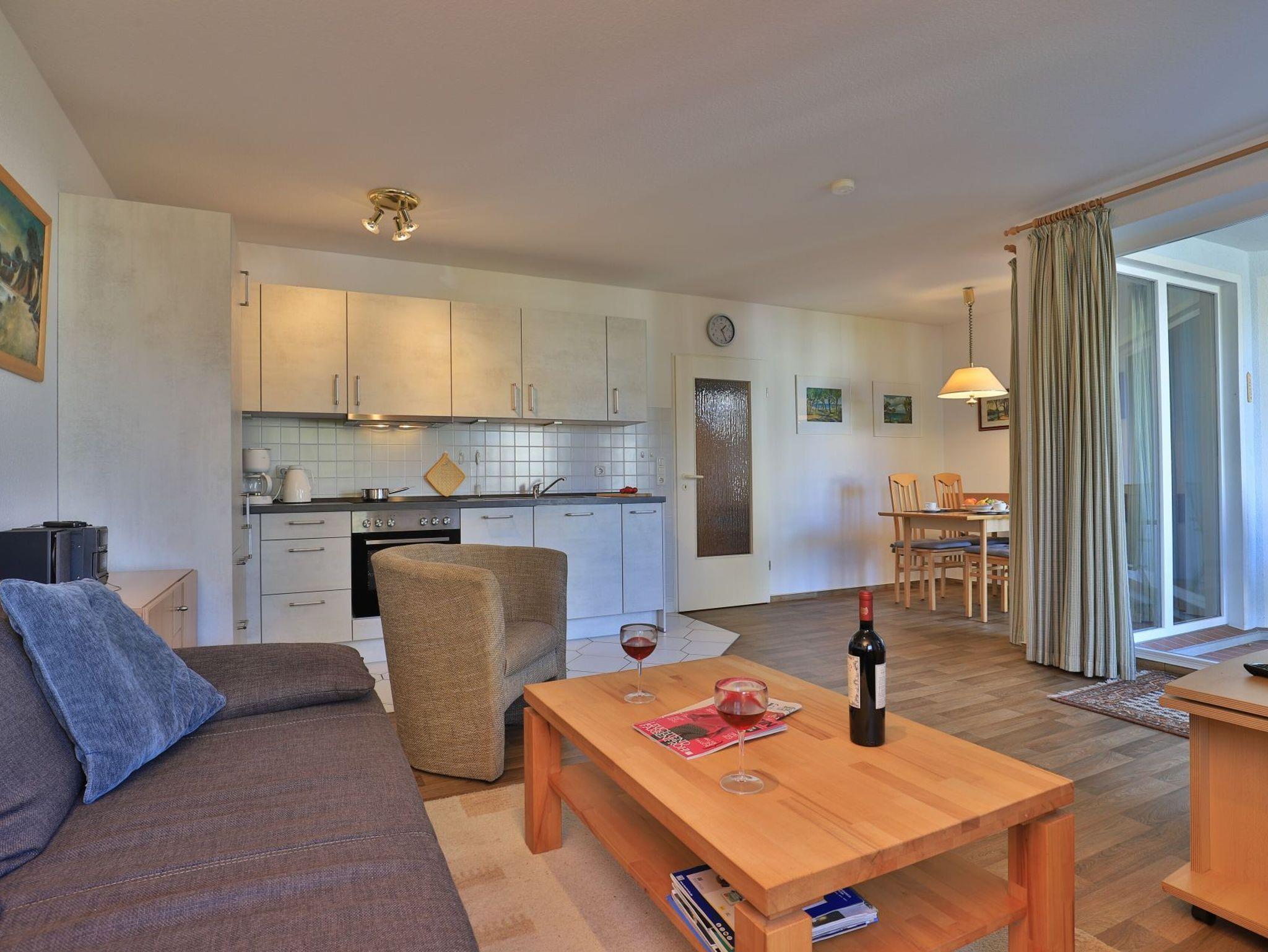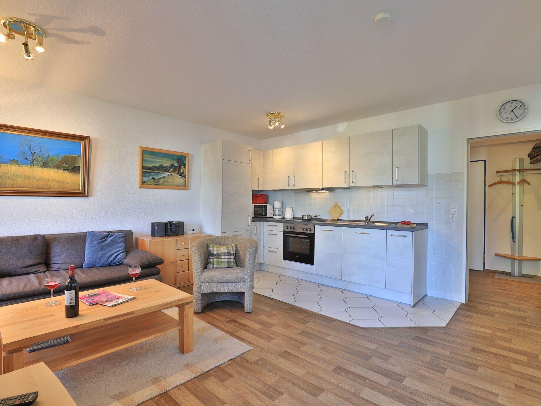 Die 2-Zimmer Ferienwohnung ?Likedeeler 24? mit Balkon, befindet sich im 1. Obergeschoss und besitzt eine großzügige Wohnfläche von 60qm. Eine Belegung mit bis zu 2 Personen möglich. Das mit drei Sternen klassifizierte Appartement ist insgesamt sehr komfortabel eingerichtet. Im Wohn-/Essbereich empfängt Sie eine bequeme Sofagarnitur ? erweiterbar als weitere Schlafgelegenheit- mit zwei Sesseln sowie ein Esstisch mit vier Sitzplätzen. Für technische Unterhaltung können Sie den Fernseher und die Musikanlage nutzen zudem steht WLAN kostenfrei bereit. Die in den Wohnbereich integrierte und bestens ausgestattete Wohnküche ist offen integriert und ermöglicht die Eigenversorgung mit: Ceranherd, Backofen, Mikrowelle, Dunstabzug, Kühlschrank mit integr. Gefrierfach, Geschirrspüler, Kaffeemaschine, Wasserkocher, Toaster usw. Ihre Speisen nehmen Sie am Esstisch zu sich, oder während der wärmeren Jahreszeit auf dem saisonal möblierten Balkon in Nord-Ost Ausrichtung. Ihre Nächte verbringen Sie in einem separaten, sehr behaglichen Schlafzimmer mit Doppelbett und großem Kleiderschrank. Idealerweise besitzt das Schlafzimmer einen zweiten Balkonzugang. Das hell geflieste Duschbad ist mit Waschtisch, Föhn, WC ausgestattet. Allen Hausgästen stehen eine Waschmaschine und Wäschetrockner gegen Gebühr im Untergeschoss der Ferienanlage zur Verfügung. Ihr Fahrzeug parken Sie in der hauseigenen Tiefgarage auf einem fest zugeordneten Stellplatz. Mit dem Fahrstuhl gelangen Sie zu den Wohnungsetagen.