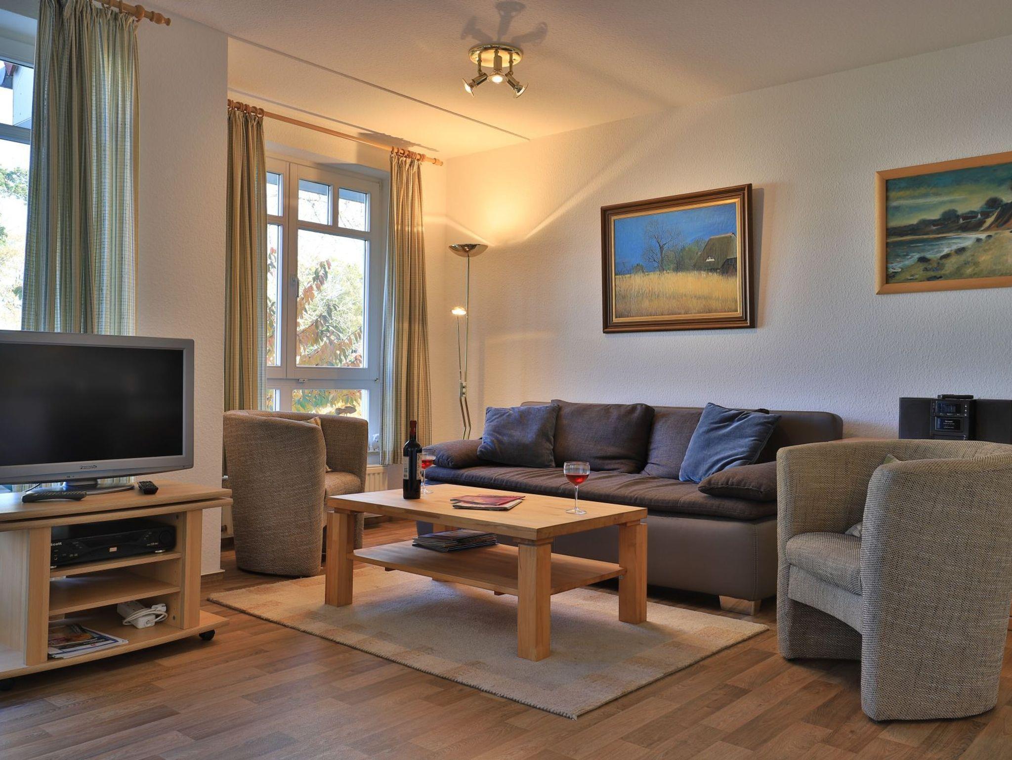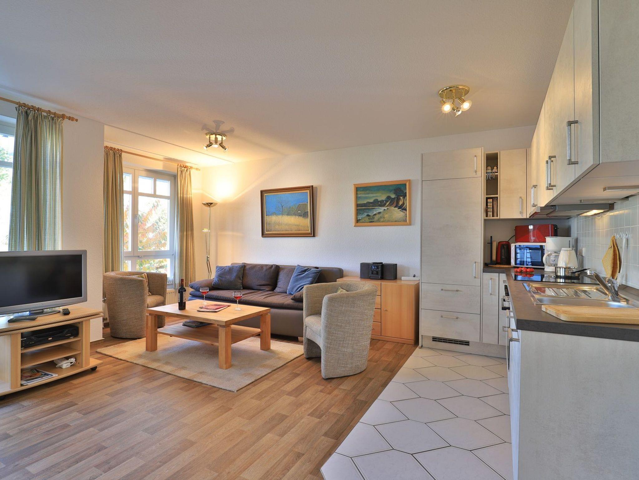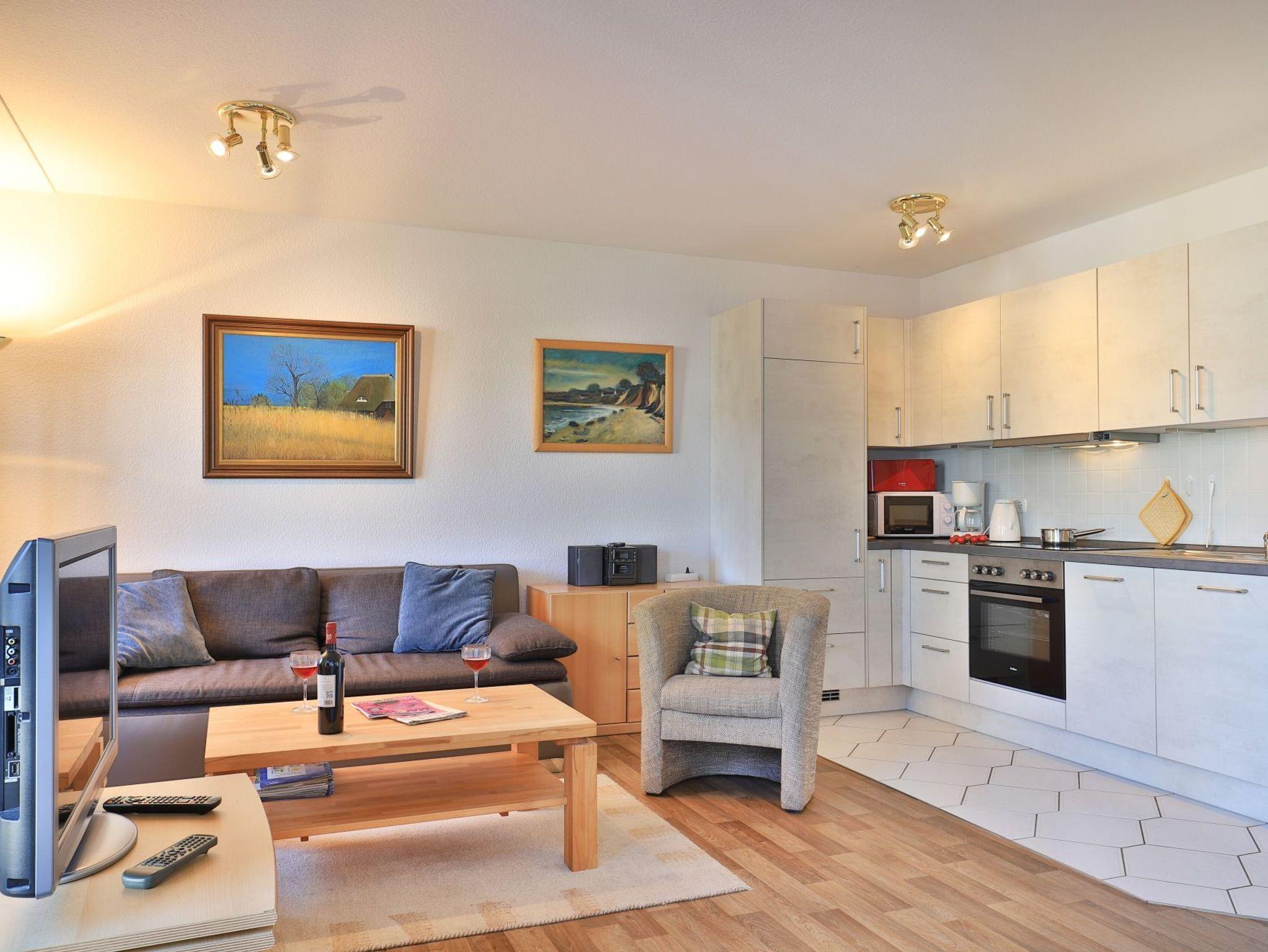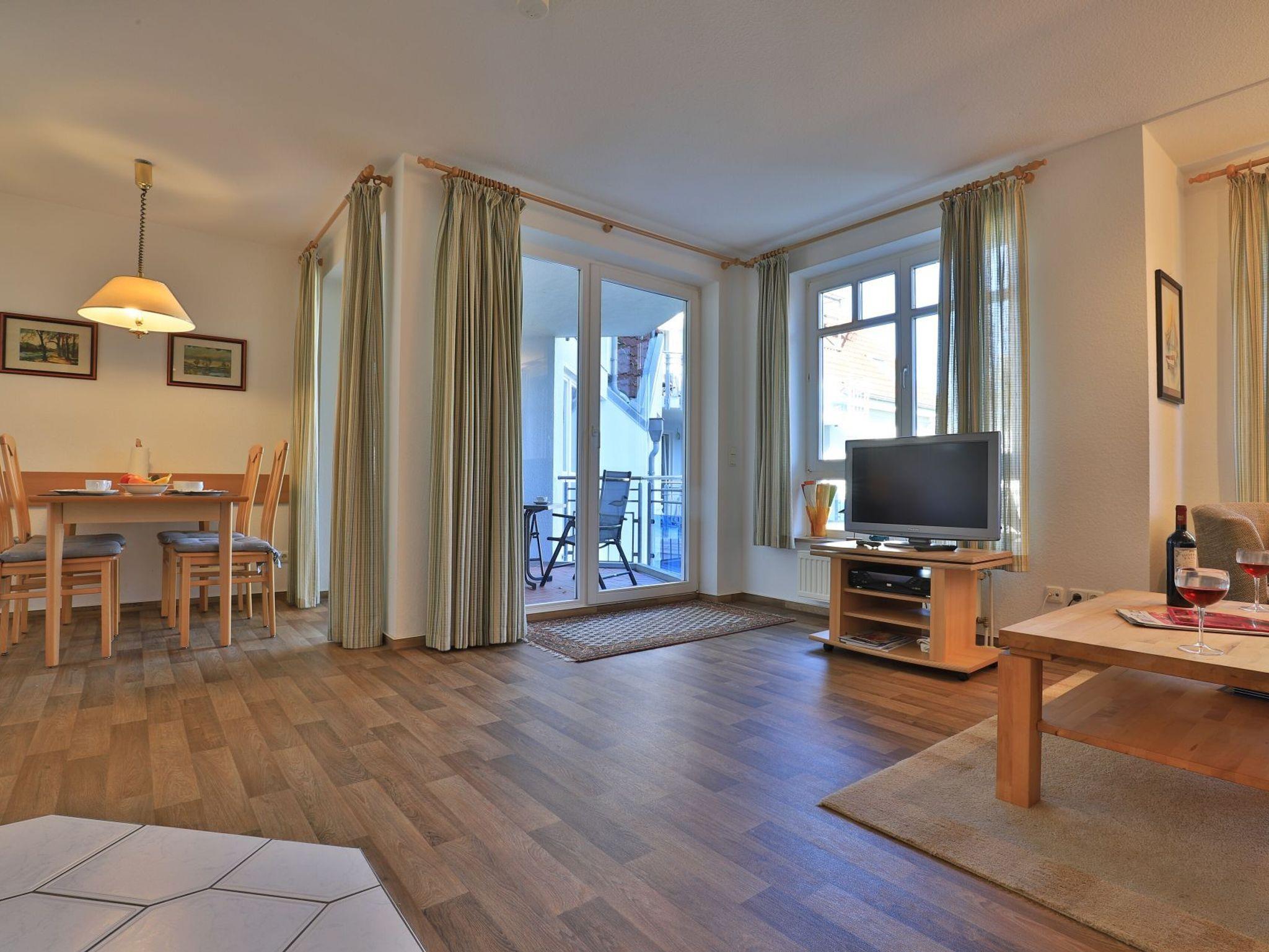 Die 2-Zimmer Ferienwohnung ?Likedeeler 24? mit Balkon, befindet sich im 1. Obergeschoss und besitzt eine großzügige Wohnfläche von 60qm. Eine Belegung mit bis zu 2 Personen möglich. Das mit drei Sternen klassifizierte Appartement ist insgesamt sehr komfortabel eingerichtet. Im Wohn-/Essbereich empfängt Sie eine bequeme Sofagarnitur ? erweiterbar als weitere Schlafgelegenheit- mit zwei Sesseln sowie ein Esstisch mit vier Sitzplätzen. Für technische Unterhaltung können Sie den Fernseher und die Musikanlage nutzen zudem steht WLAN kostenfrei bereit. Die in den Wohnbereich integrierte und bestens ausgestattete Wohnküche ist offen integriert und ermöglicht die Eigenversorgung mit: Ceranherd, Backofen, Mikrowelle, Dunstabzug, Kühlschrank mit integr. Gefrierfach, Geschirrspüler, Kaffeemaschine, Wasserkocher, Toaster usw. Ihre Speisen nehmen Sie am Esstisch zu sich, oder während der wärmeren Jahreszeit auf dem saisonal möblierten Balkon in Nord-Ost Ausrichtung. Ihre Nächte verbringen Sie in einem separaten, sehr behaglichen Schlafzimmer mit Doppelbett und großem Kleiderschrank. Idealerweise besitzt das Schlafzimmer einen zweiten Balkonzugang. Das hell geflieste Duschbad ist mit Waschtisch, Föhn, WC ausgestattet. Allen Hausgästen stehen eine Waschmaschine und Wäschetrockner gegen Gebühr im Untergeschoss der Ferienanlage zur Verfügung. Ihr Fahrzeug parken Sie in der hauseigenen Tiefgarage auf einem fest zugeordneten Stellplatz. Mit dem Fahrstuhl gelangen Sie zu den Wohnungsetagen.