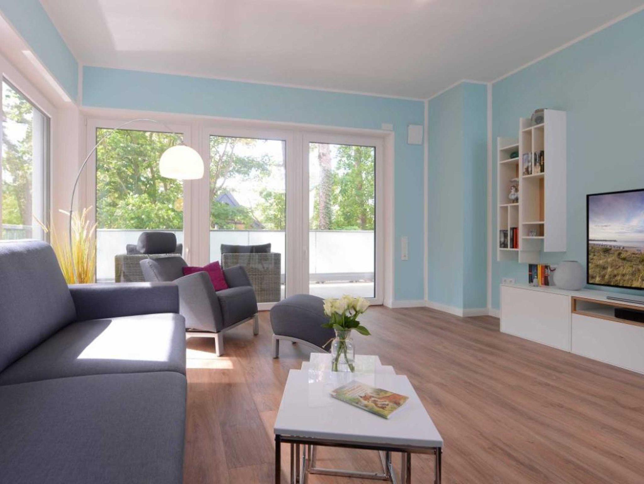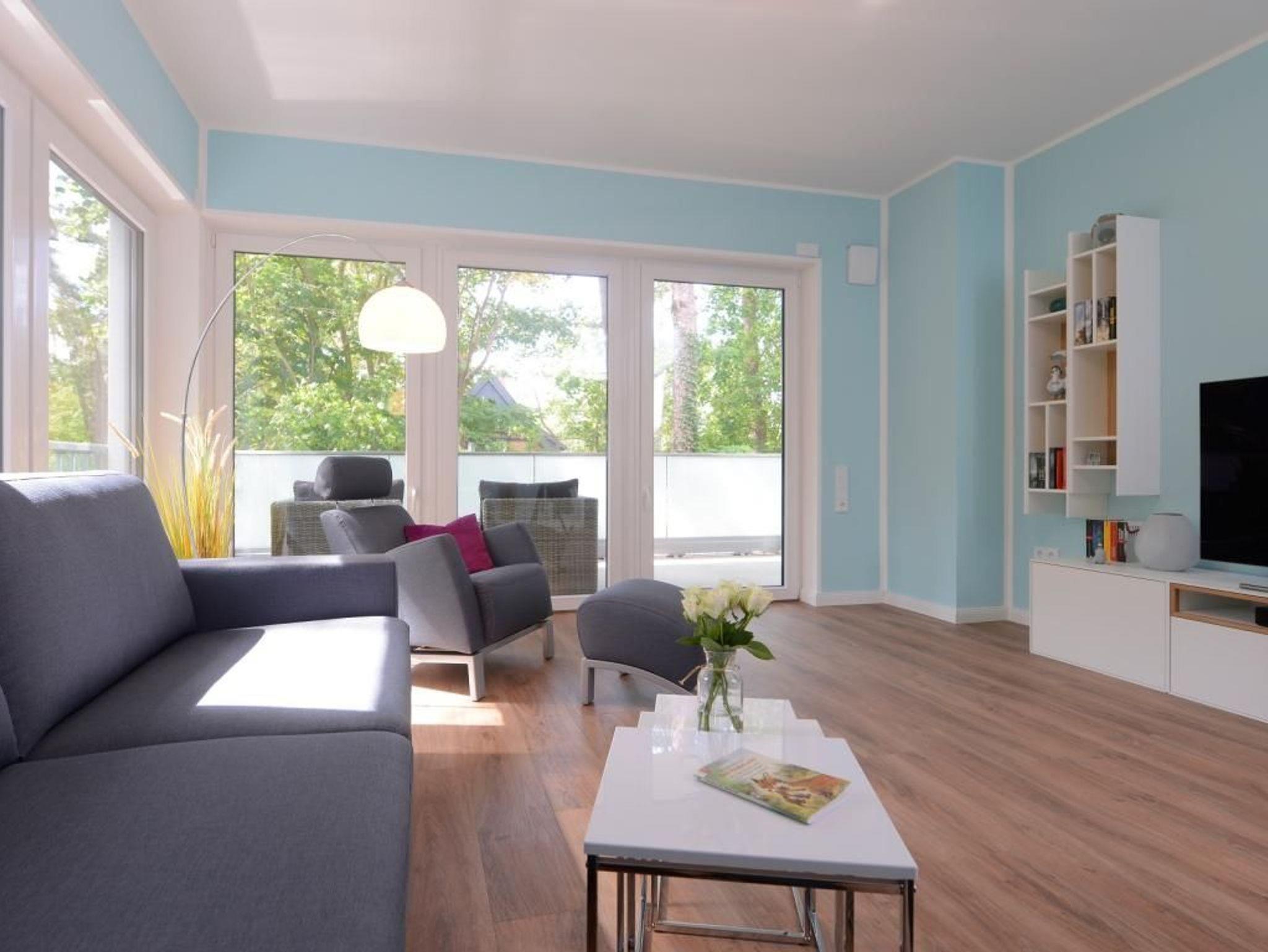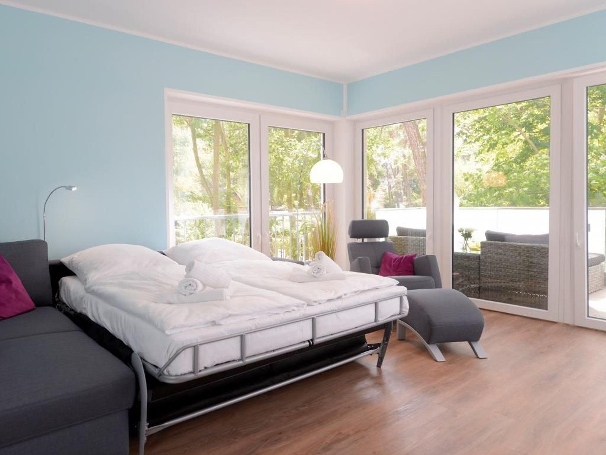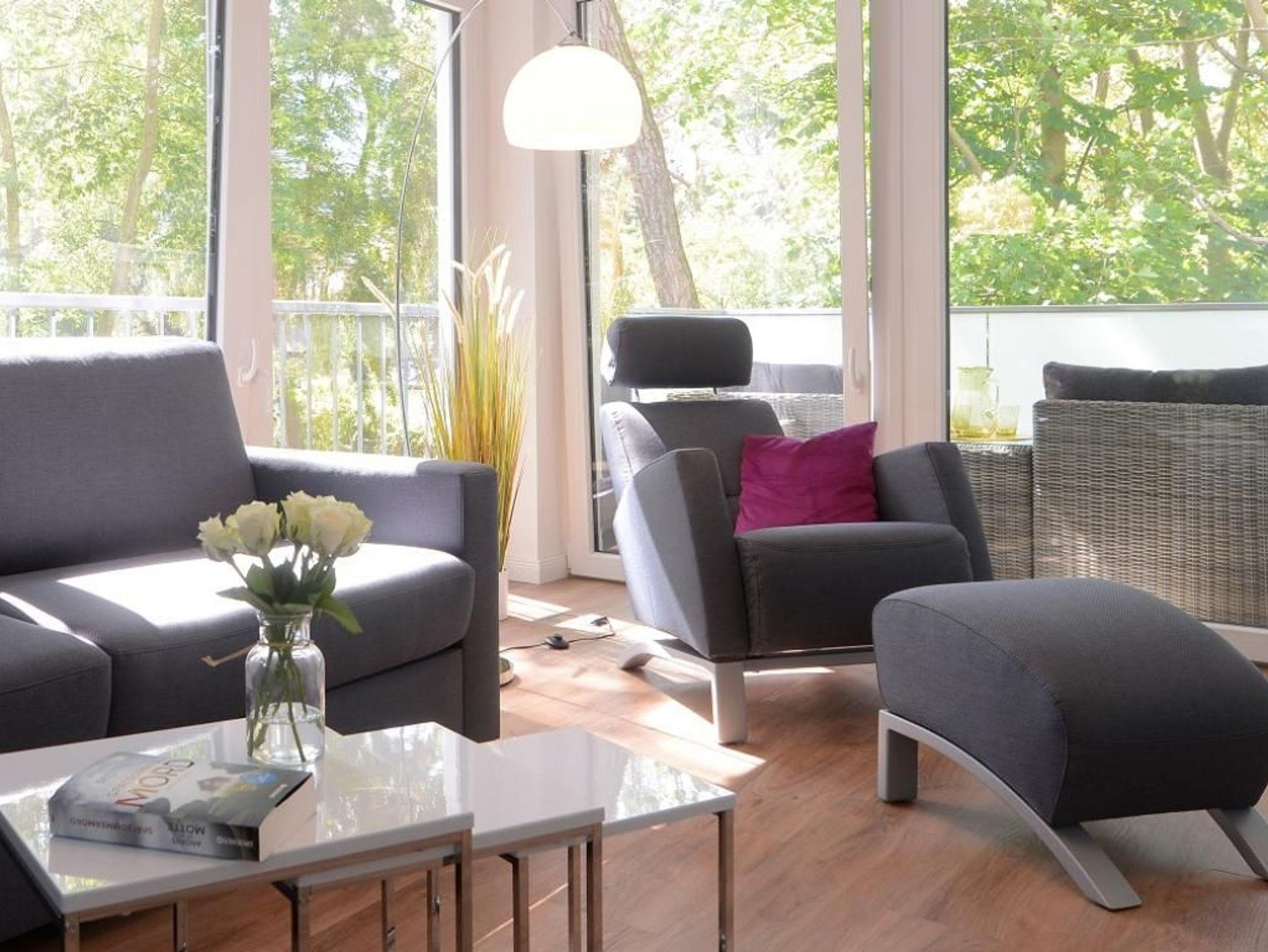 Das barrierefreie Appartement mit zwei Balkonen bietet auf 70qm sehr komfortablen Wohnraum für bis zu 4 Personen und eignet sich ideal für einen Traumurlaub in strandnaher Lage. Zwei saisonale Balkone, ein großzügiger Wohn- und Essbereich, eine voll ausgestattete Küche sowie ein separates Schlafzimmer und eine ausziehbare Couch im Wohnbereich, schaffen beste Voraussetzungen für erholsame Ferientage mit bis zu 4 Personen. Der helle Wohnbereich, mit bodentiefen Fenstern, ist mit einem hochwertigen Sofa, das in ein Schlafsofa mit zwei weiteren Schlafplätzen umfunktioniert werden kann, sowie einem Essplatz und einer modernen Küche eingerichtet. Für die optimale Selbstversorgung stehen Herd, Backofen, Mikrowelle, Geschirrspüler und weitere umfangreiche Ausstattung zur Verfügung. Die Geschirrschränke sind in handelsüblicher Höhe angebracht. WLAN, ein internetfähiger Fernseher und eine Musikanlage sorgen für zeitgemäßen Komfort. Das Wohlfühlschlafzimmer verfügt ebenfalls über einen Balkonzugang und ist hochwertig mit Boxspringbett und Kleiderschrank möbliert. Ein zweites Fernsehgerät ist im Schlafzimmer vorhanden. Bei Anreise sind bezogene Betten für zwei Personen inklusive. Das moderne, rollstuhlgerechte Tageslichtbad ist mit ebenerdiger Dusche, unterfahrbarem Waschbecken - Höhe 75cm- sowie einem WC mit Sitzhöhe 49cm und Haltegriff in 85cm Höhe ausgestattet. Auch eine Waschmaschine kann genutzt werden. Fußbodenheizung und Klimatisierung sorgen ganzjährig für angenehme Temperaturen. Elektrische Verschattung sowie ein extrabreiter Tiefgaragenstellplatz gegen Gebühr (max. Höhe 1,95 m, max. Länge 5,30 m) und eine Fahrradabstellmöglichkeit für mitgebrachte Fahrräder runden das Angebot ab. Ein komfortables Feriendomizil für Gäste, die Barrierefreiheit, Erholung und die Nähe zum Meer ? nur 50Meter- schätzen. Nichtraucher. Keine Haustiere. Sie erreichen das Appartement bequem mit dem Lift.