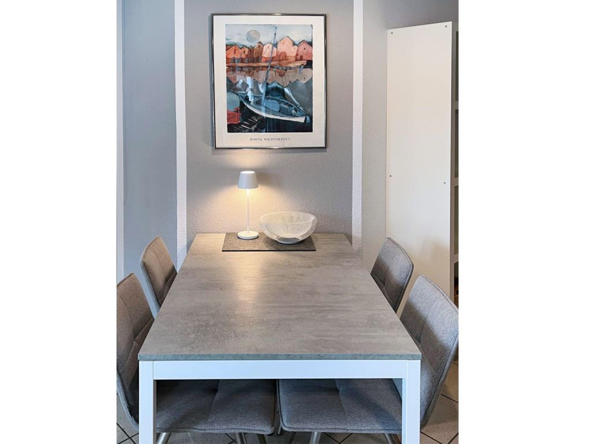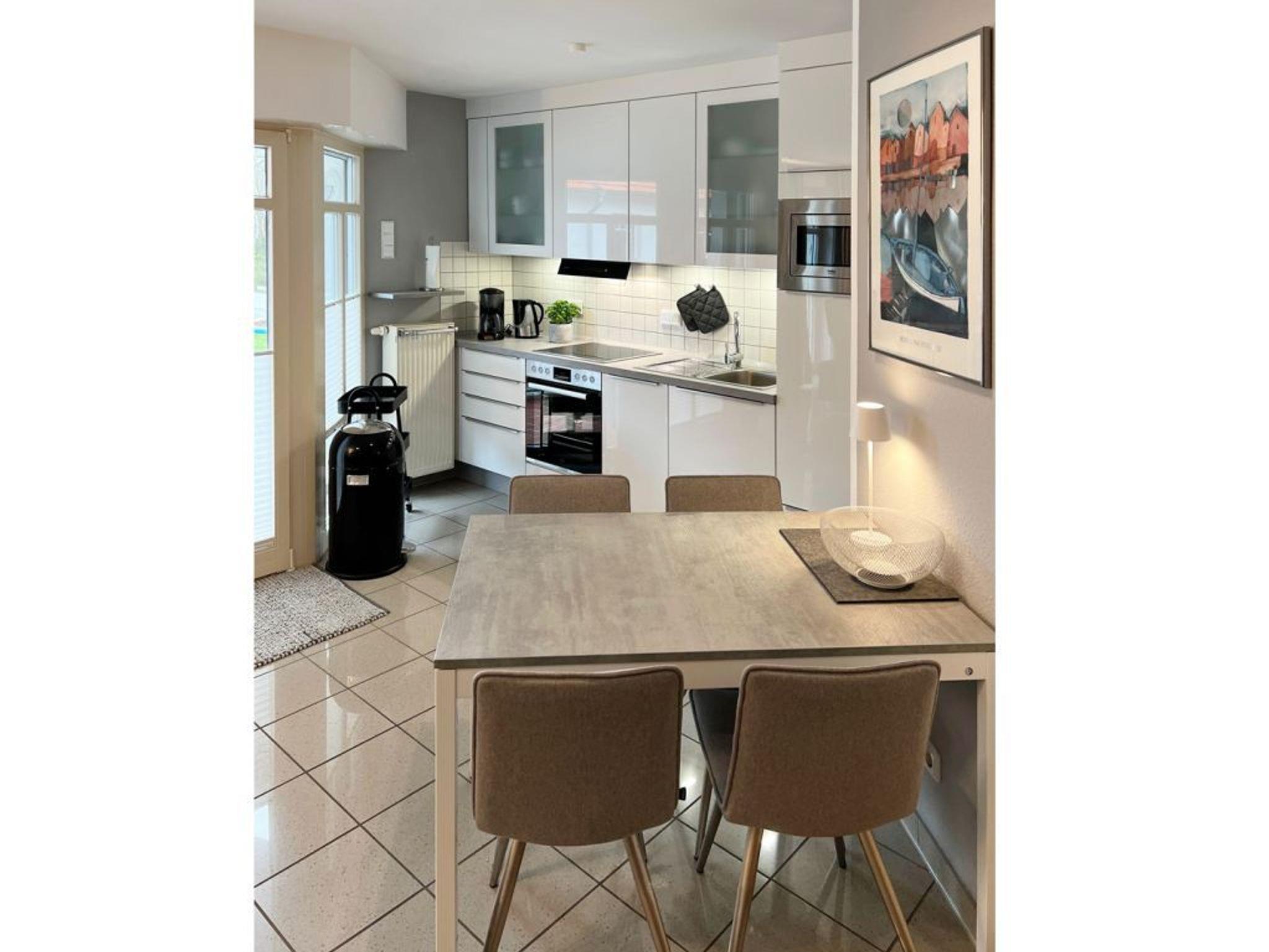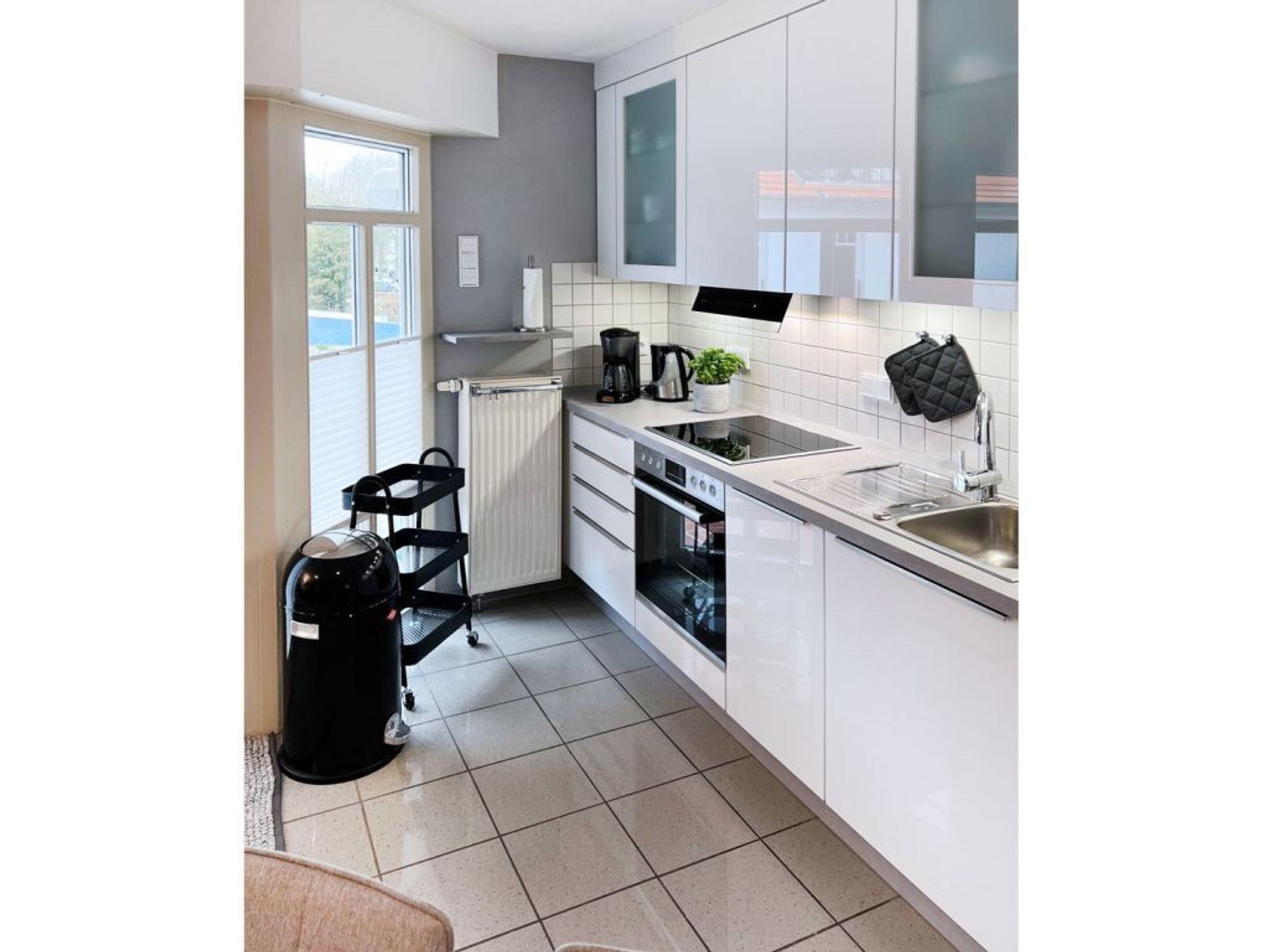 Eine integrierte Wohnküchenzeile ist sehr hochwertig und offen gestaltet: Ceranfeldherd, Backofen, Mikrowelle, Geschirrspüler, Dunstabzug, Kühlschrank mit integr. Frostfach, Toaster, Kaffeemaschine, Wasserkocher usw. ermöglichen die Eigenversorgung. Ihre Urlaubsmahlzeiten nehmen Sie am Esstisch zu sich, oder Sie genießen Ihre Auszeit auf dem saisonal möblierten West-Balkon.