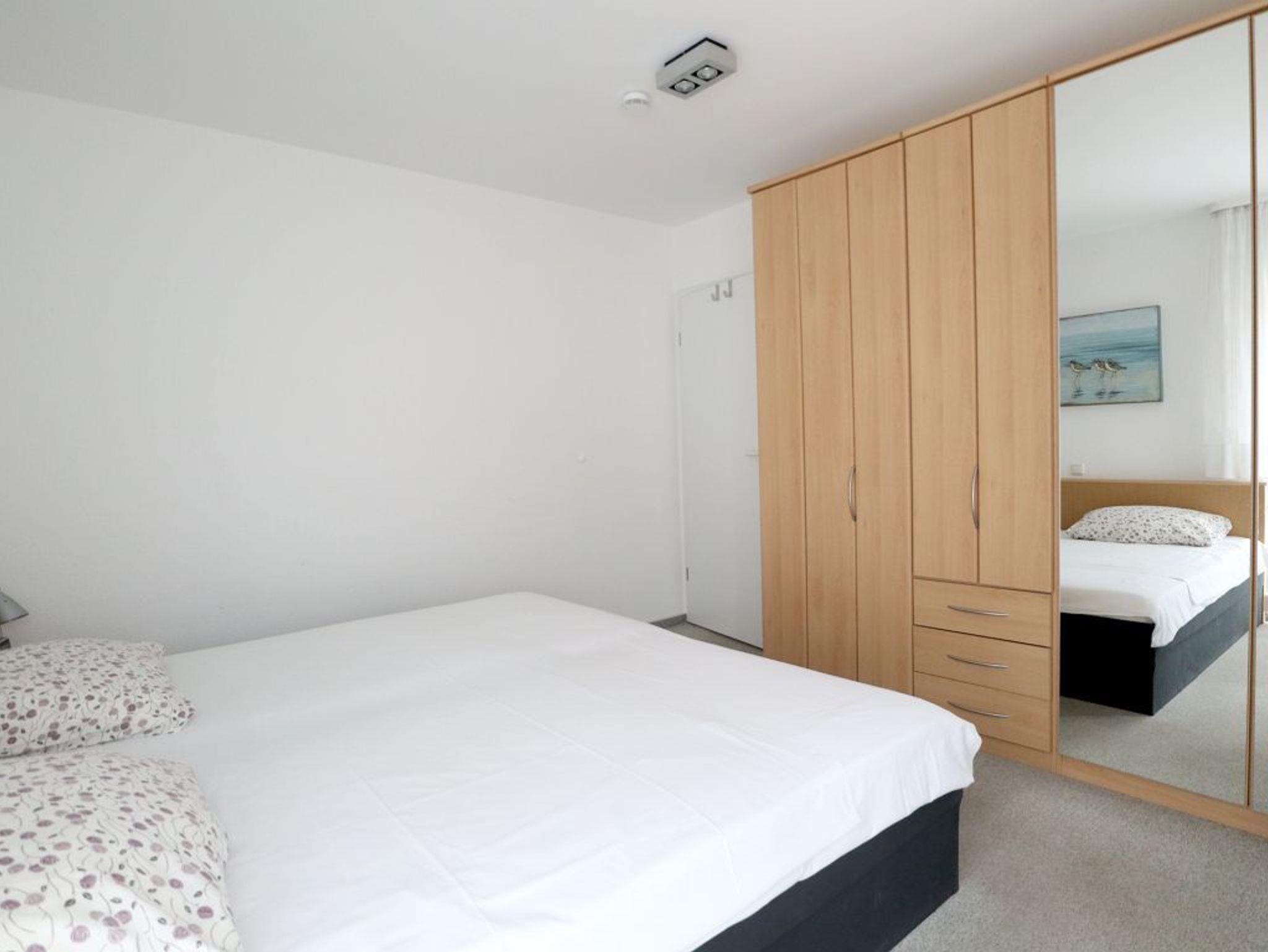 Sie schlafen in einem separaten Schlafzimmer mit Doppelbett 2,00m X 2,00m und einem Kleiderschrank mit viel Stauraum für Ihre Urlaubsgarderobe.