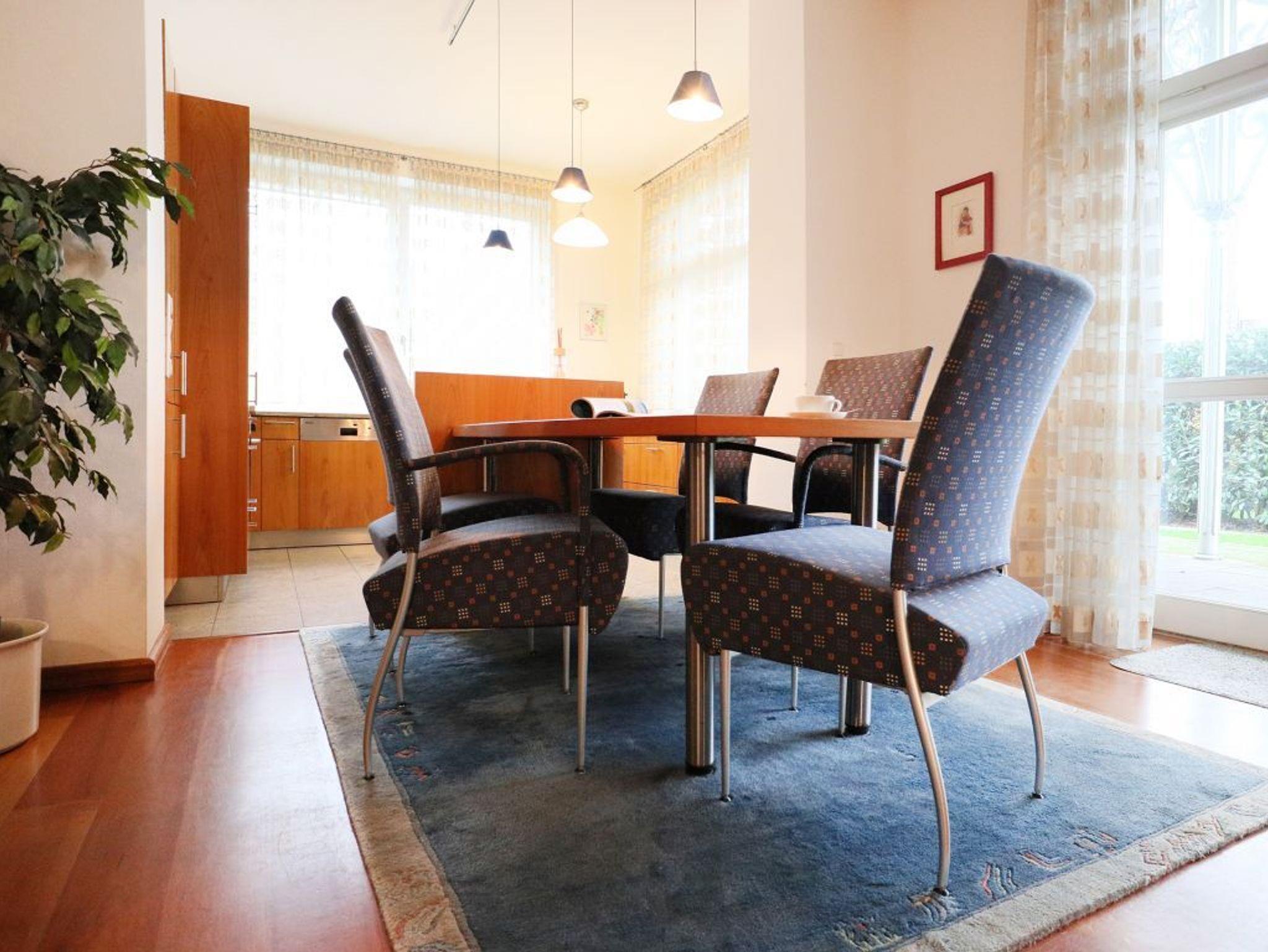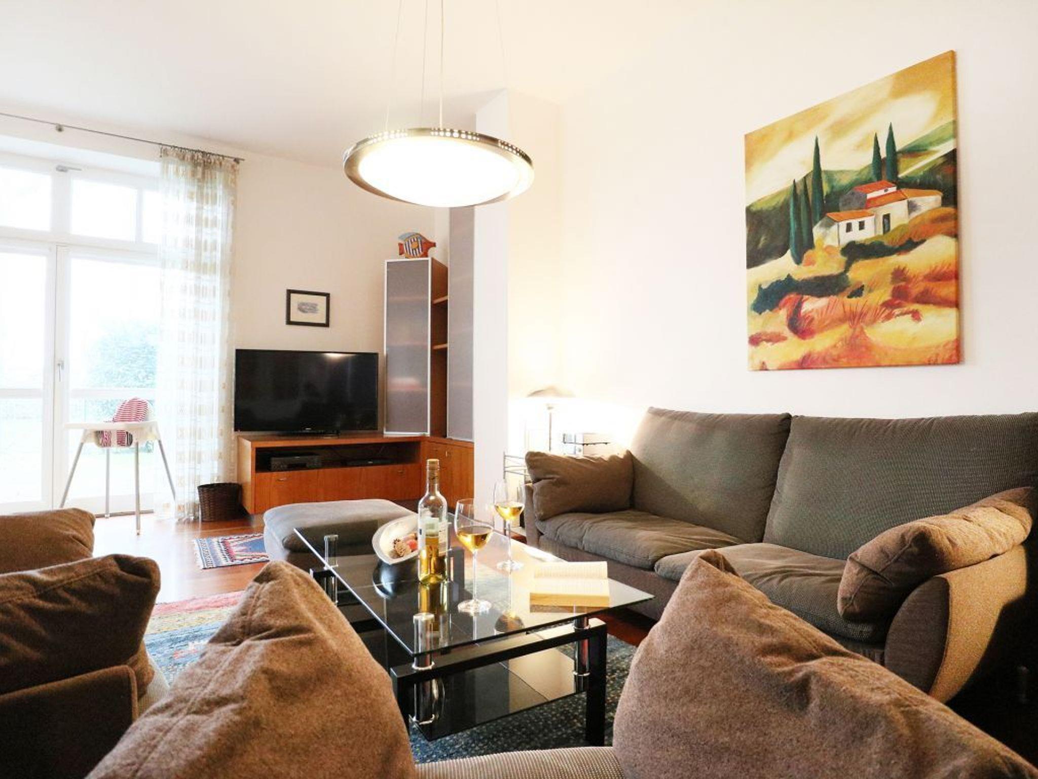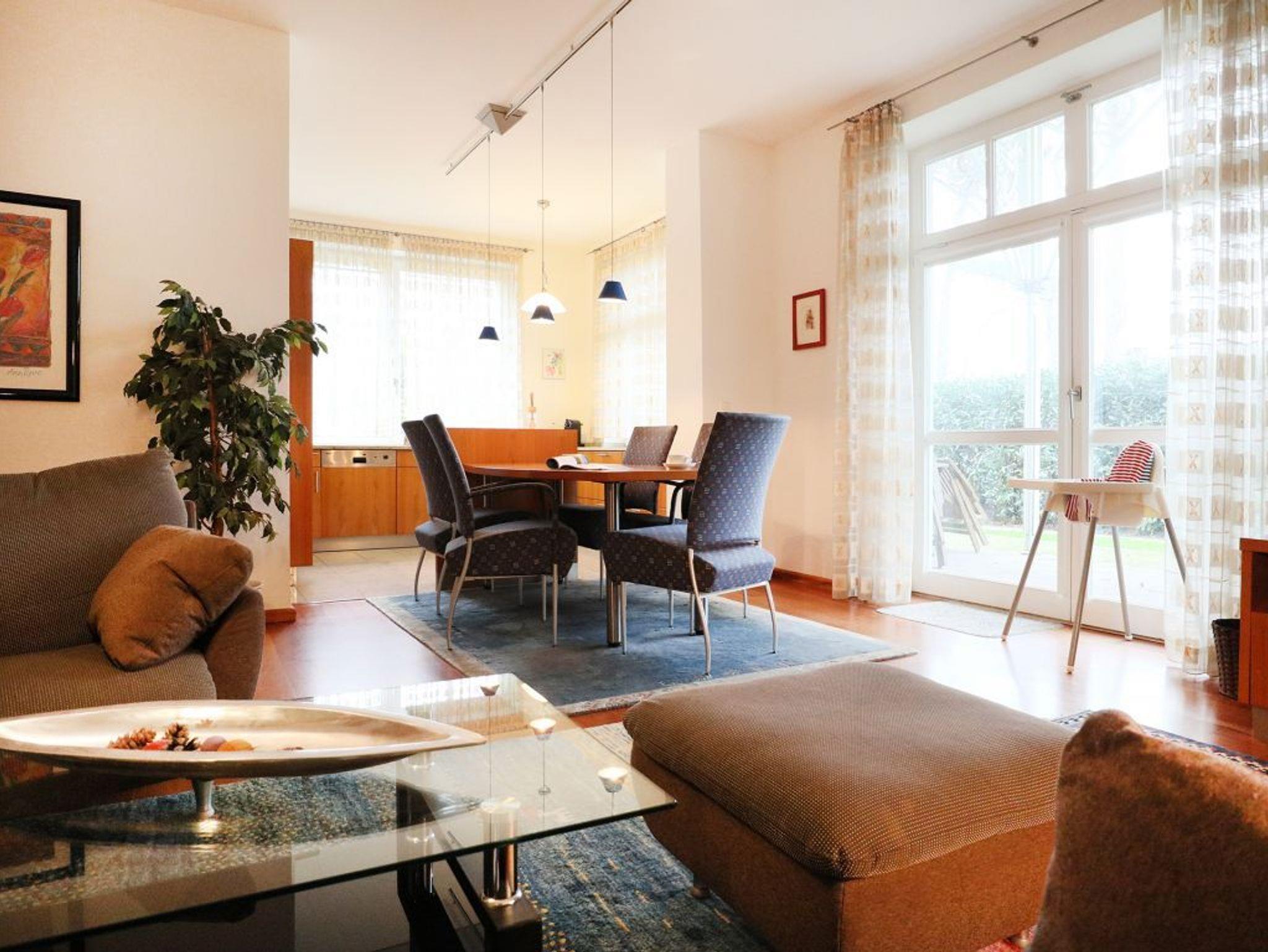 Eine sehr komfortable Erdgeschosswohnung mit Terrasse und einer geräumigen Wohnfläche von ca. 91qm. Die Belegung ist mit max. 4 Personen möglich. Der Wohn-Essbereich ist insgesamt hochwertig möbliert und mit einer Sofagarnitur, Esstisch, Fernseher, Radio mit CD ausgestattet. WLAN nutzen Sie gebührenfrei. Offen gestaltet ist die integrierte Wohnküche mit: Ceranfeldherd, Backofen, Dunstabzug, Kühlschrank mit integr. Gefrierfach, Kaffeemaschine, Toaster, Geschirrspüler usw. Vom Wohnraum aus gelangen Sie auf die saisonal möblierte, überdachte Terrasse in Nord-Ost Lage.
