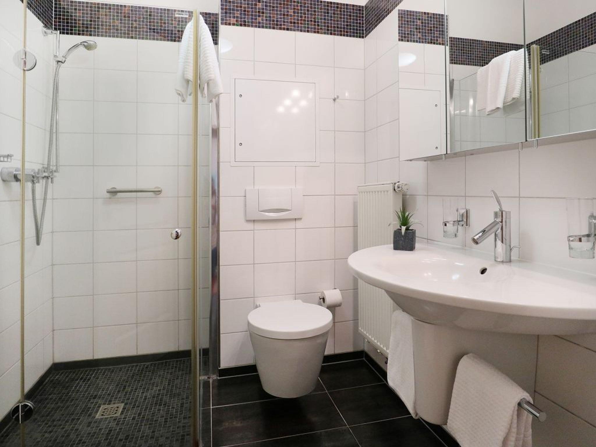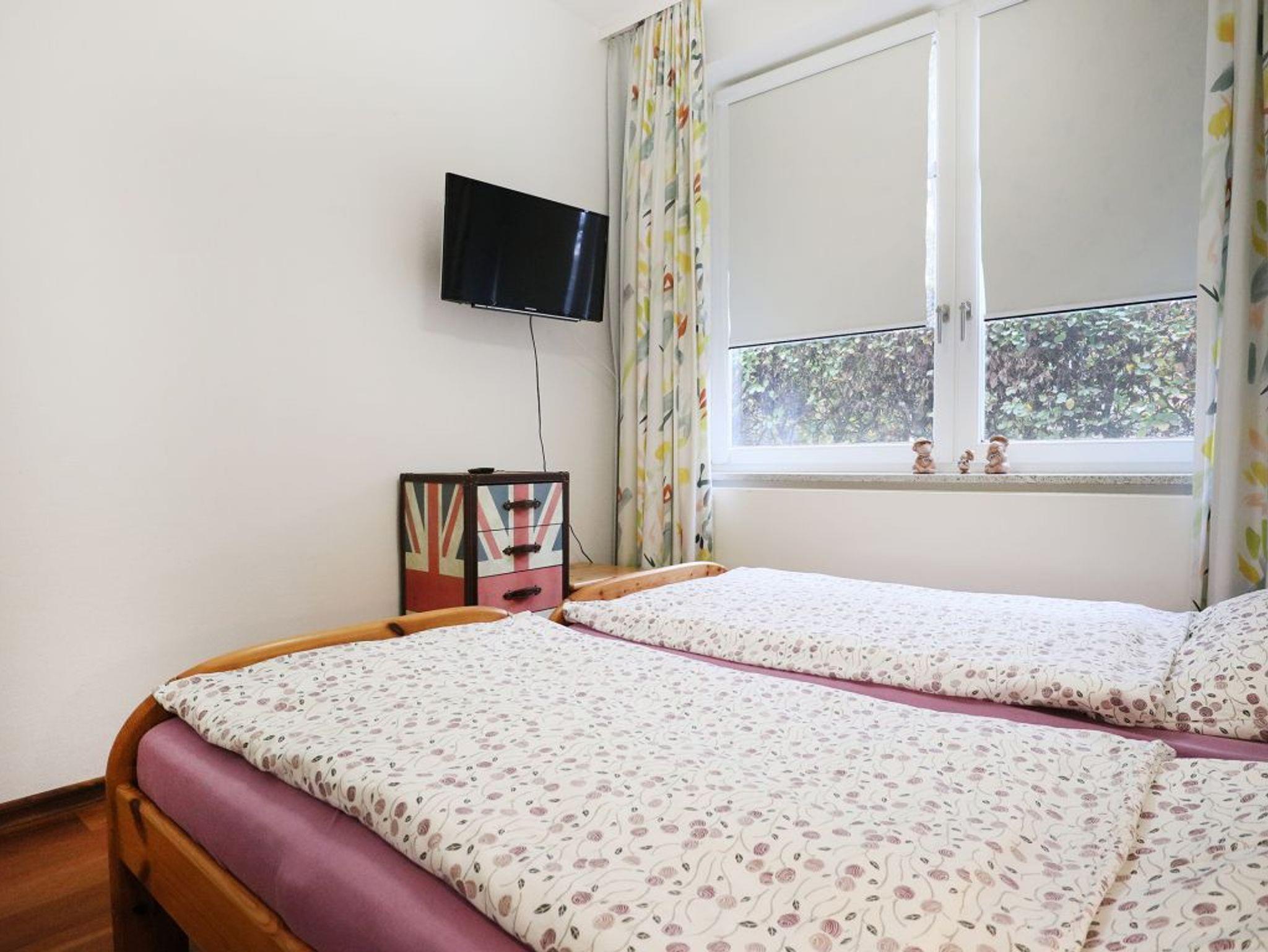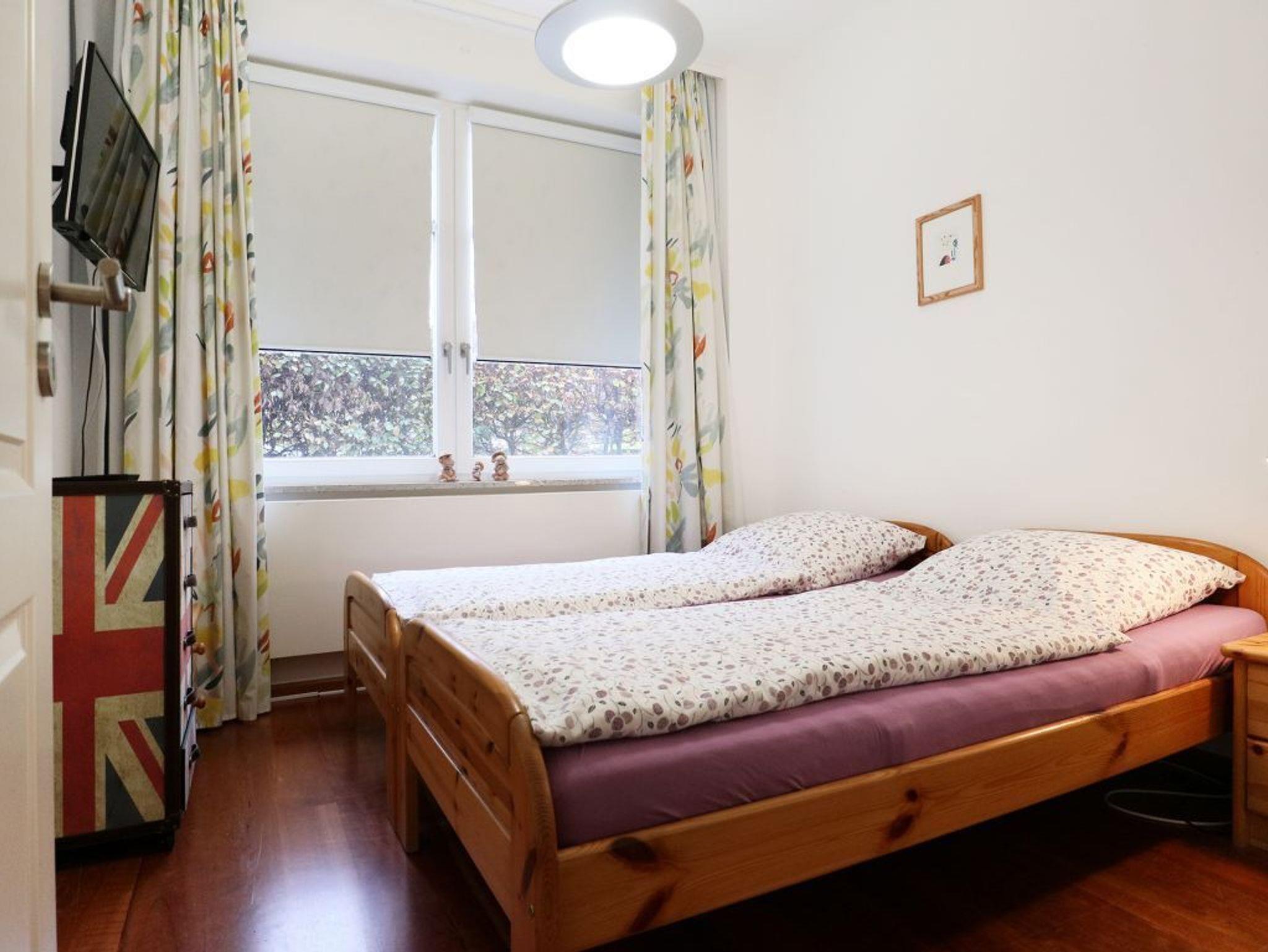Erholsame Nächte ermöglichen zwei separate Schlafzimmer, einmal mit Doppelbett und Fernseher. Ein weiteres mit zwei zusammengestellten Einzelbetten. Ihre Urlaubsgarderobe verstauen Sie im großen Kleiderschrank. Die Ferienwohnung verwöhnt mit einem ebenerdigen Duschbad mit Waschtisch, WC.