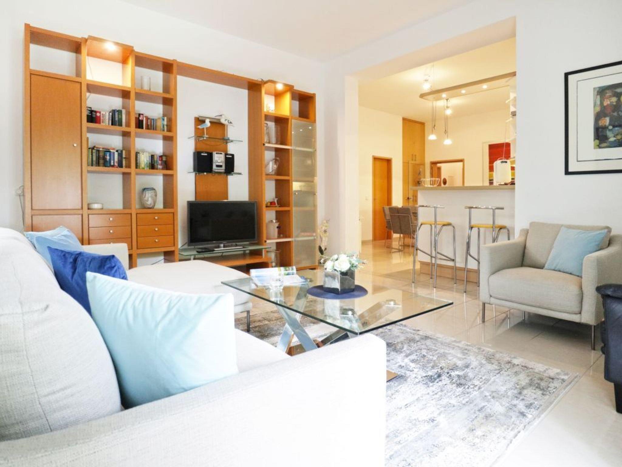 Es empfängt Sie ein sehr schönes 3-Zimmer Hochparterre Appartement mit zwei Schlafzimmern. Mit einer großzügigen Wohnfläche von 83qm bietet die Wohnung genügend Platz für bis zu 4 Personen. Im gemütlichen Wohnzimmer mit Sofa, Sessel, Fernseher, Musikanlage, WLAN, Telefon, FAX-Gerät, ist die Wohnküche integriert und mit Geschirrspüler, Mikrowelle, Backofen, Kühlschrank mit integr. Gefrierfach, Toaster, Wasserkocher und Kaffeemaschine ausgestattet. Somit ist eine bequeme Eigenversorgung auch während des Urlaubs möglich. Ein großer Esstisch lädt zu gemeinsamen Mahlzeiten ein. Erholung finden Sie auf einem der beiden saisonal möblierten Balkone in nord-ost, süd-west Ausrichtung. Die Schlafzimmer sind zum einen mit Doppelbett, Kleiderschrank und zum andren mit einer ausklappbaren Schlafcouch 1,40m x 1,90m eingerichtet. Ein Tageslicht Duschbad mit Waschtisch, WC ist zugehörig. Eine Waschmaschine steht gegen Gebühr zur Verfügung. Bitte beachten Sie, dass Haustiere ebenso wie Rauchen nicht gestattet sind.