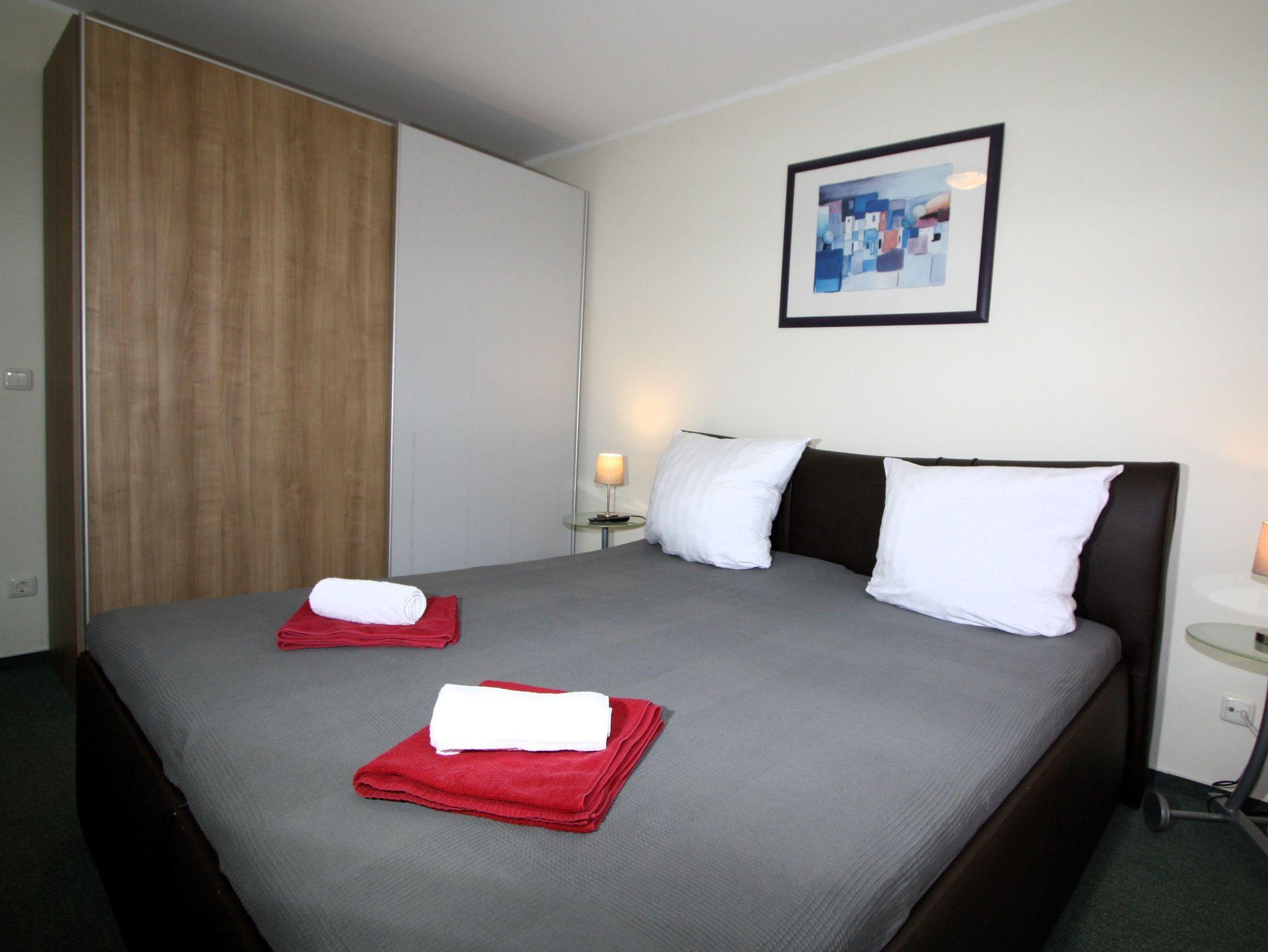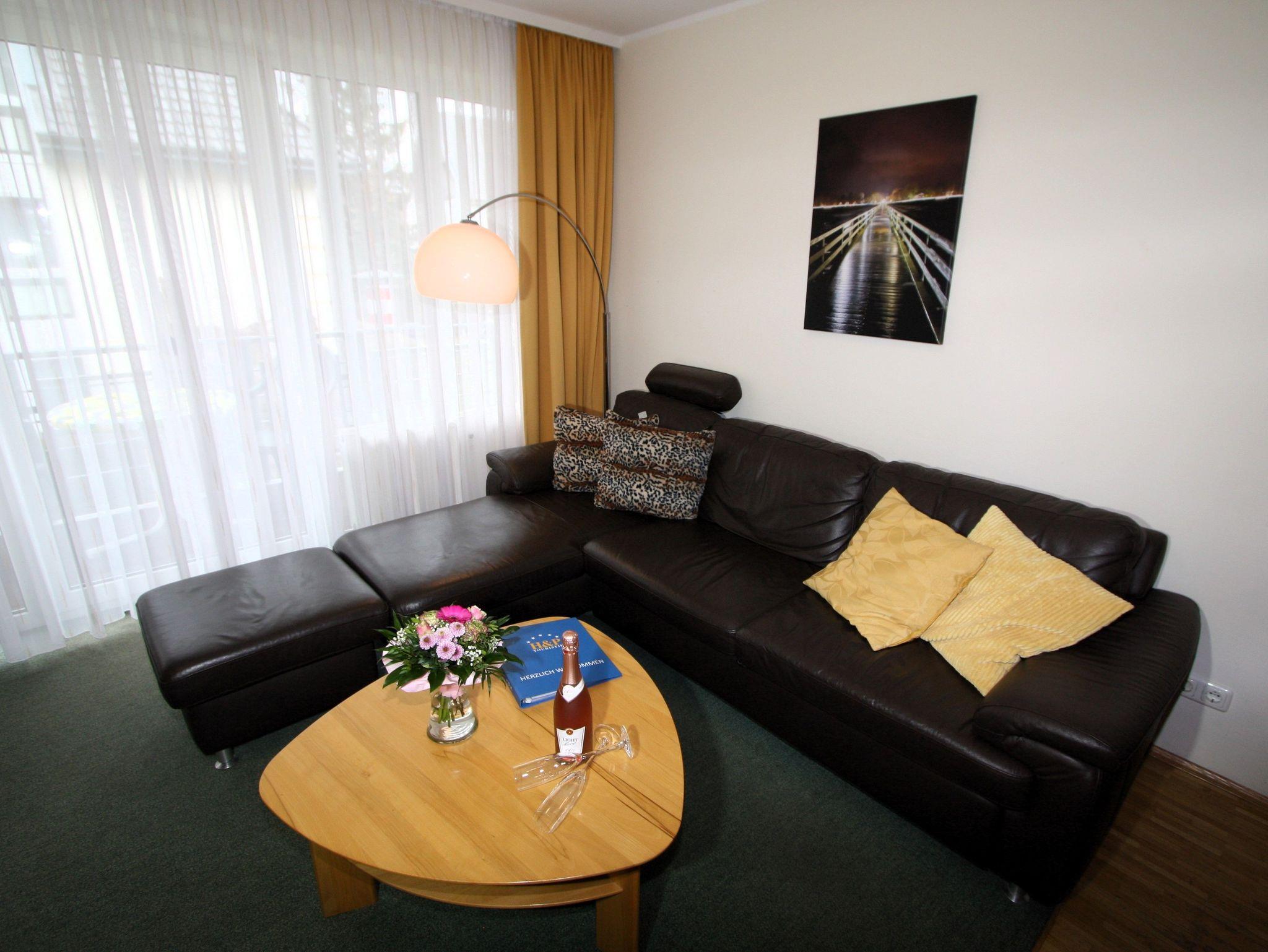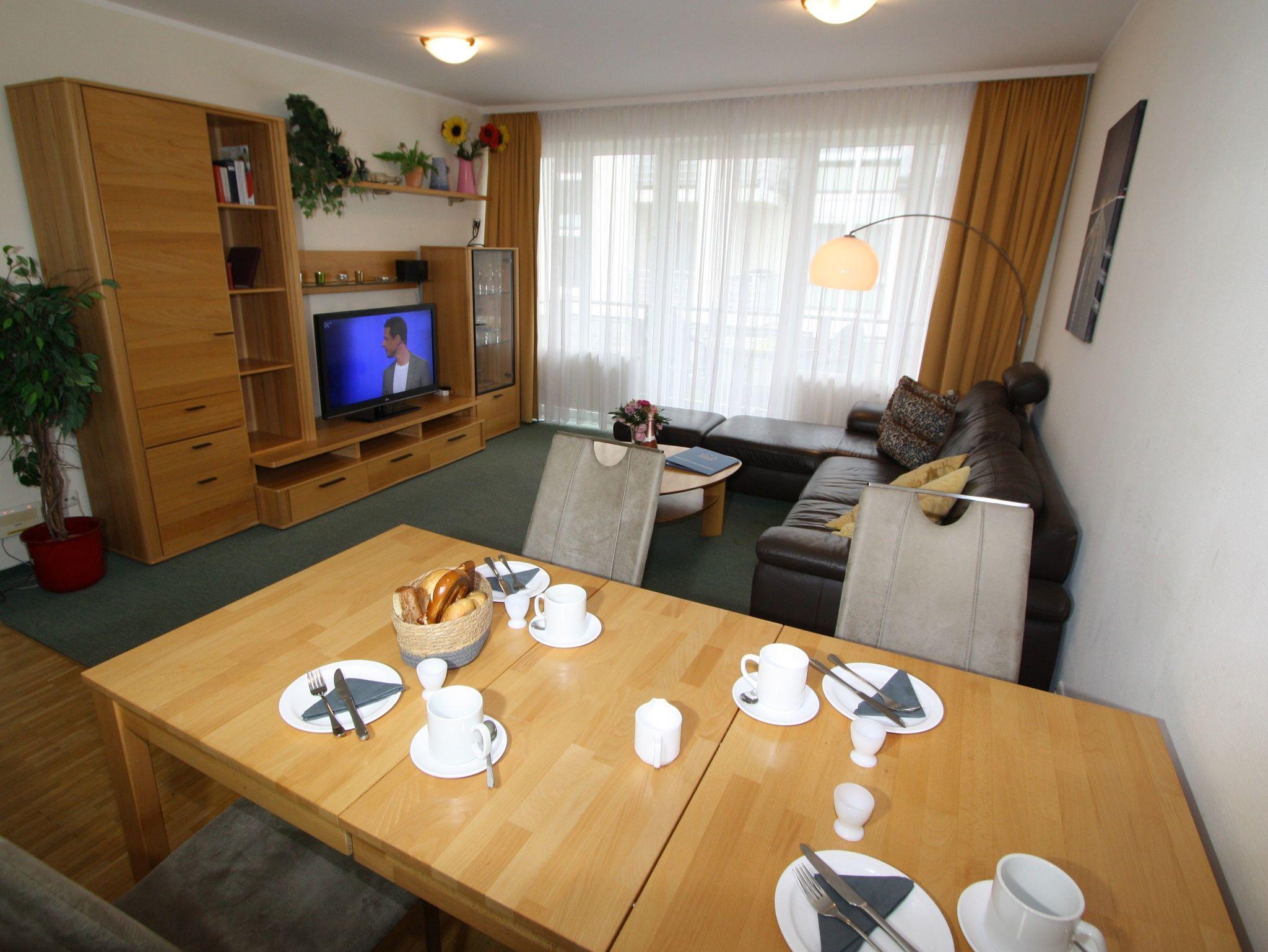 Sie wohnen in einem 2-Zimmer-Appartement für bis zu 3 Personen auf ca. 45 m² im 1. OG. EIn Schlafzimmer mit Doppelbett, Wohn-/Schlafraum mit bequemer Doppelbettcouch, separater Essplatz mit vier Stühlen u. Tisch, voll ausgestatteter Küchenbereich, Dusche/WC, Balkon, SAT-LCD-TV, Telefon. PKW-Stellplatz in der Tiefgarage unmittelbar vor dem Fahrstuhl.