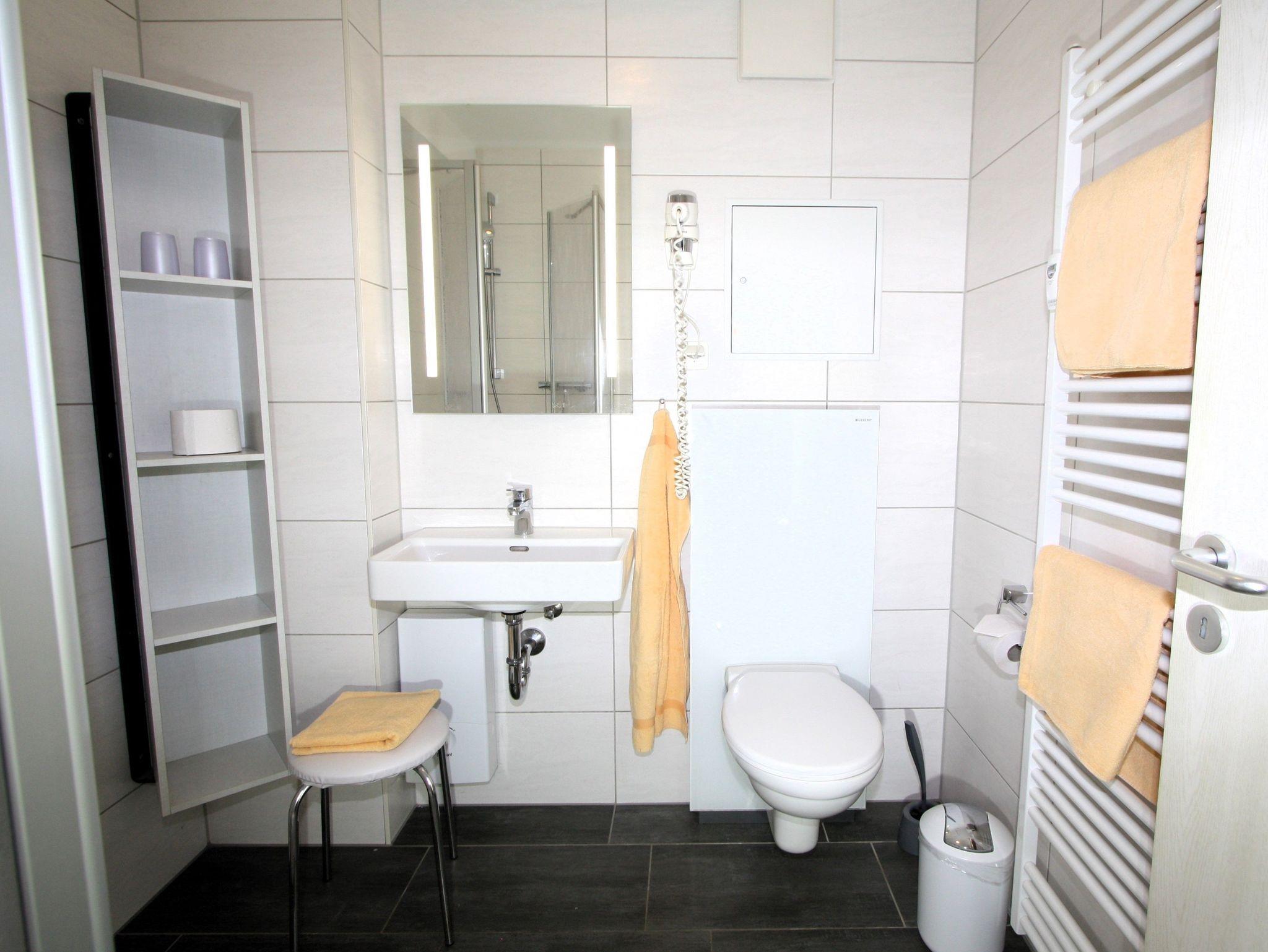 Das Bad ist zusätzlich ausgestattet mit Föhn und beleuchtetem Schminkspiegel. Der Boden ist gefliest.