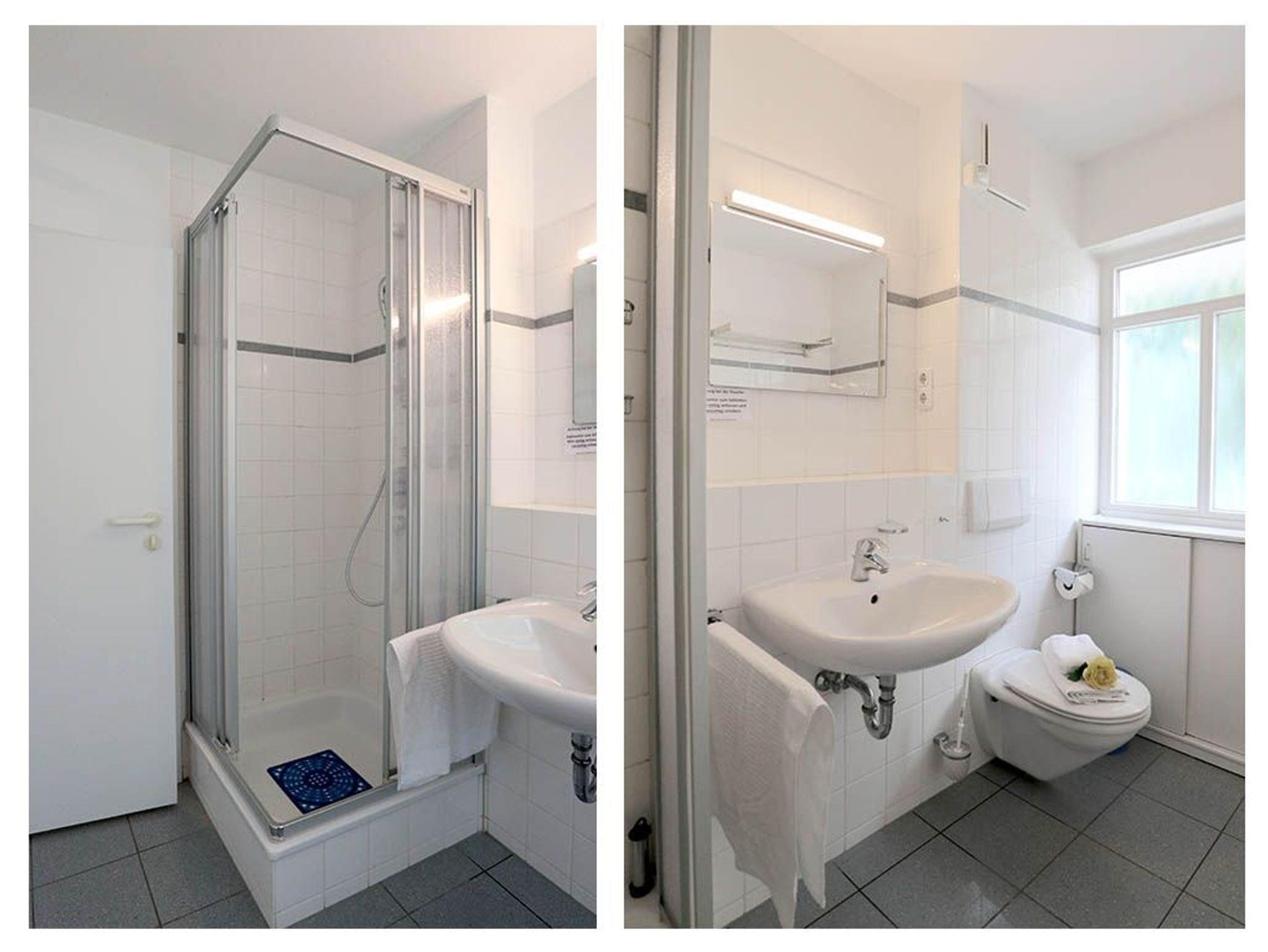 Das Appartement besitzt ein hell gefliestes Tageslicht Duschbad mit Waschtisch, Handtuchheizung, WC.