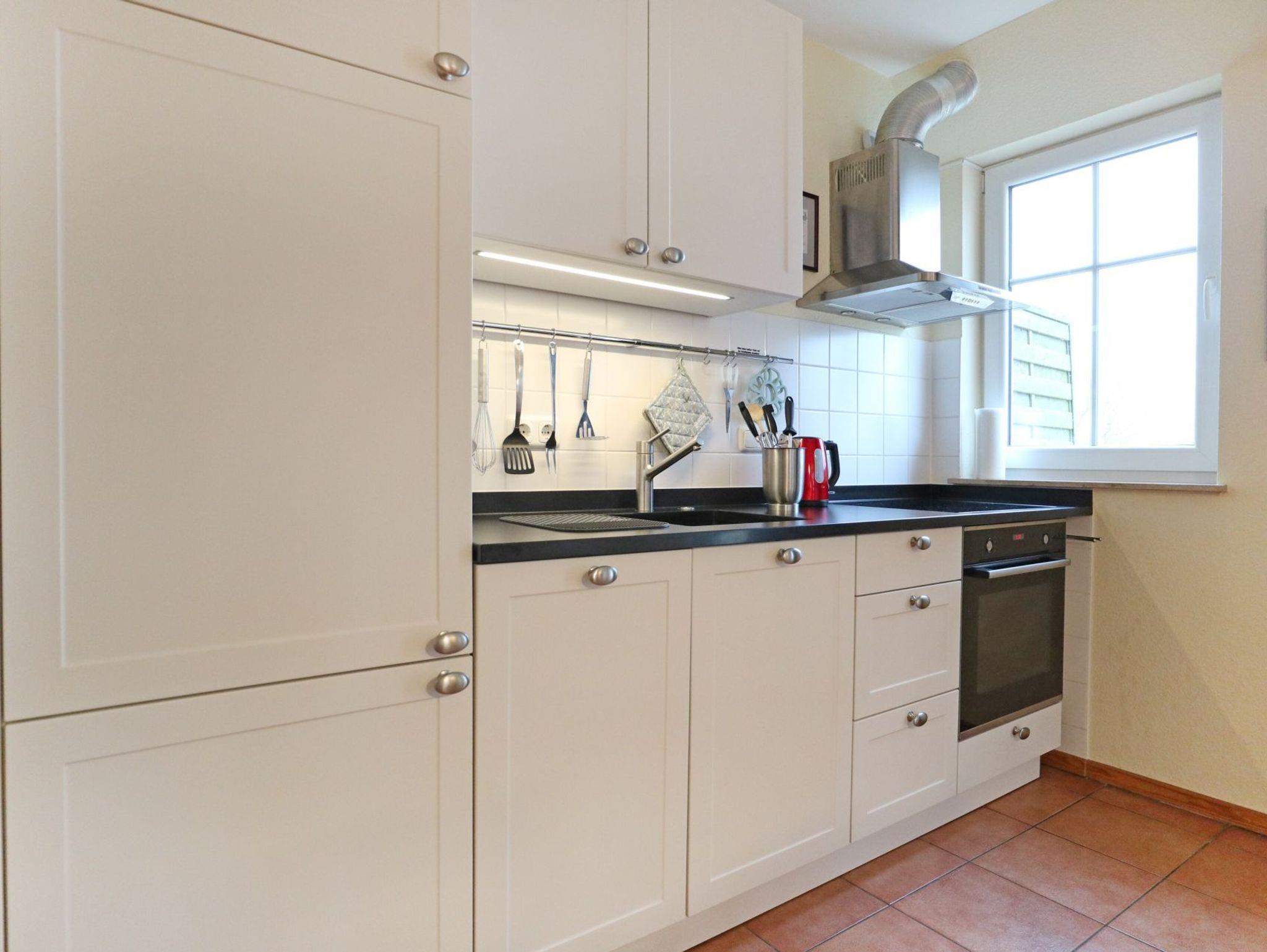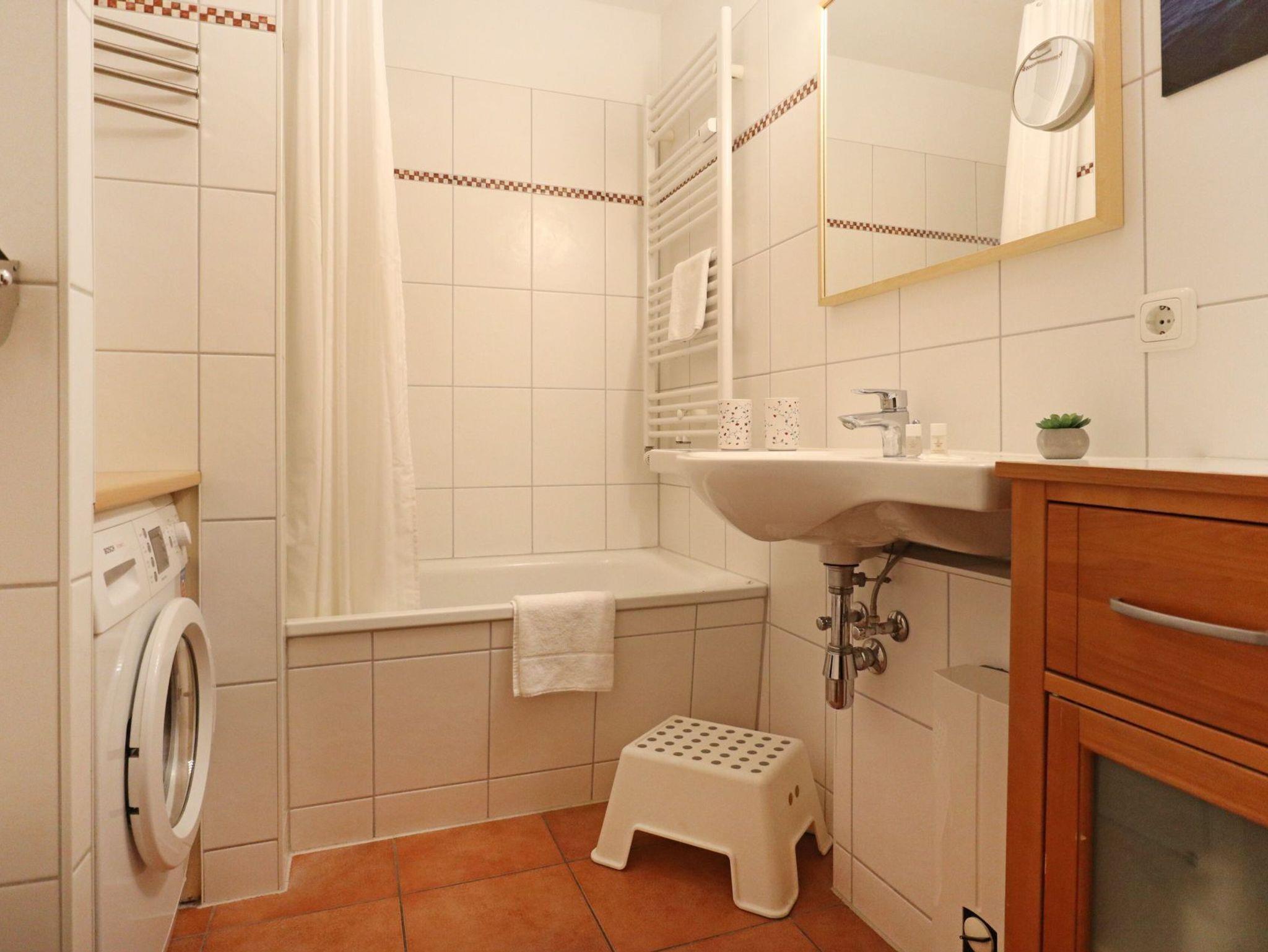 Herd, Geschirrspülmaschine, Kühl-/Gefrierschrank ausgestattet. Das Bad verfügt über eine Badewanne mit Duschmöglichkeit und eine Waschmaschine. Der reservierte PKW- Stellplatz befindet sich in der Tiefgarage. Ebenfalls in der Tiefgarage befindet sich der abschließbare Fahrradkeller. Von hier aus gelangen Sie mit dem Fahrstuhl zum Appartement.