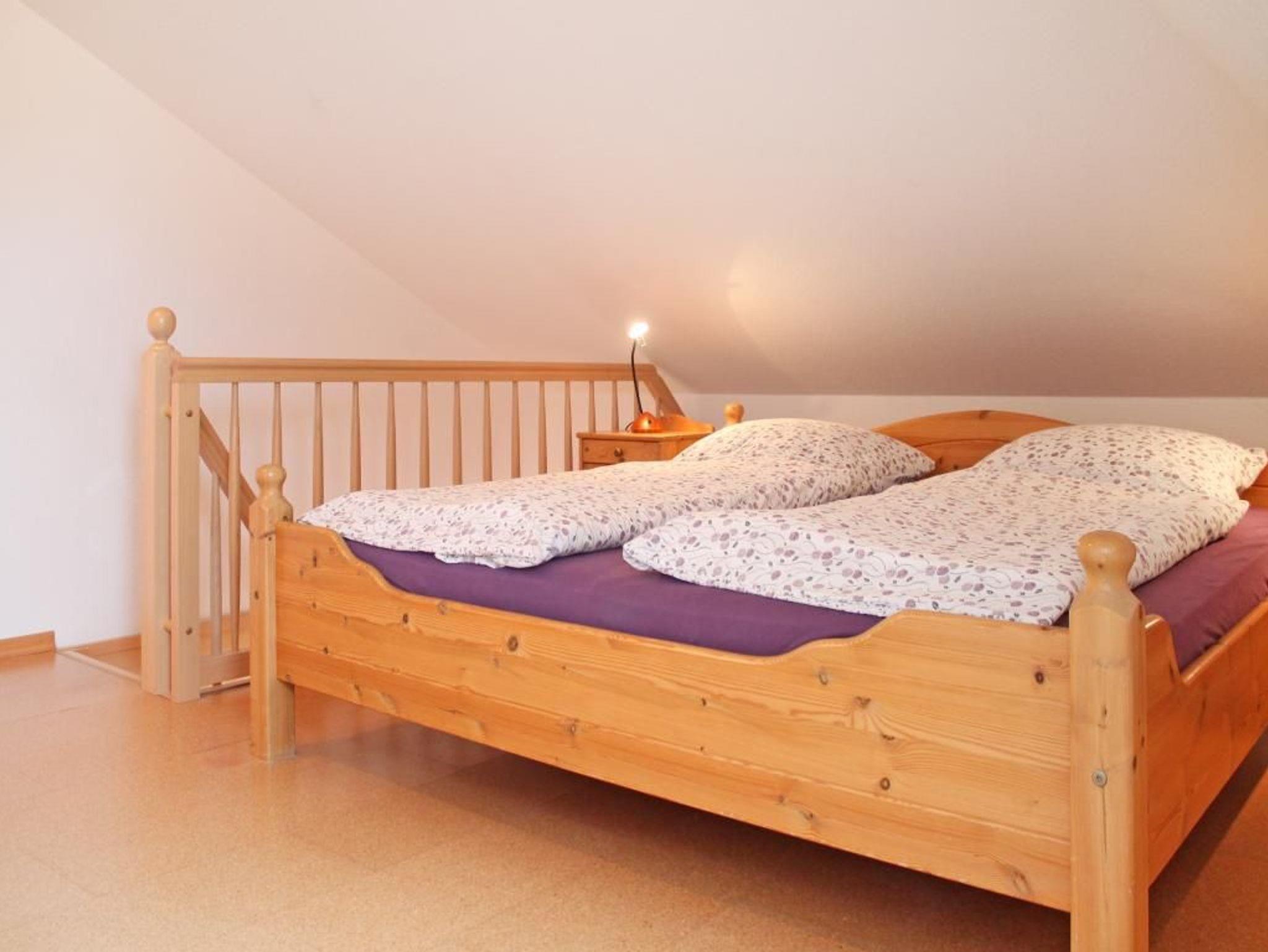 Über eine steile Treppe gelangen Sie in den oberen Wohnungstrakt mit zwei weiteren Schlafzimmern. Eines mit einem ausziehbaren Kojen Bett, Kleiderschrank. Das weitere als offener Galerieraum mit Doppelbett. Die familienfreundliche Ausstattung beinhaltet einen Kinderhochstuhl, Kinderbett.