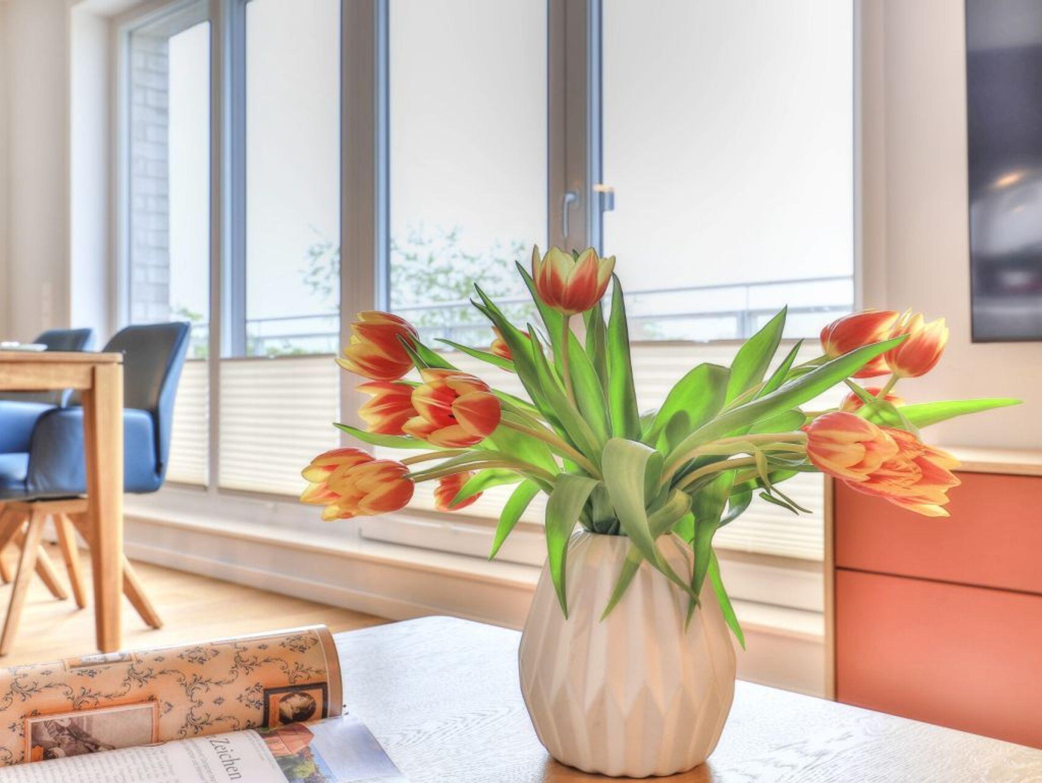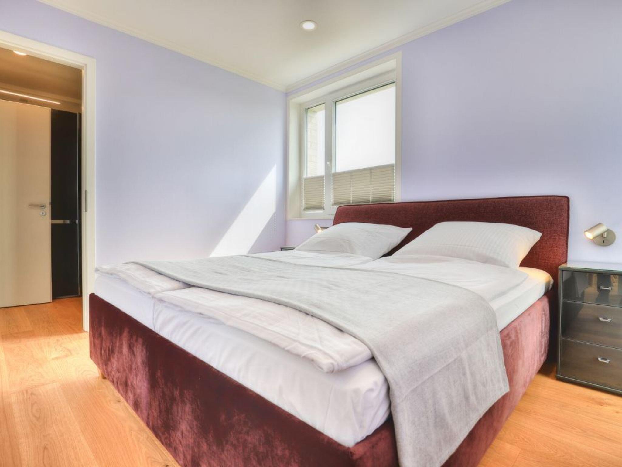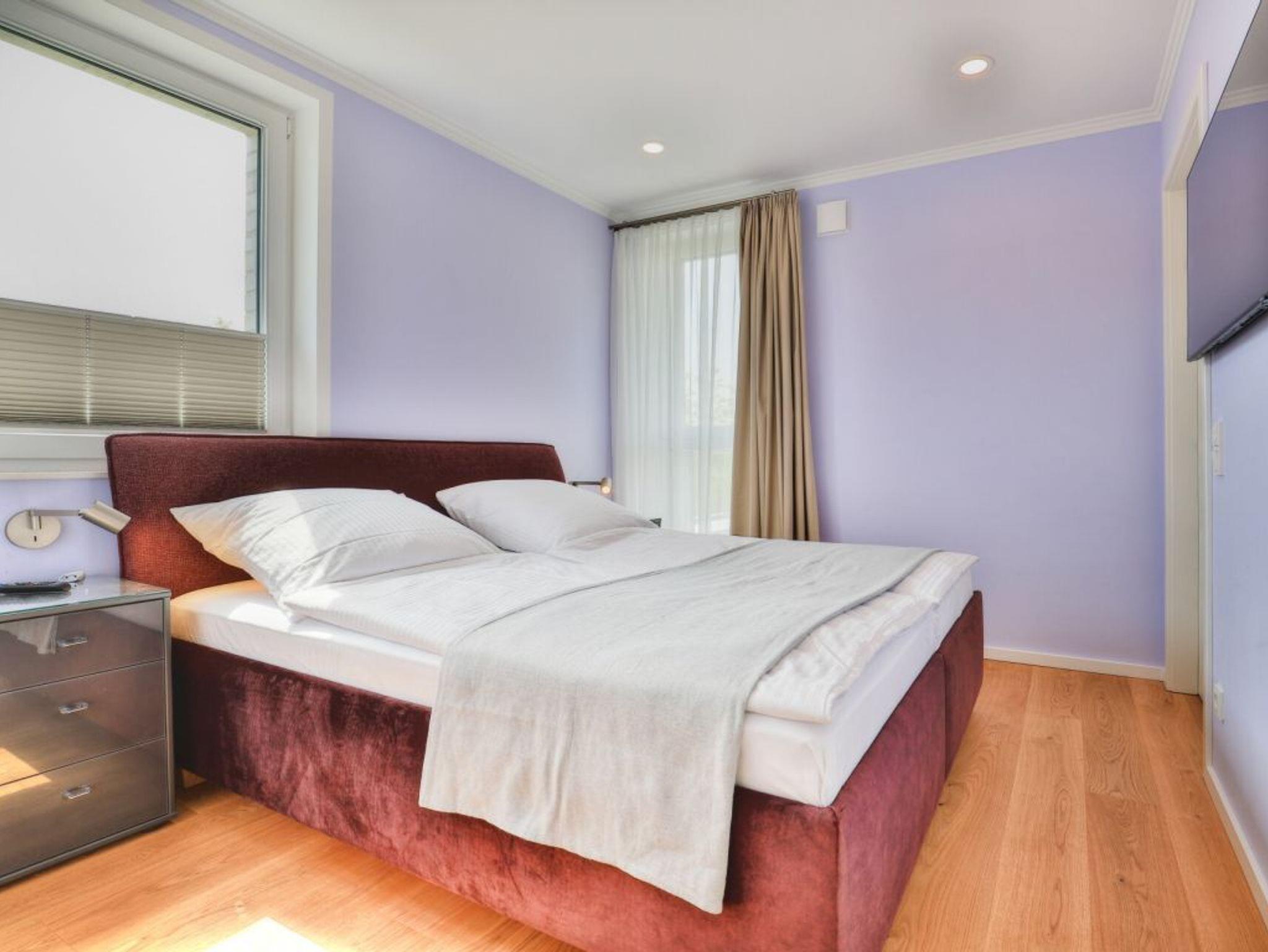 Ein Highlight der Ferienwohnung ist die wohnungseigene Infrarotsauna. Der lichtdurchflutete Wohnbereich ist modern möbliert und bietet ein Design Sofa, Flatscreen TV, Internetradio, Esstisch mit 4 Sitzplätzen sowie den Zugang auf eine der Dachterrassen. Das schnelle Internet nutzen Sie über Glasfaseranschluss. Die in den Wohnraum integrierte Komfort Einbauküche ist vollständig ausgestattet und verfügt über technische Geräte namhafter Hersteller. Ihre zubereiteten Mahlzeiten können Sie an einem Echtholz Esstisch, oder im Sommer auch auf der saisonal möblierten Dachterrasse mit Sicht über die Wiesen zu sich nehmen. Saisonal bedingt stehen hier Relax - Liegen zum Entspannen bereit. Eines der Schlafzimmer ist mit zwei Einzelbetten, Kleiderschrank und einem weiteren Fernseher eingerichtet und verwöhnt zudem mit direktem Zugang auf die zweite Dachterrasse. Das zweite Schlafzimmer ist mit einem Boxspring Doppelbett und einem großzügigen Kleiderschrank möbliert. Insbesondere hervorzuheben ist das luxuriöse Bad mit Regenwalddusche und Infrarotkabine. Wir möchten vorsorglich darauf hinweisen, dass in der Nichtraucherwohnung keine Haustiere