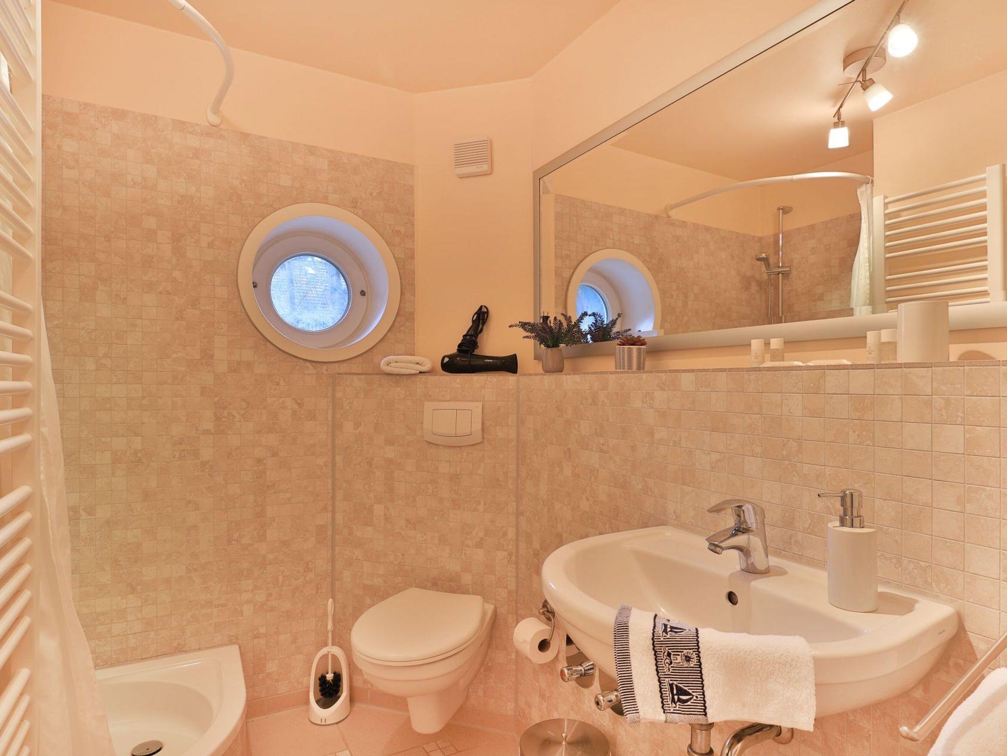 Das Appartement besitzt ein kleines Duschbad mit Waschtisch, Föhn und WC.