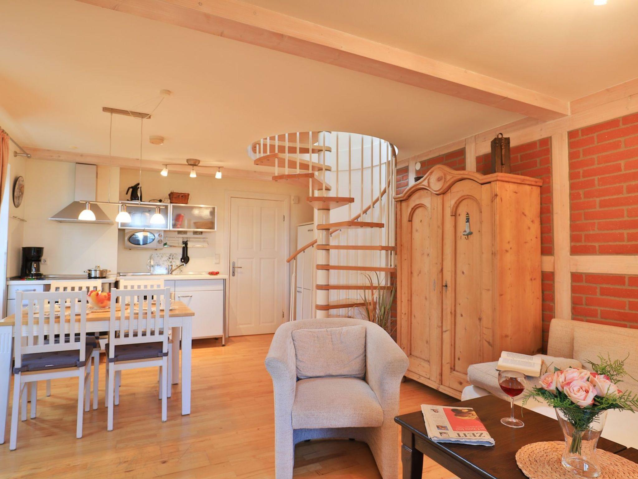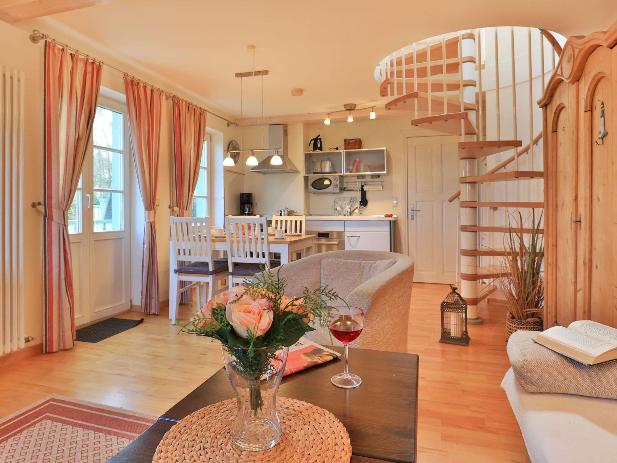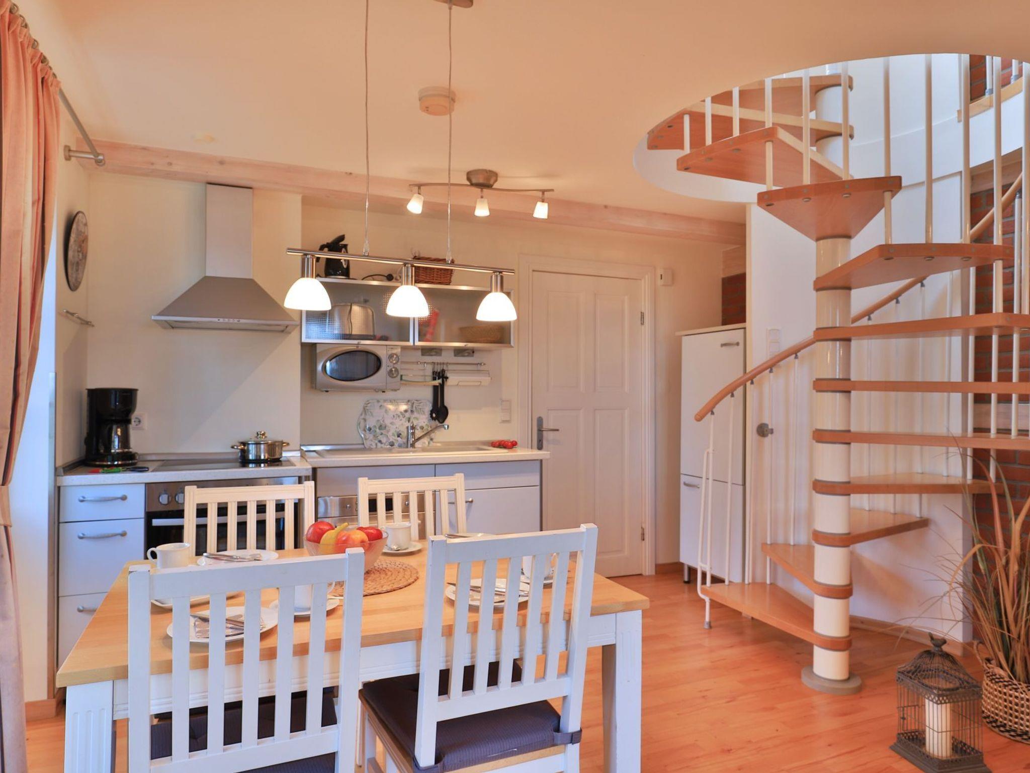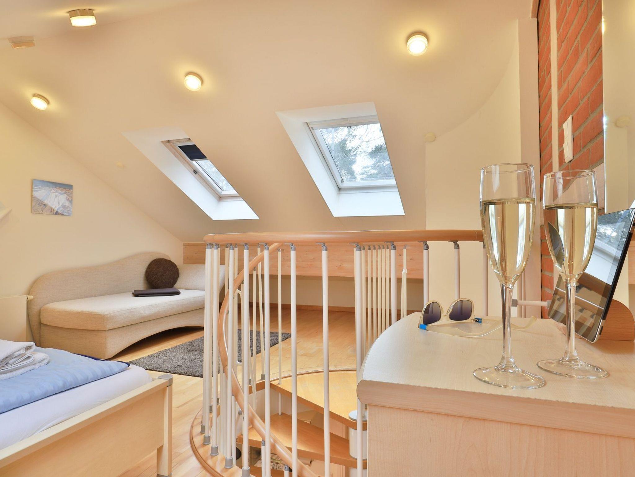 Die 2- Zimmer Meerblick Suite Seestern, mit zwei Balkonen, bietet eine großzügige Wohnfläche von 50qm und ist ideal für eine Belegung mit bis zu 4 Personen. Es handelt sich um eine Wohneinheit, die auch für Allergiker geeignet ist. Der Wohn-Essbereich ist sehr hochwertig mit einem Sofa als zusätzliche Schlafgelegenheit, zwei Sesseln sowie einem Esstisch möbliert. Musikanlage, Fernseher zudem gebührenfreies WLAN sind ebenfalls vorhanden. Die offene Einbauküche ermöglicht die Eigenversorgung mit: Ceranfeldherd, Backofen, Mikrowelle, Dunstabzug, Kaffeemaschine, Wasserkocher, Toaster u.v.m. Ihre Urlaubsmahlzeiten nehmen Sie am Esstisch zu sich, oder Sie finden Ihren Lieblingsplatz mit Ostseeblick auf den beiden, saisonal möblierten Balkonen. Über eine Wendeltreppe erreichen Sie die offene Schlafgalerie mit Doppelbett, kleinem Schrank und Kommode. Des Weiteren bietet hier eine Récamiere eine weitere Schlafmöglichkeit. Bei Anreise sind Ihre Betten bereits für Sie bezogen und Handtücher liegen bereit.
