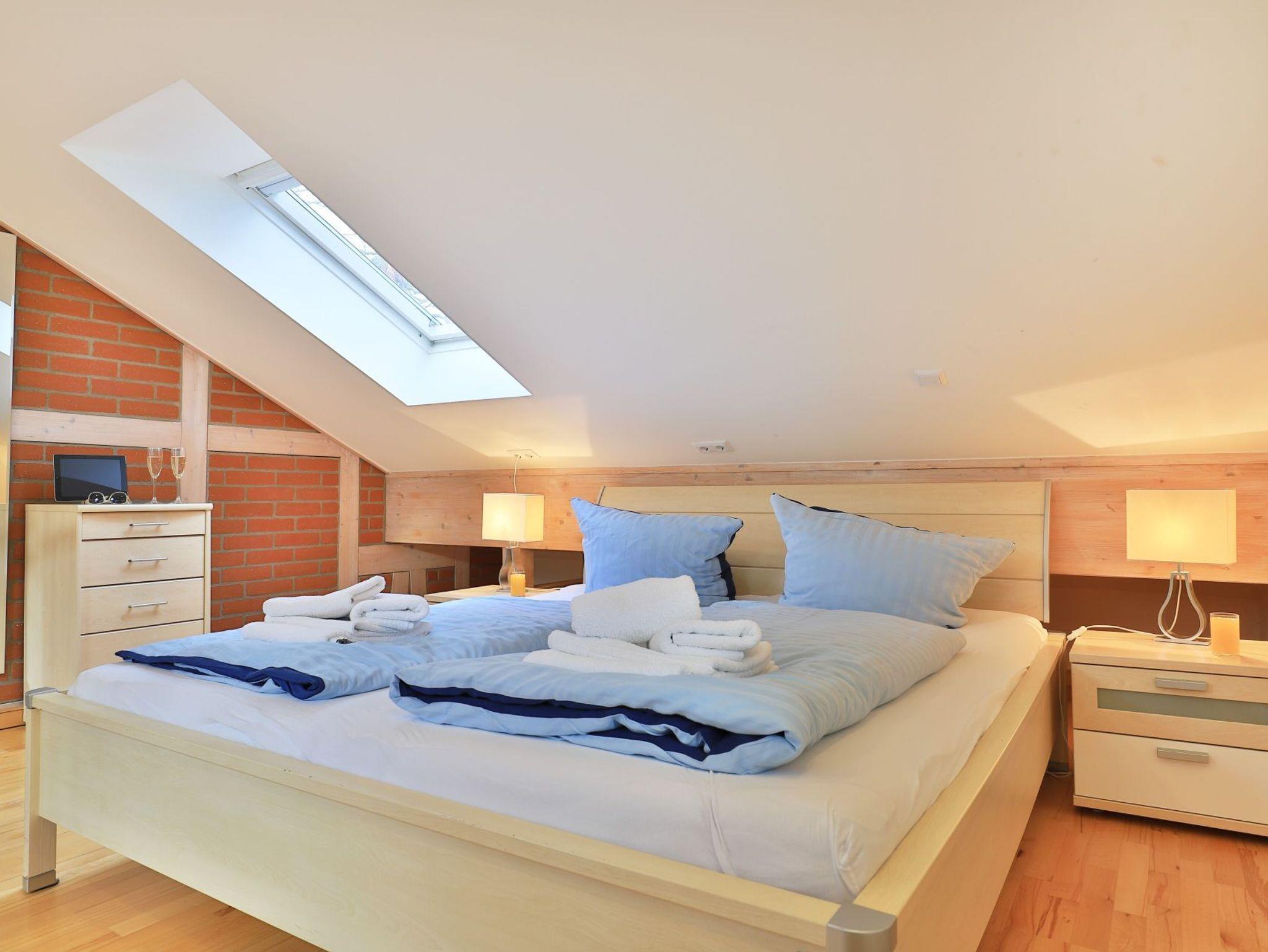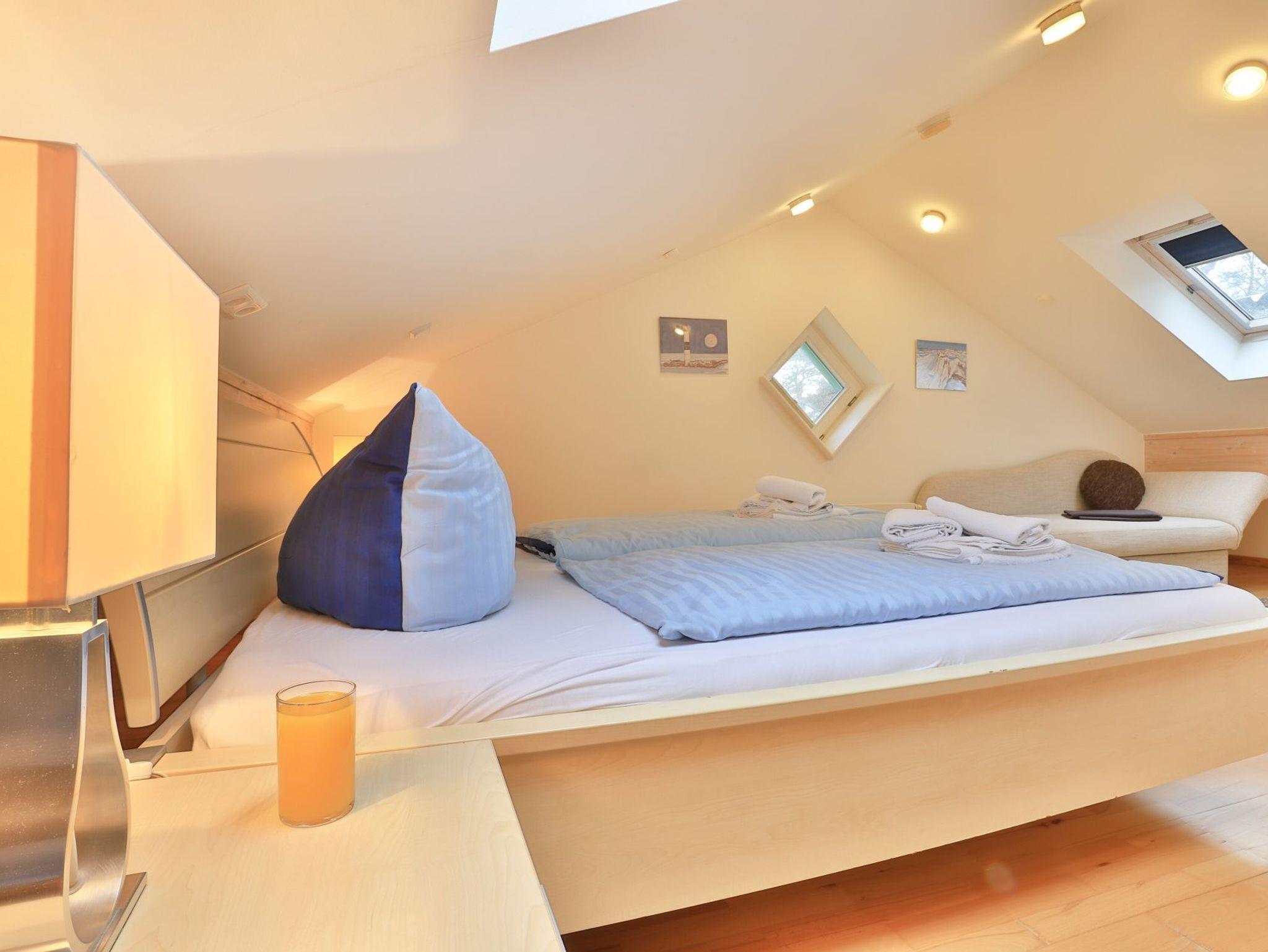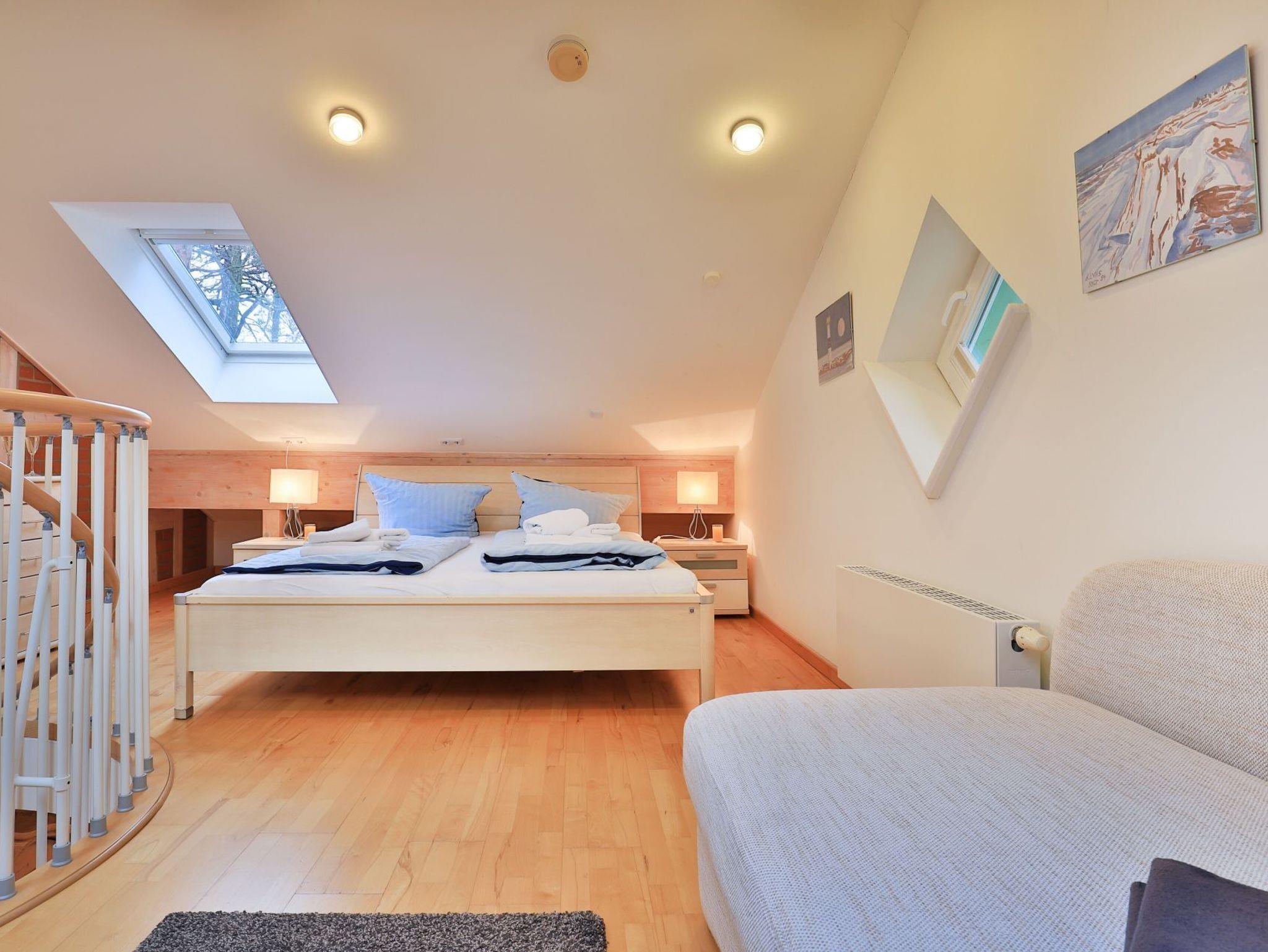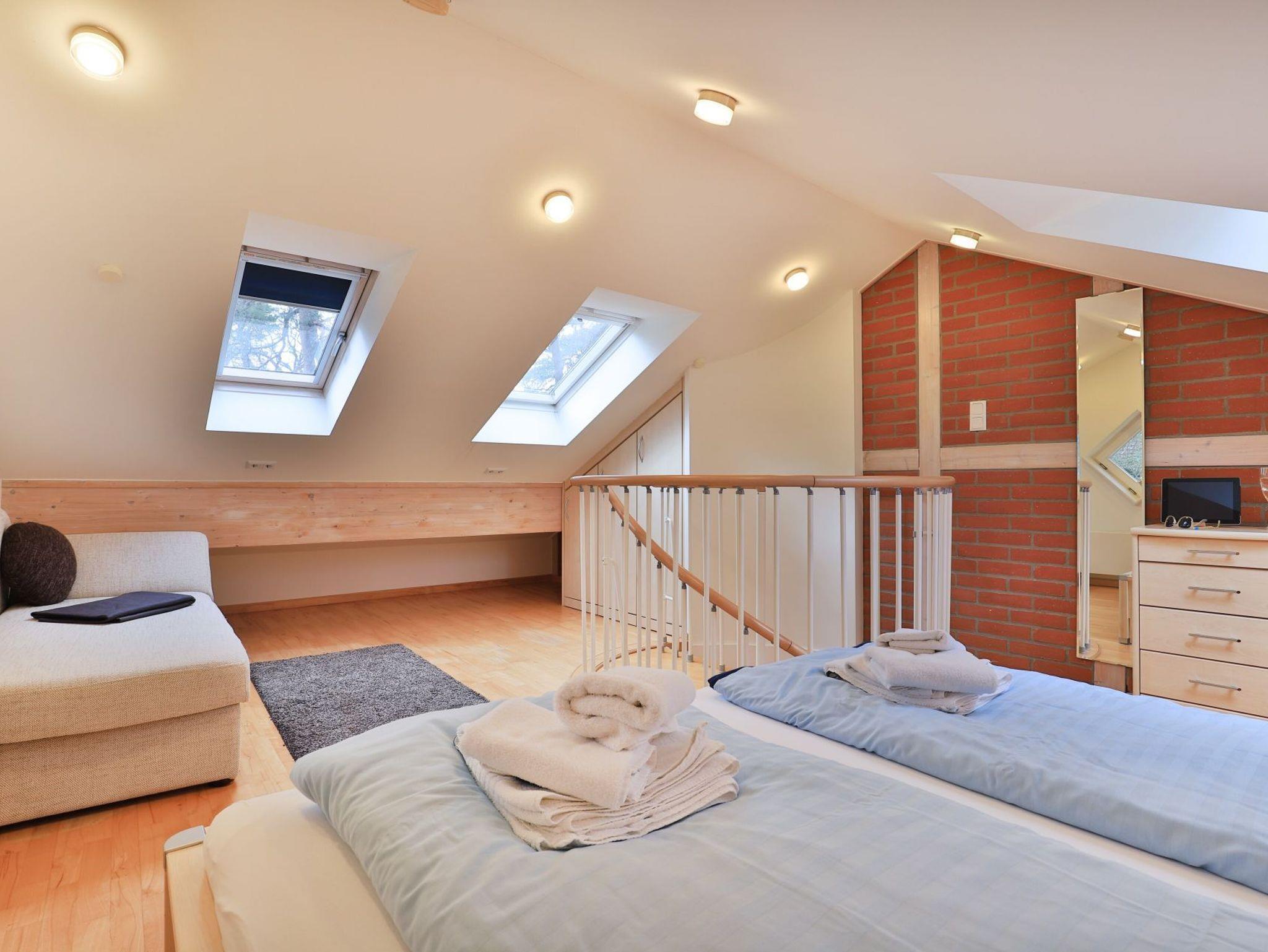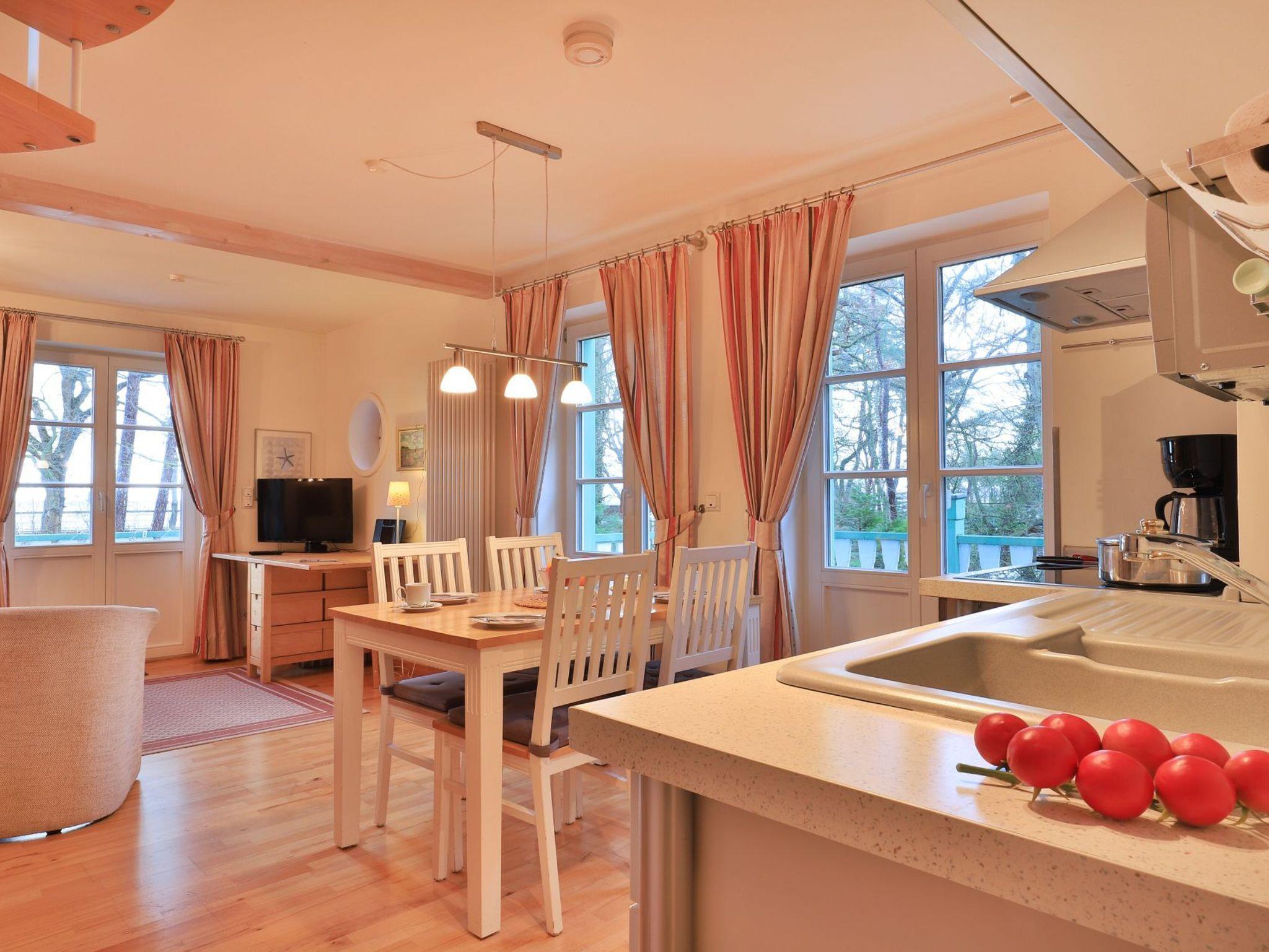 Die 2- Zimmer Meerblick Suite Seestern, mit zwei Balkonen, bietet eine großzügige Wohnfläche von 50qm und ist ideal für eine Belegung mit bis zu 4 Personen. Es handelt sich um eine Wohneinheit, die auch für Allergiker geeignet ist. Der Wohn-Essbereich ist sehr hochwertig mit einem Sofa als zusätzliche Schlafgelegenheit, zwei Sesseln sowie einem Esstisch möbliert. Musikanlage, Fernseher zudem gebührenfreies WLAN sind ebenfalls vorhanden. Die offene Einbauküche ermöglicht die Eigenversorgung mit: Ceranfeldherd, Backofen, Mikrowelle, Dunstabzug, Kaffeemaschine, Wasserkocher, Toaster u.v.m. Ihre Urlaubsmahlzeiten nehmen Sie am Esstisch zu sich, oder Sie finden Ihren Lieblingsplatz mit Ostseeblick auf den beiden, saisonal möblierten Balkonen. Über eine Wendeltreppe erreichen Sie die offene Schlafgalerie mit Doppelbett, kleinem Schrank und Kommode. Des Weiteren bietet hier eine Récamiere eine weitere Schlafmöglichkeit. Bei Anreise sind Ihre Betten bereits für Sie bezogen und Handtücher liegen bereit.