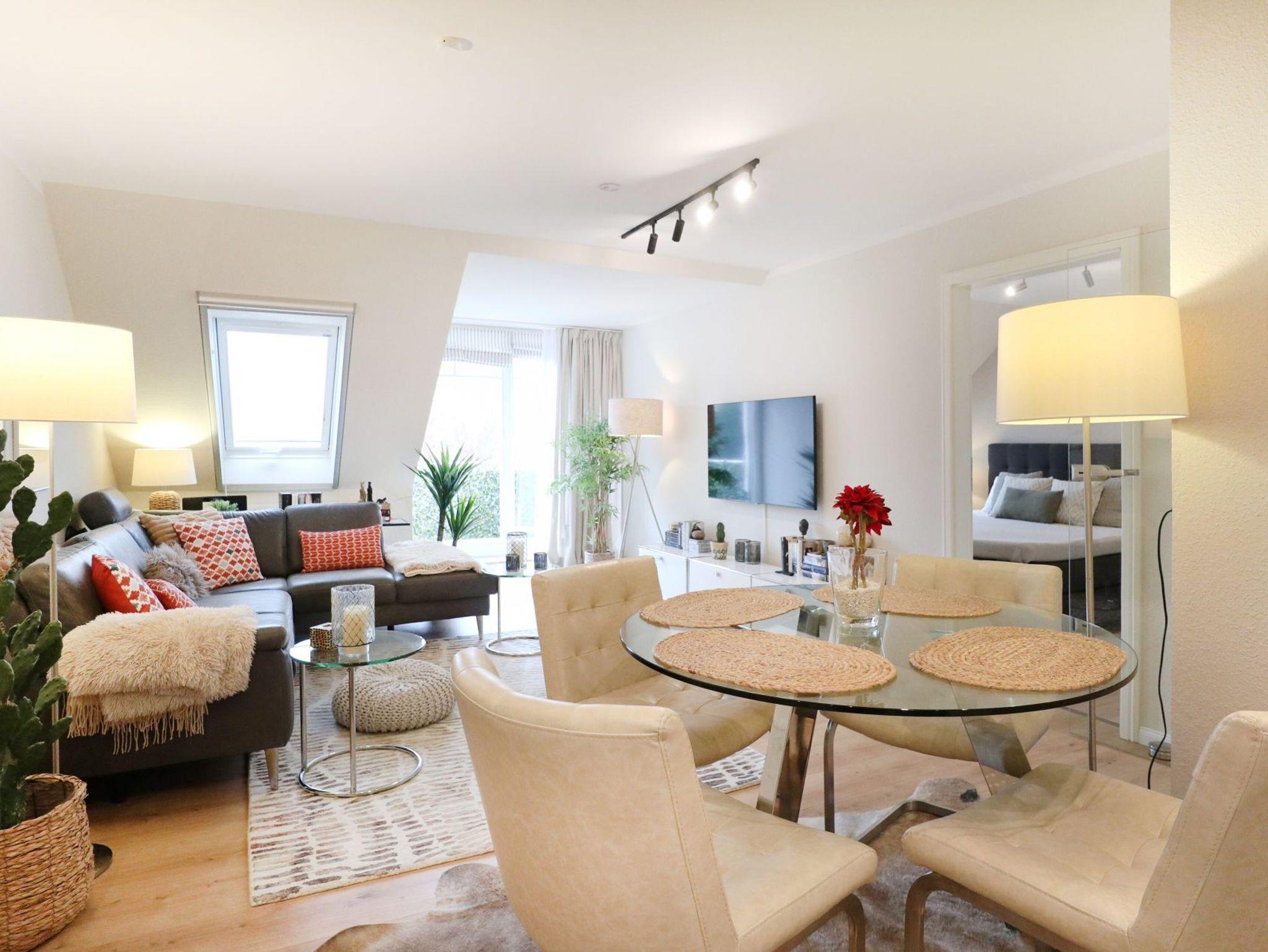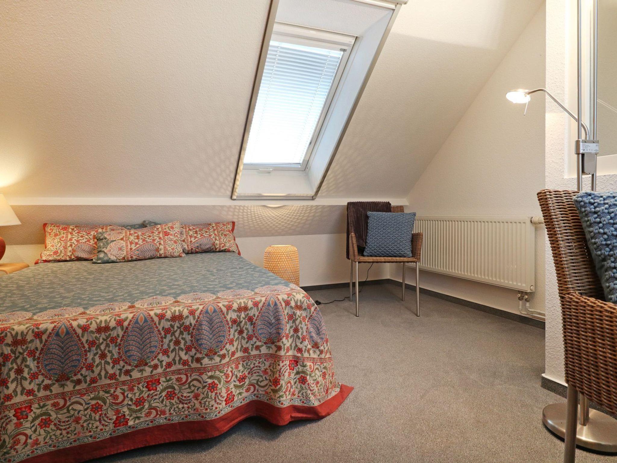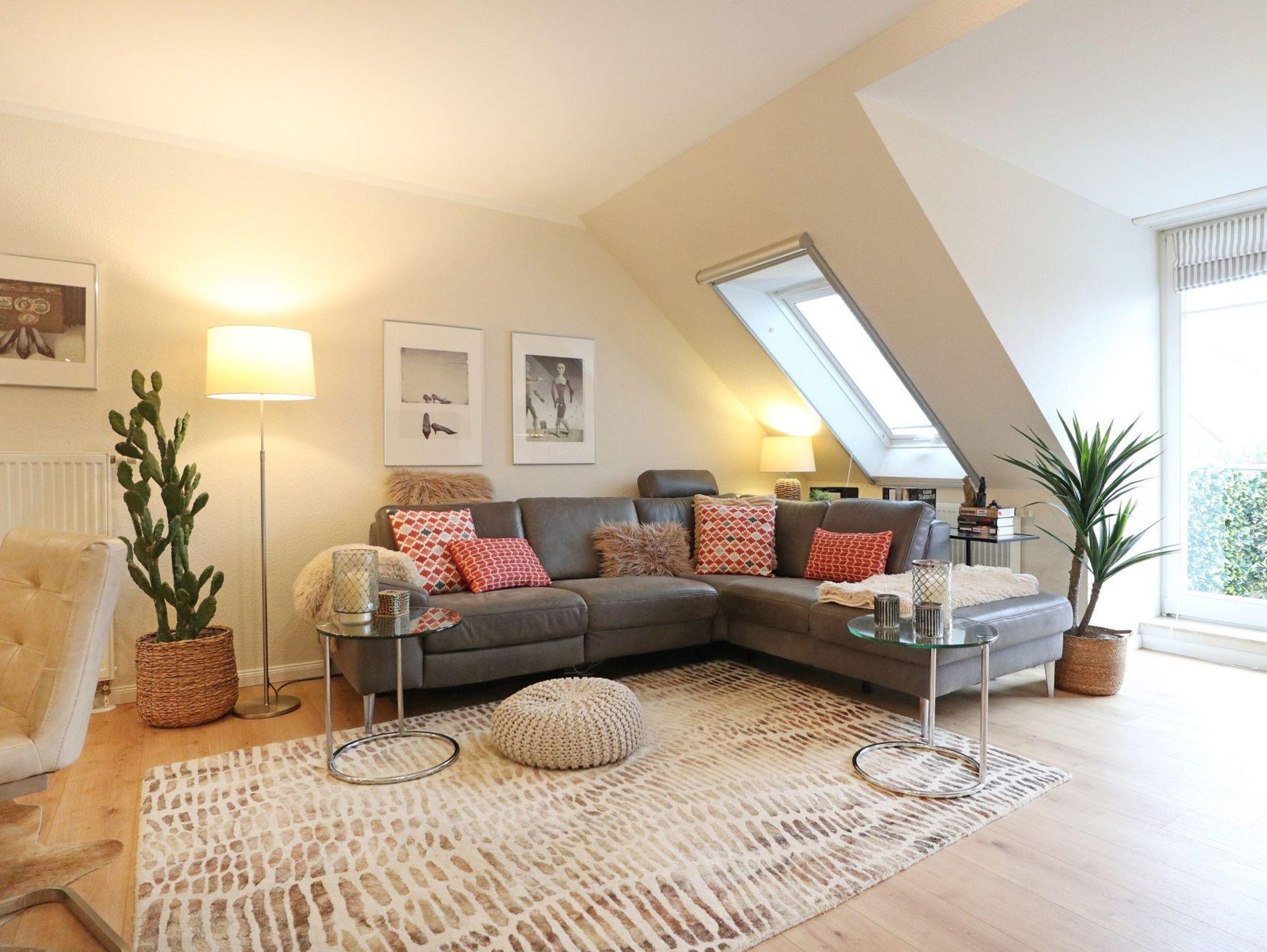 Diese strandnahe 3-Zimmer-Maisonette -Wohnung im 1. Obergeschoss erstreckt sich über zwei Ebenen und bietet auf ca. 70 qm viel Platz für bis zu vier Personen. Sie überzeugt durch ihre angenehme Raumaufteilung sowie zwei Balkone. Der geschmackvoll eingerichtete Wohn- und Essbereich lädt zum Entspannen ein und ist mit Fernseher, Musikanlage sowie kostenfreiem WLAN ausgestattet. Die offen integrierte, voll ausgestattete Küchenzeile ermöglicht eine komfortable Selbstversorgung mit Herd, Backofen, Mikrowelle, Kühlschrank mit Frostfach, Geschirrspüler, Kaffeemaschine, Toaster und Wasserkocher. Zwei saisonal möblierte Balkone in östlicher sowie südwestlicher Ausrichtung bieten ideale Möglichkeiten zur Erholung im Freien. Die Ferienwohnung verfügt über zwei separate Schlafzimmer, eines mit Doppelbett und eines mit Schlafsofa (1,40 m x 2,00 m), sowie ein Vollbad mit Wanne, Dusche und Föhn. Eine Waschmaschine, ein Bügeleisen und ein Bügelbrett stehen ebenfalls zur Verfügung. Ein Pkw-Außenstellplatz befindet sich direkt vor dem Haus.