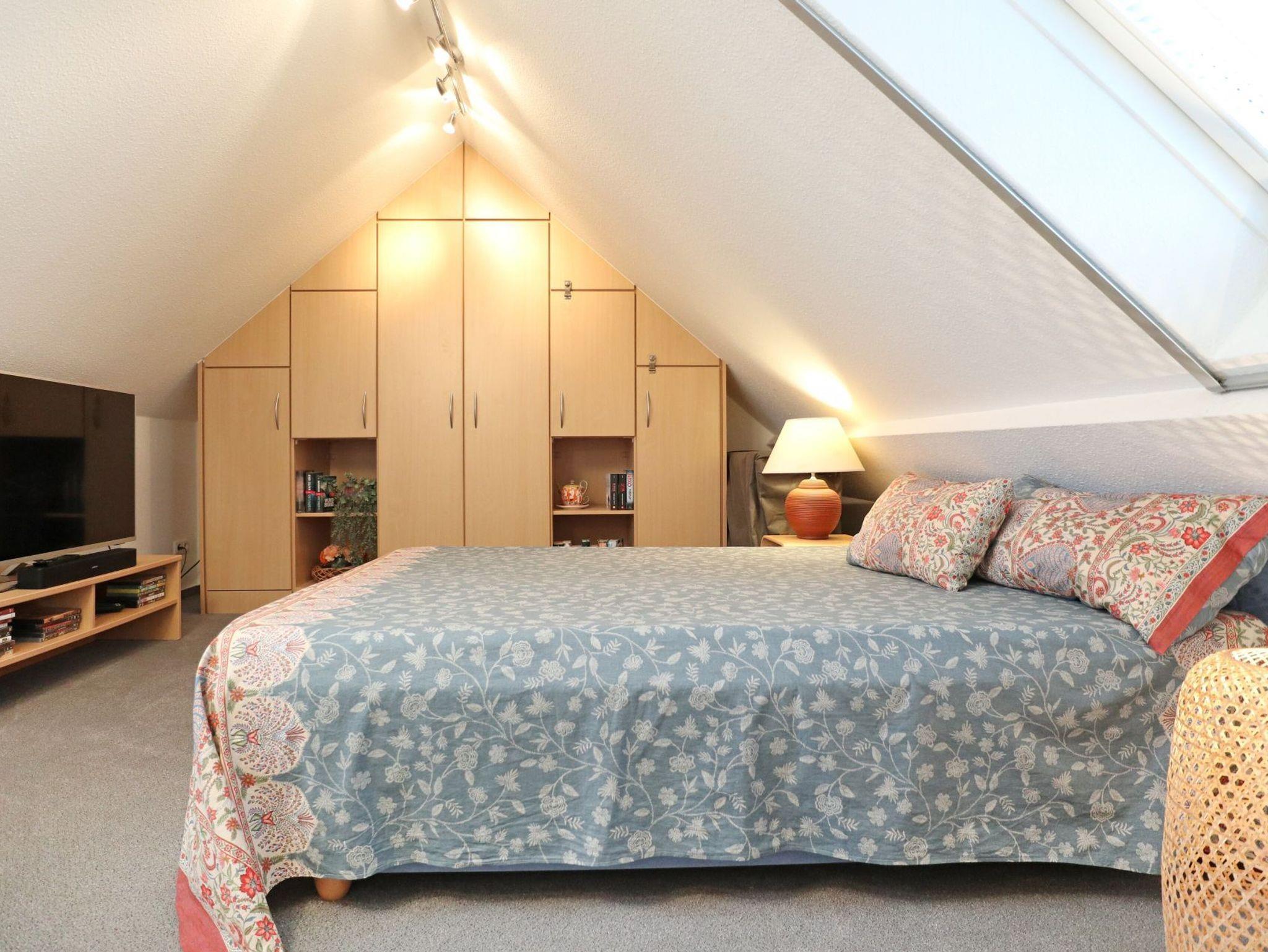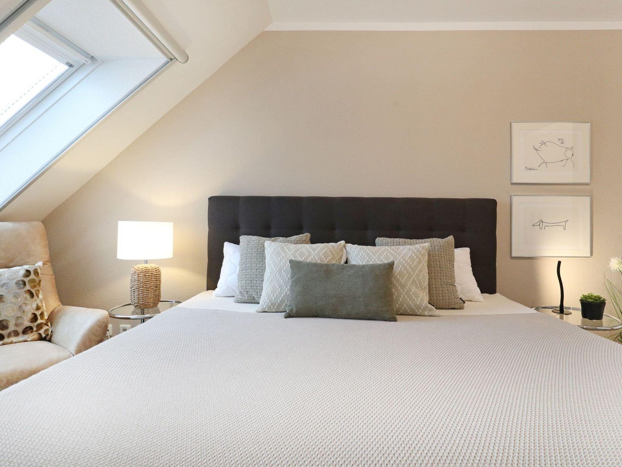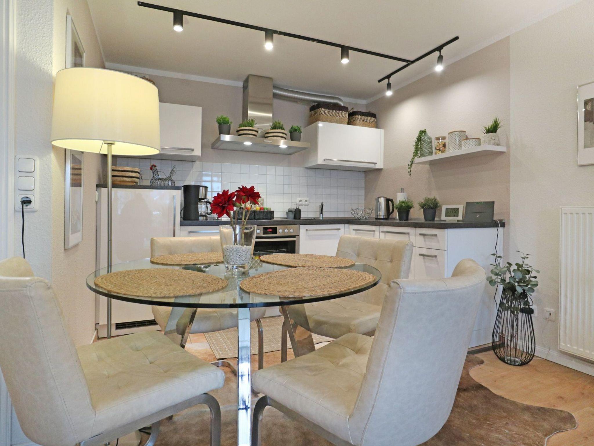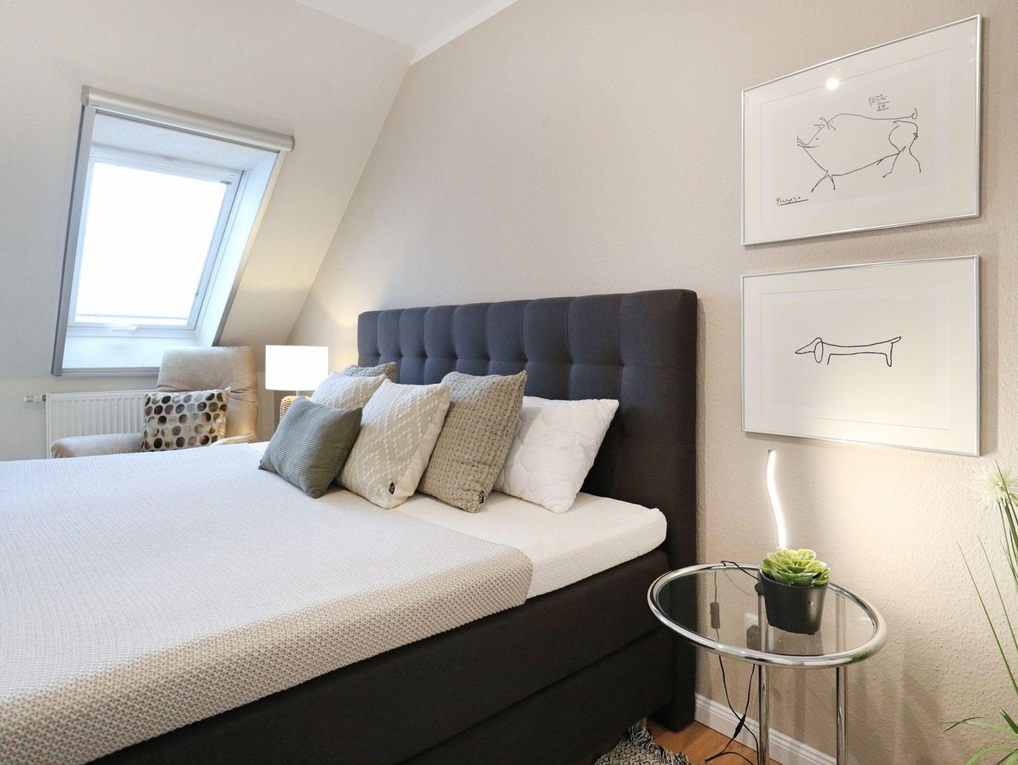 Diese strandnahe 3-Zimmer-Maisonette -Wohnung im 1. Obergeschoss erstreckt sich über zwei Ebenen und bietet auf ca. 70 qm viel Platz für bis zu vier Personen. Sie überzeugt durch ihre angenehme Raumaufteilung sowie zwei Balkone. Der geschmackvoll eingerichtete Wohn- und Essbereich lädt zum Entspannen ein und ist mit Fernseher, Musikanlage sowie kostenfreiem WLAN ausgestattet. Die offen integrierte, voll ausgestattete Küchenzeile ermöglicht eine komfortable Selbstversorgung mit Herd, Backofen, Mikrowelle, Kühlschrank mit Frostfach, Geschirrspüler, Kaffeemaschine, Toaster und Wasserkocher. Zwei saisonal möblierte Balkone in östlicher sowie südwestlicher Ausrichtung bieten ideale Möglichkeiten zur Erholung im Freien. Die Ferienwohnung verfügt über zwei separate Schlafzimmer, eines mit Doppelbett und eines mit Schlafsofa (1,40 m x 2,00 m), sowie ein Vollbad mit Wanne, Dusche und Föhn. Eine Waschmaschine, ein Bügeleisen und ein Bügelbrett stehen ebenfalls zur Verfügung. Ein Pkw-Außenstellplatz befindet sich direkt vor dem Haus.