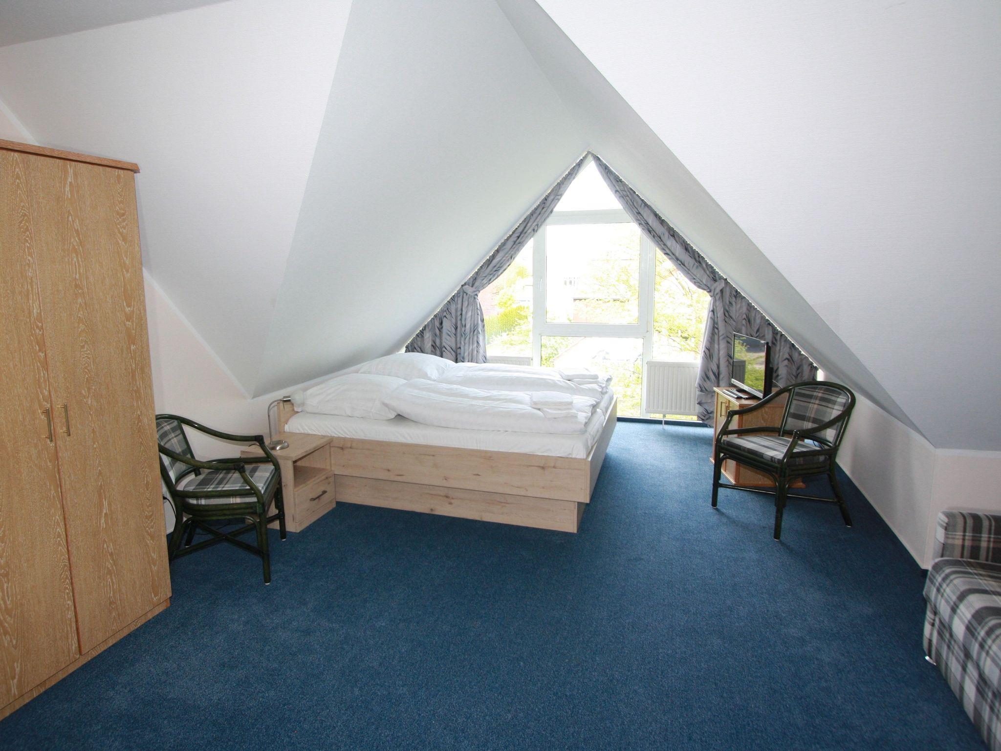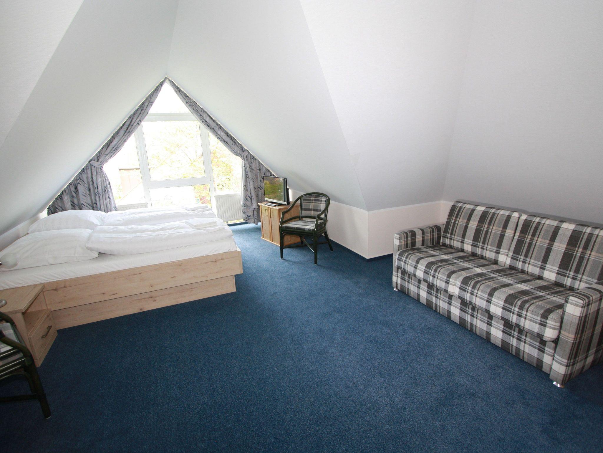 Dachgeschoss. Schlafzimmer mit Doppelbett, Wohn-Schlafraum mit bequemer Doppelbettcouch, separater
