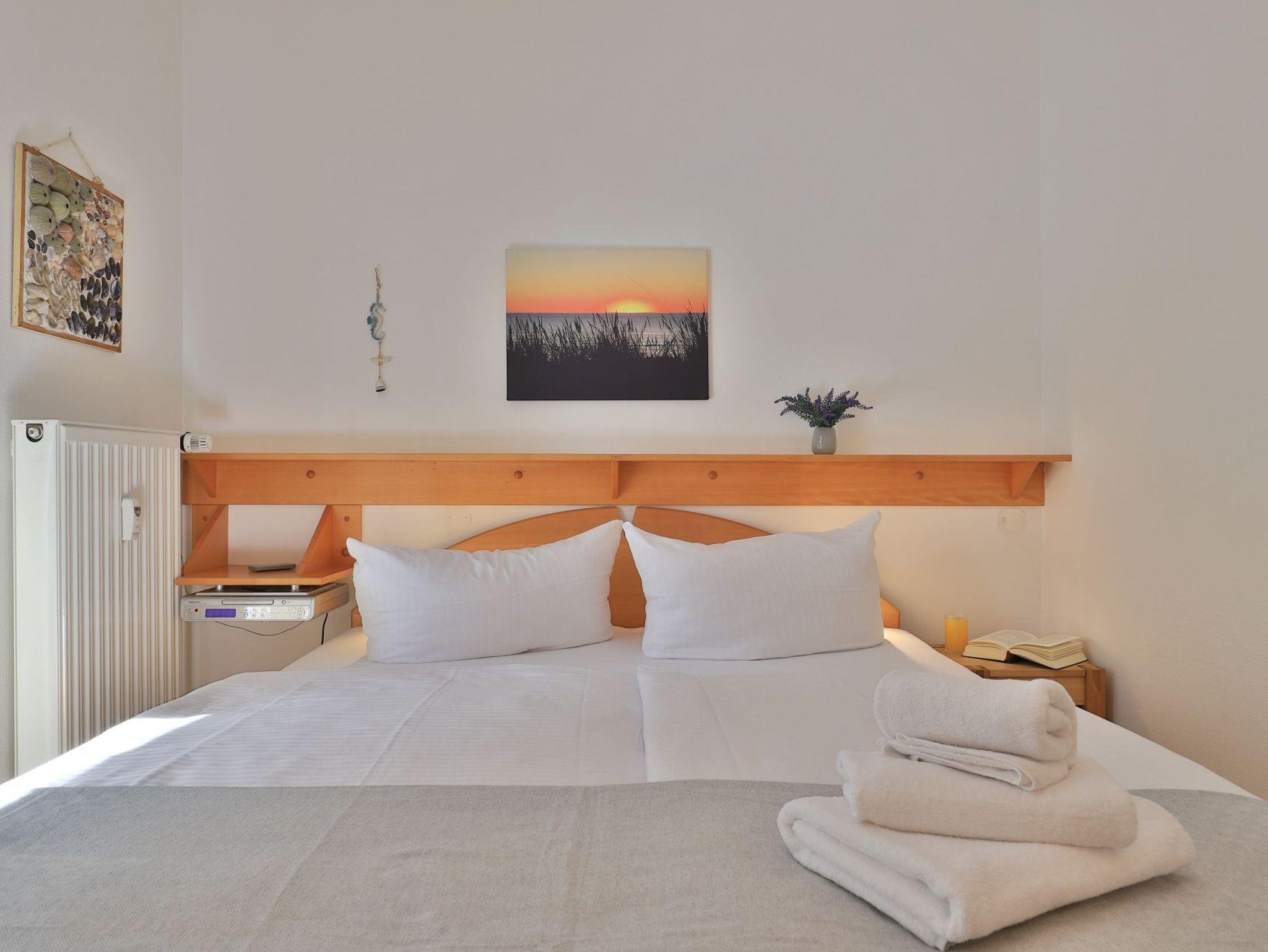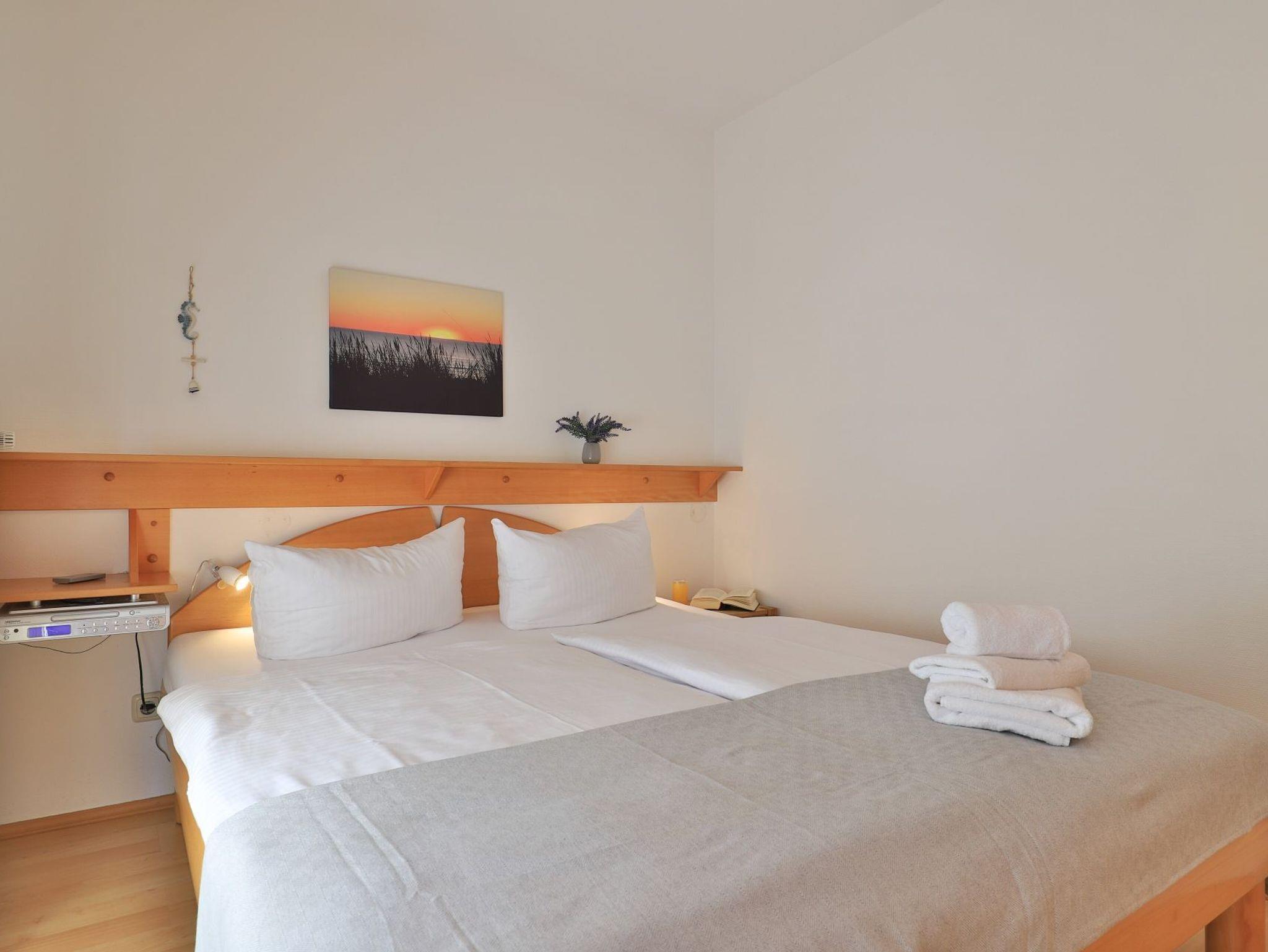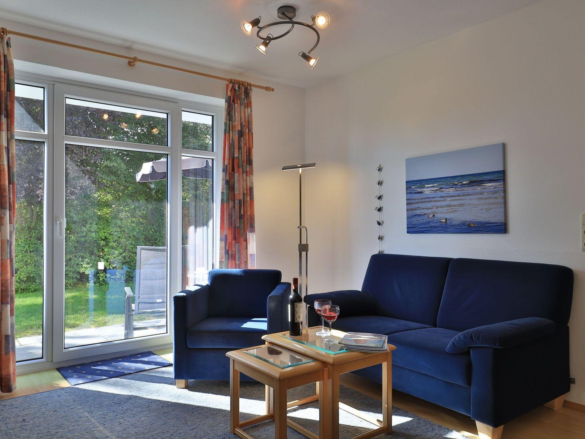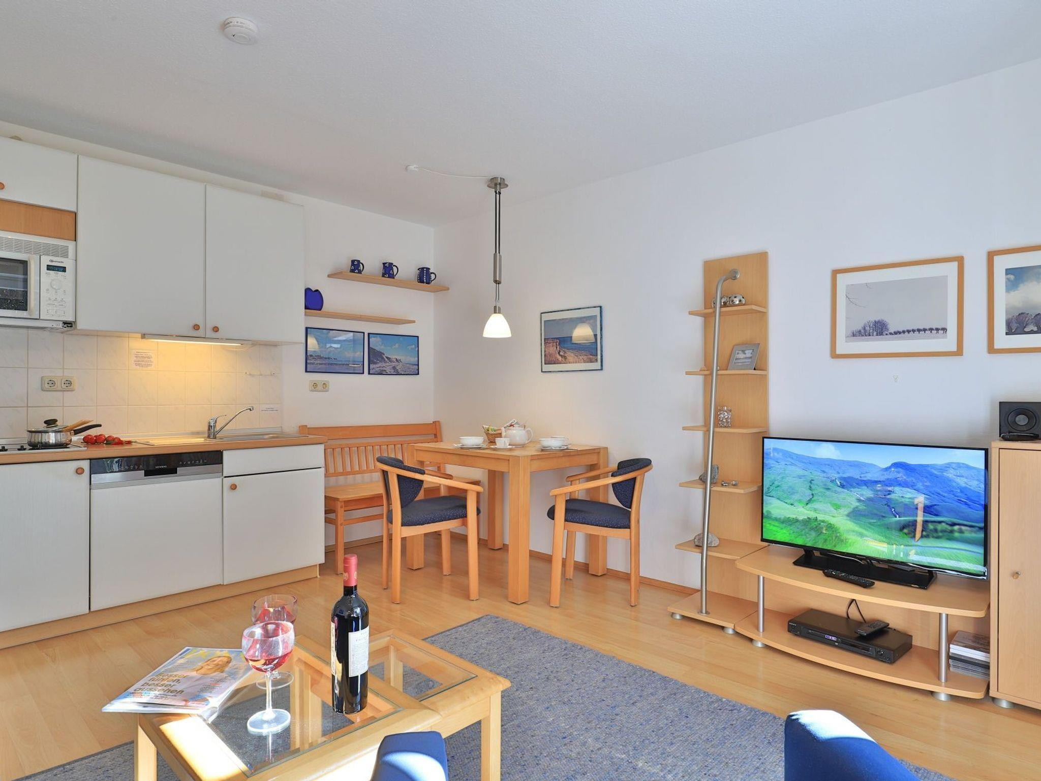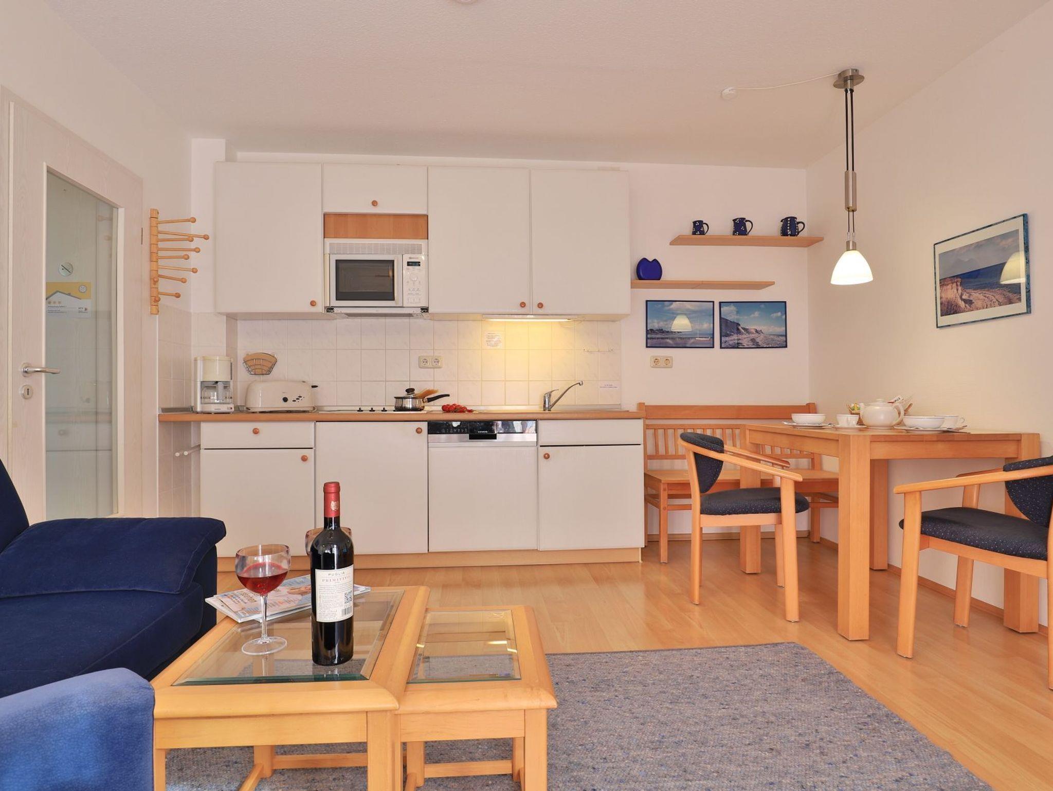 Das mit drei Sternen klassifizierte 2-Zimmer-Ferienappartement liegt im Erdgeschoss des Hauses und verwöhnt mit einer sonnigen Terrasse und Aussicht auf die Haffwiesen. Die Wohnfläche ist mit 38qm für eine maximale Belegung mit bis zu 2 Gästen ausgerichtet. Der behaglich möblierte Wohn-/Essbereich empfängt Sie mit einem ausziehbaren Sofa, welches zwei Schlafmöglichkeiten bietet.