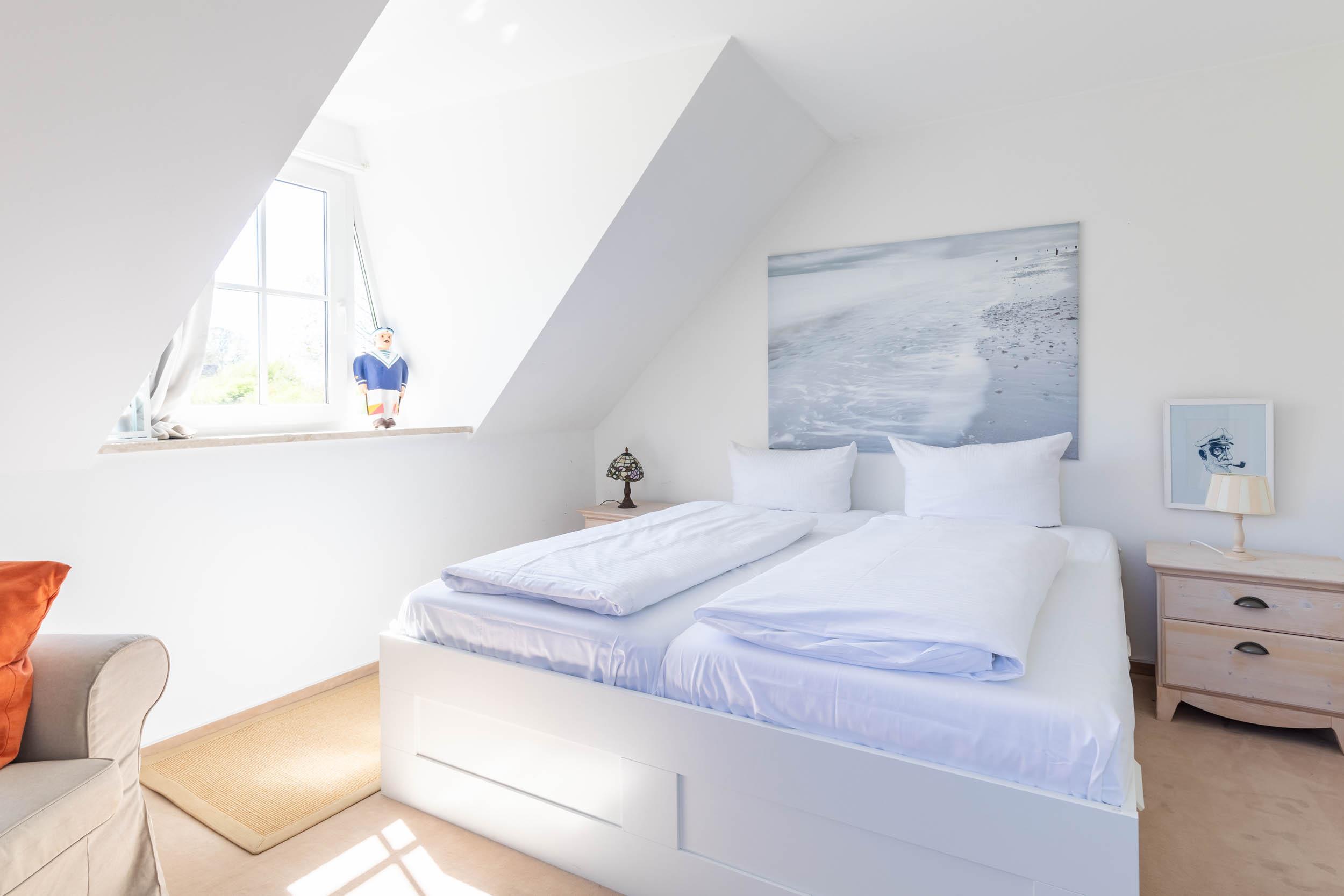 Das vierte Schlafzimmer liegt im Dachgeschoss, es ist mit einem französischen Doppelbett (140x200cm), einem kleinen Kleiderschrank sowie SAT-TV ausgestattet.