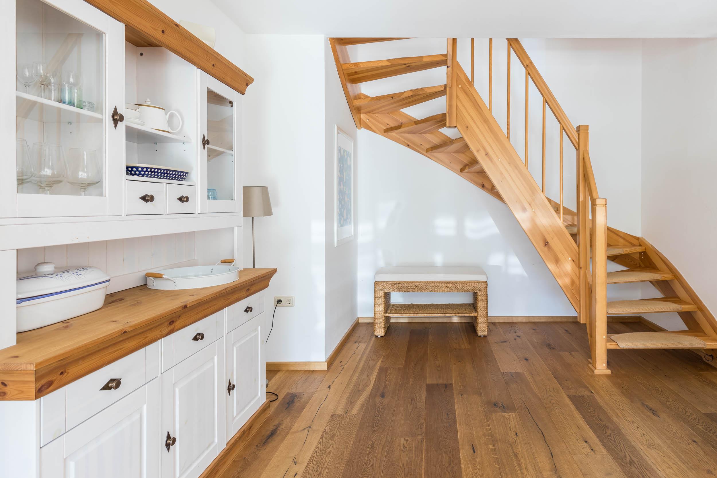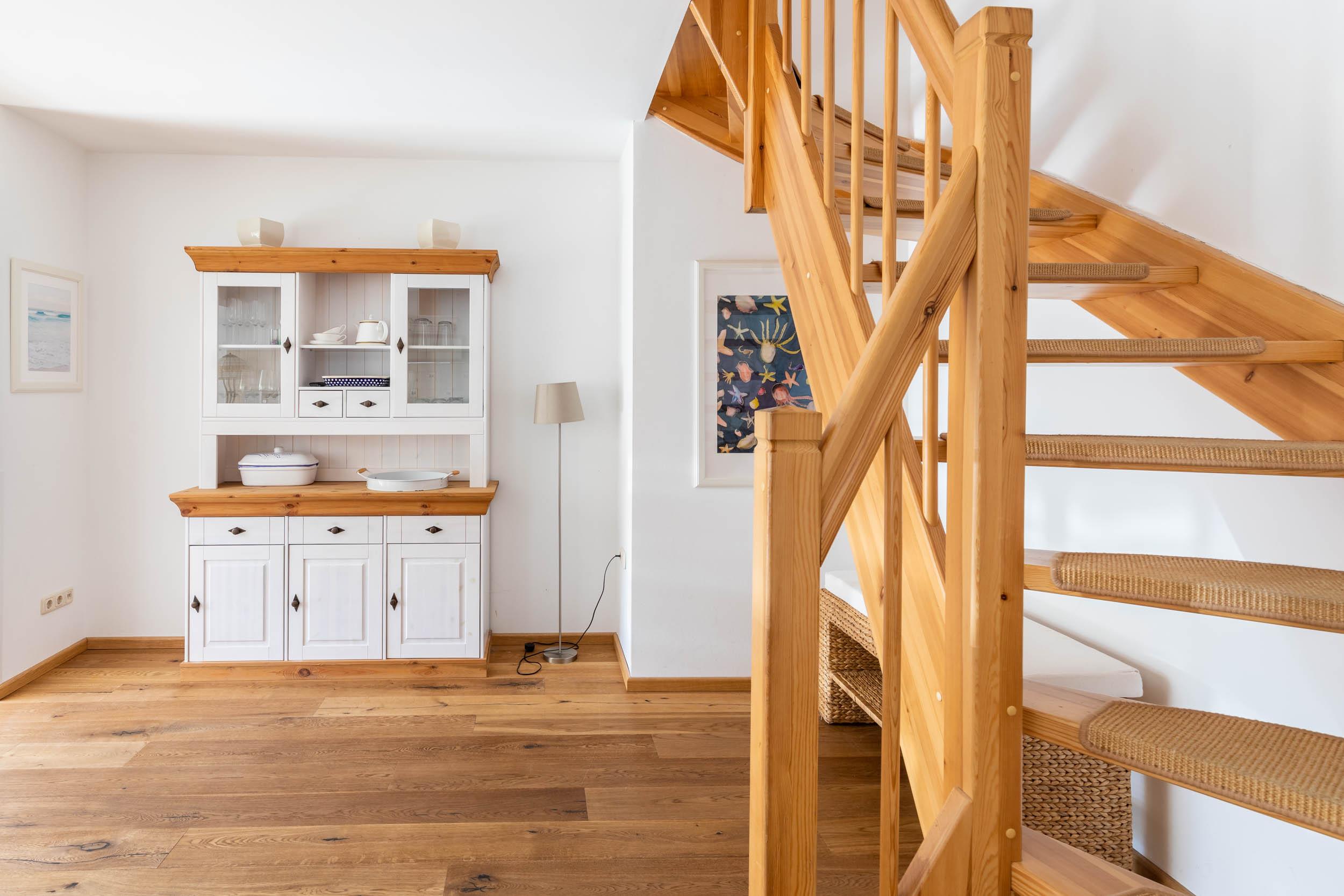Im 1. Obergeschoss finden Sie zwei weitere Schlafräume mit jeweils einem Doppelbett (1 x 155x200cm sowie 1 x 180x200cm), Kleiderschrank und Sitzmöbel. Weiterhin befindet sich in einem dieser Schlafräume ein Schreibtisch.