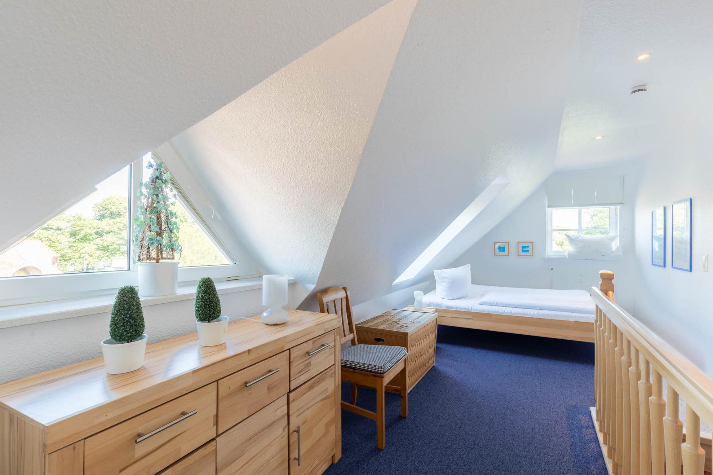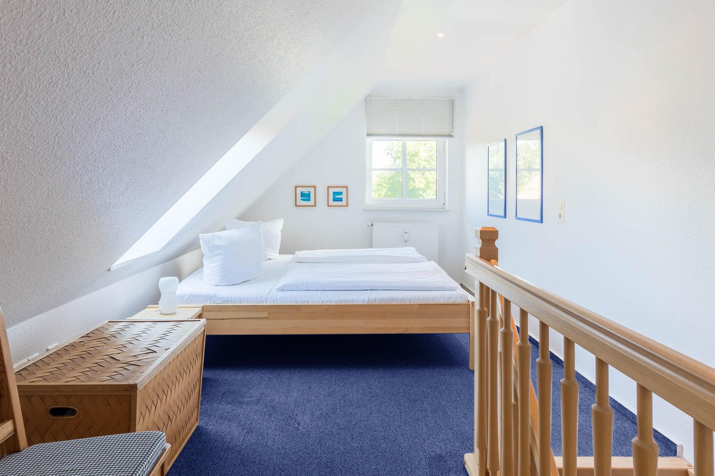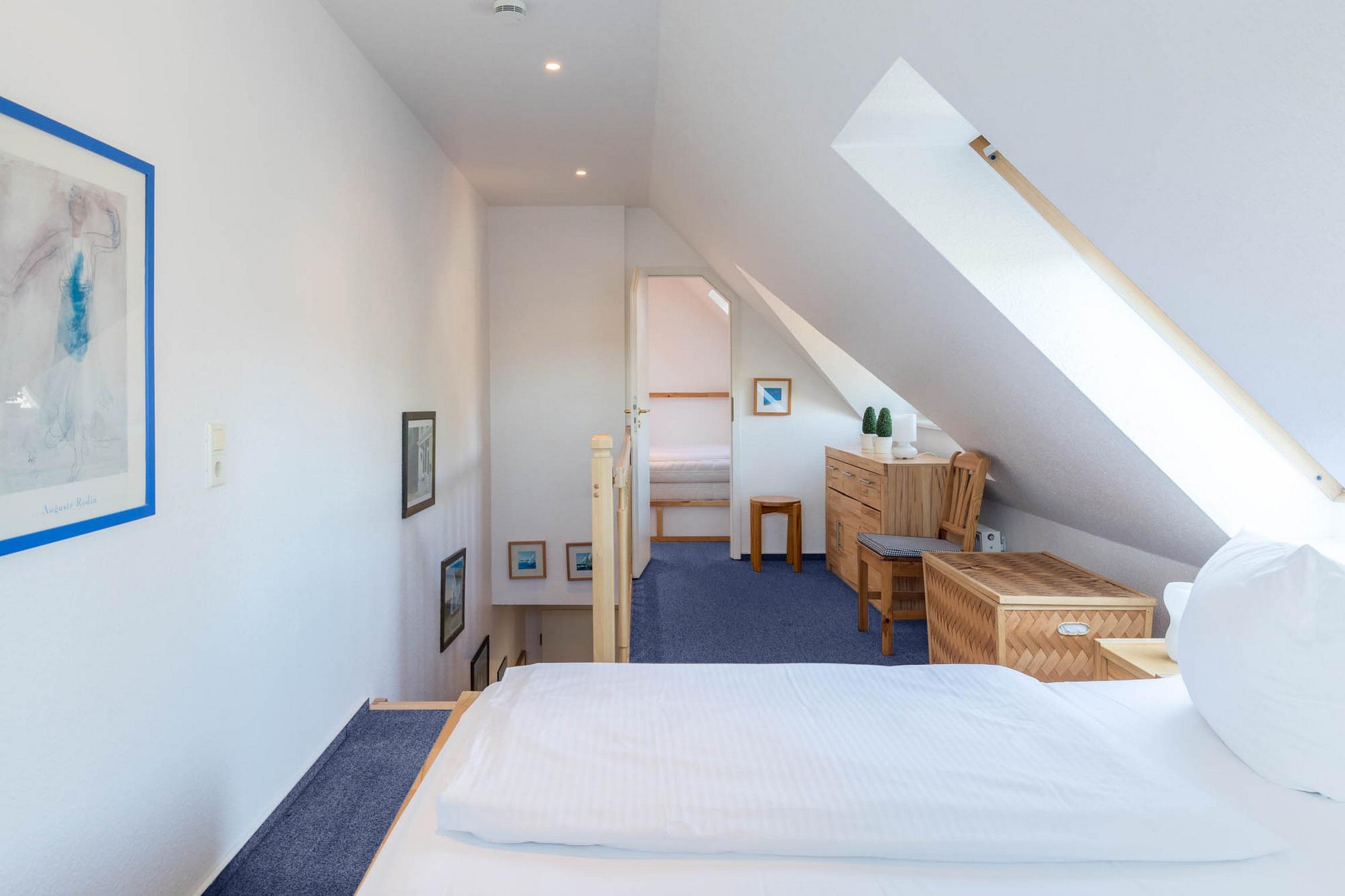 In der zweiten Ebene, im Dachgeschoss, erreichbar durch eine Holztreppe vom Wohnungsflur aus, sorgen die schrägen Decken für Gemütlichkeit. Hier können Sie in der offenen Schlafgalerie in Urlaubsträumen schlummern. Ein großes Doppelbett (200x200cm, getrennte Matratzen) sowie eine Kommode stehen bereit.