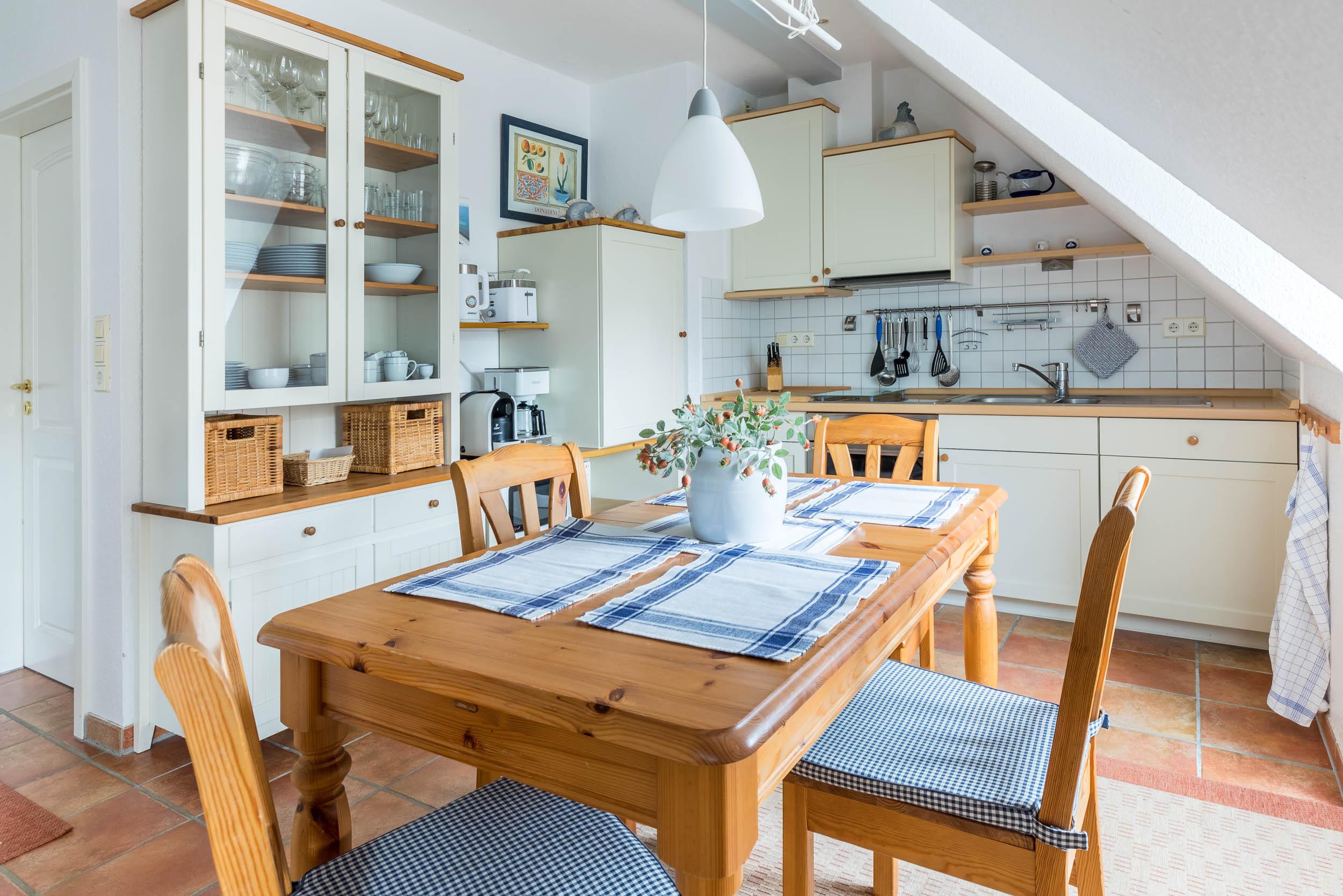 Eine modern eingerichtete Wohnküche mit Essecke in dem unteren Bereich der Wohnung lässt keine Wünsche offen. Mikrowelle, Backofen und Cerankochfeld gehören ebenso dazu wie Kühlschrank, Toaster, Kaffeemaschine, reichhaltiges Geschirr und Besteck.