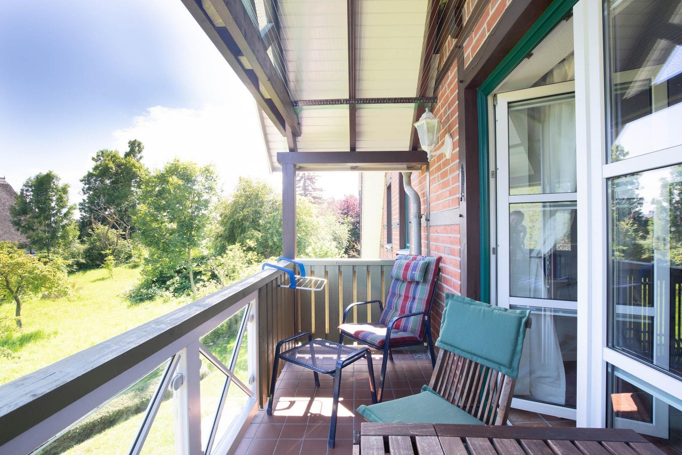 In der gemütlichen und liebevoll eingerichteten Wohnbereich mit SAT-TV bieten eine ausziehbare Schlafcouch und ein Sessel Entspannung. Von hier aus gelangen Sie auch auf den möblierten Südost-Balkon.