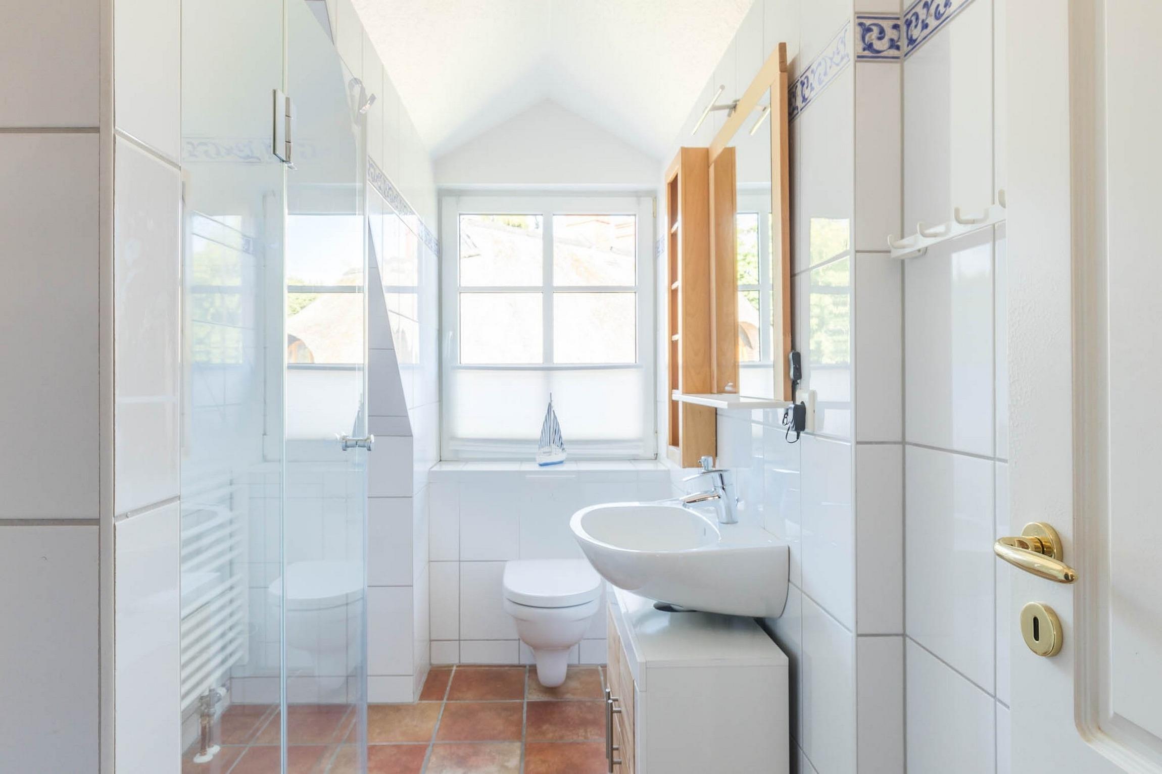 Das saubere Bad mit Tageslichtfenster besteht aus moderner Duschkabine (Einstiegshöhe 27cm), Waschtisch und WC.