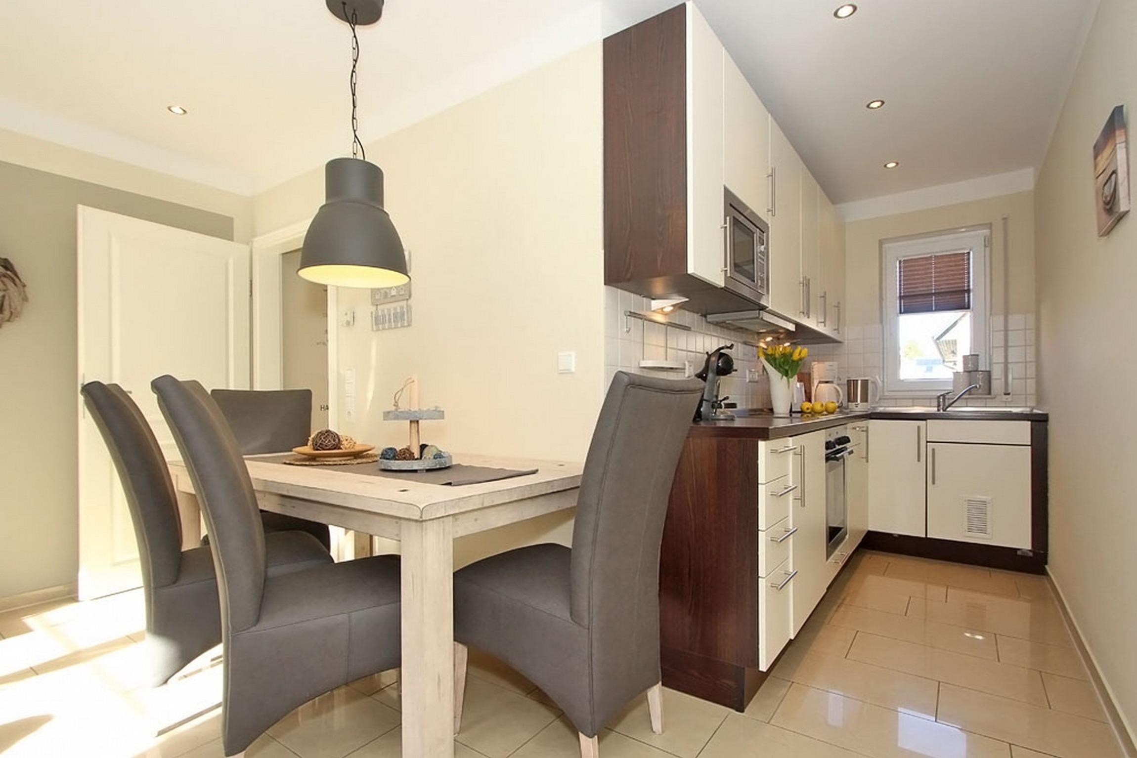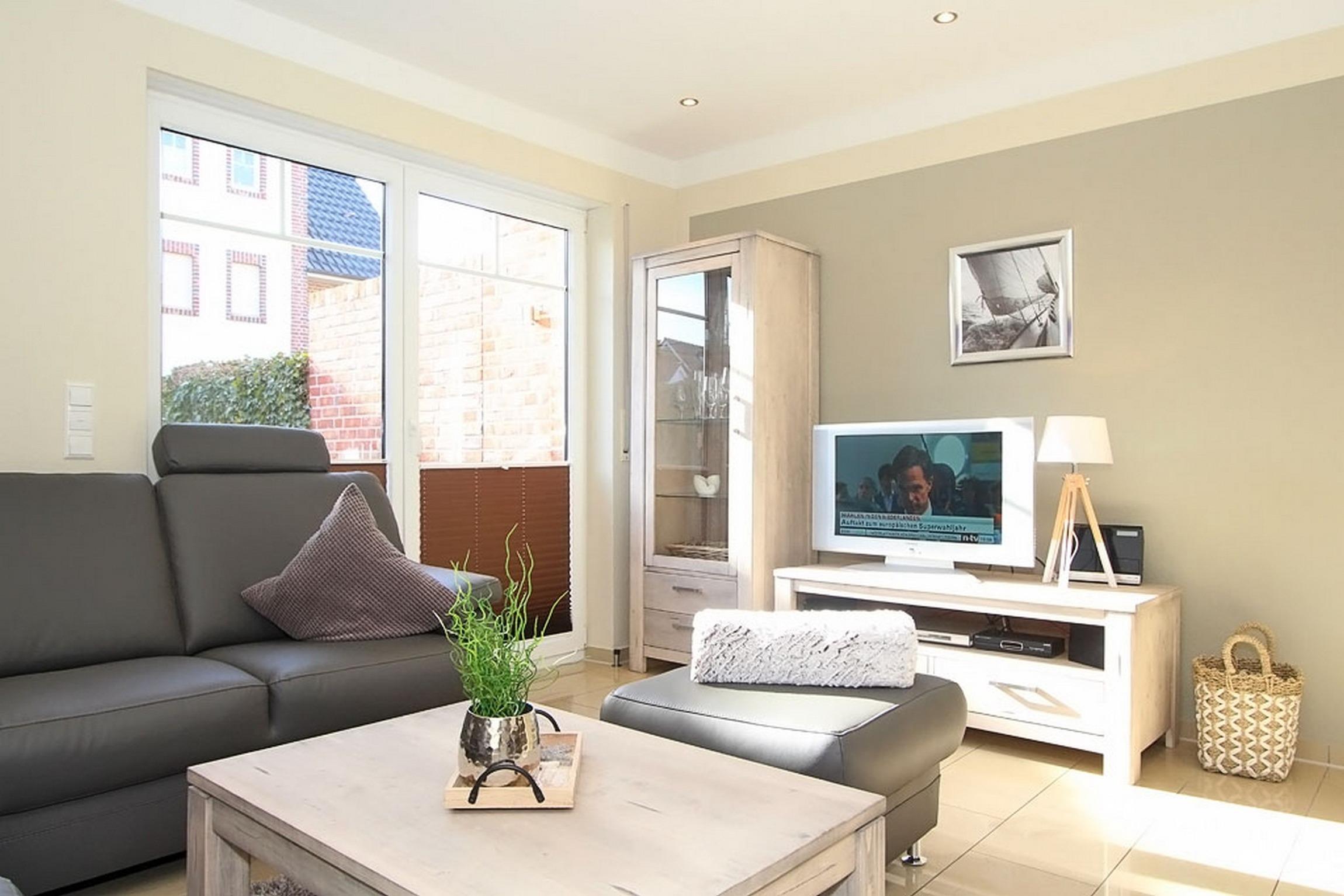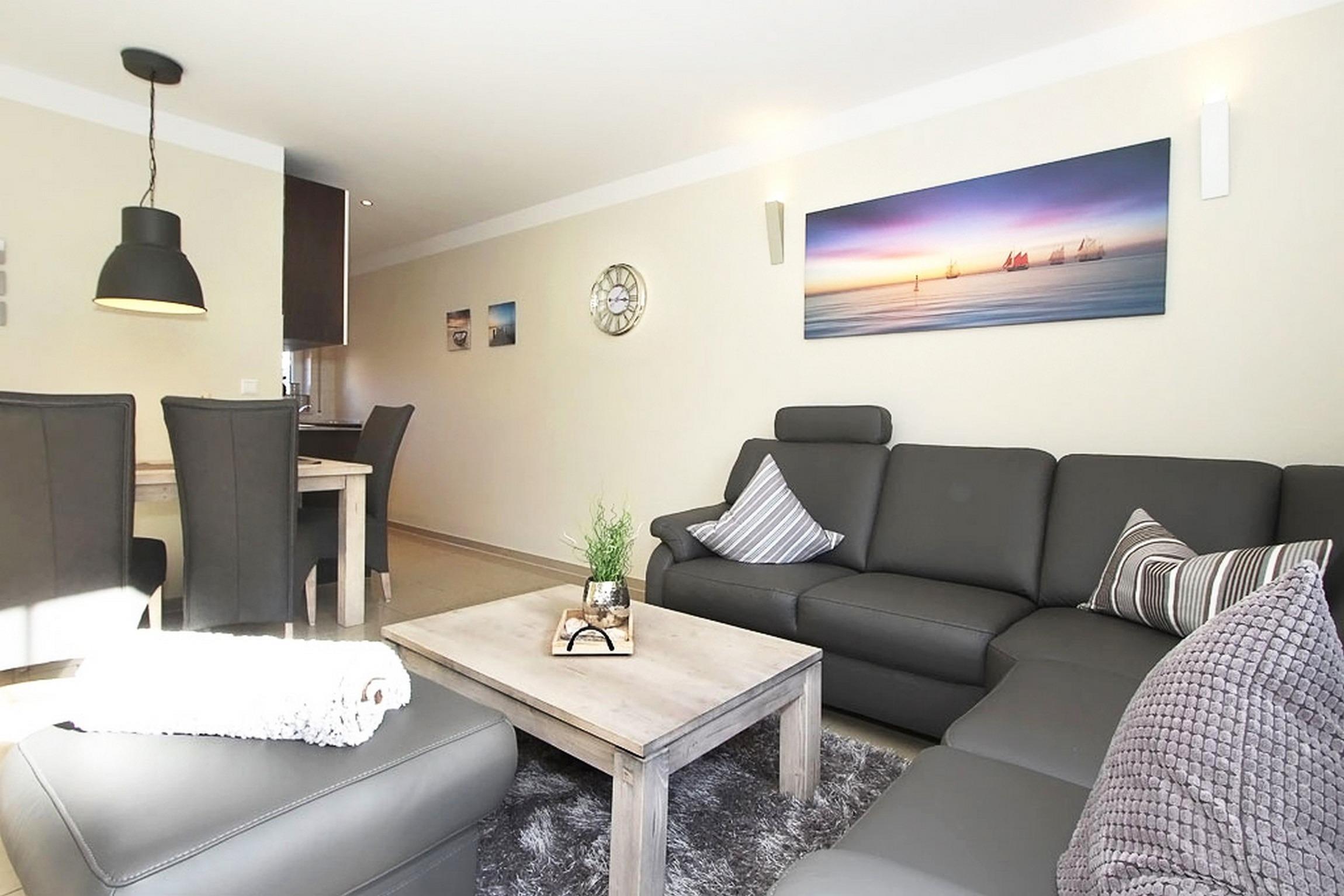 Im Wohnbereich steht Ihnen neben dem bequemen Ledersofa auch ein SAT-TV, DVD-Player sowie eine kleine Musikanlage zur Verfügung. Ein Reisebettchen könnte hier bei Bedarf auch aufgestellt werden. Die Essecke für bis zu vier Gäste kann für gemeinsame Mahlzeiten genutzt werden.