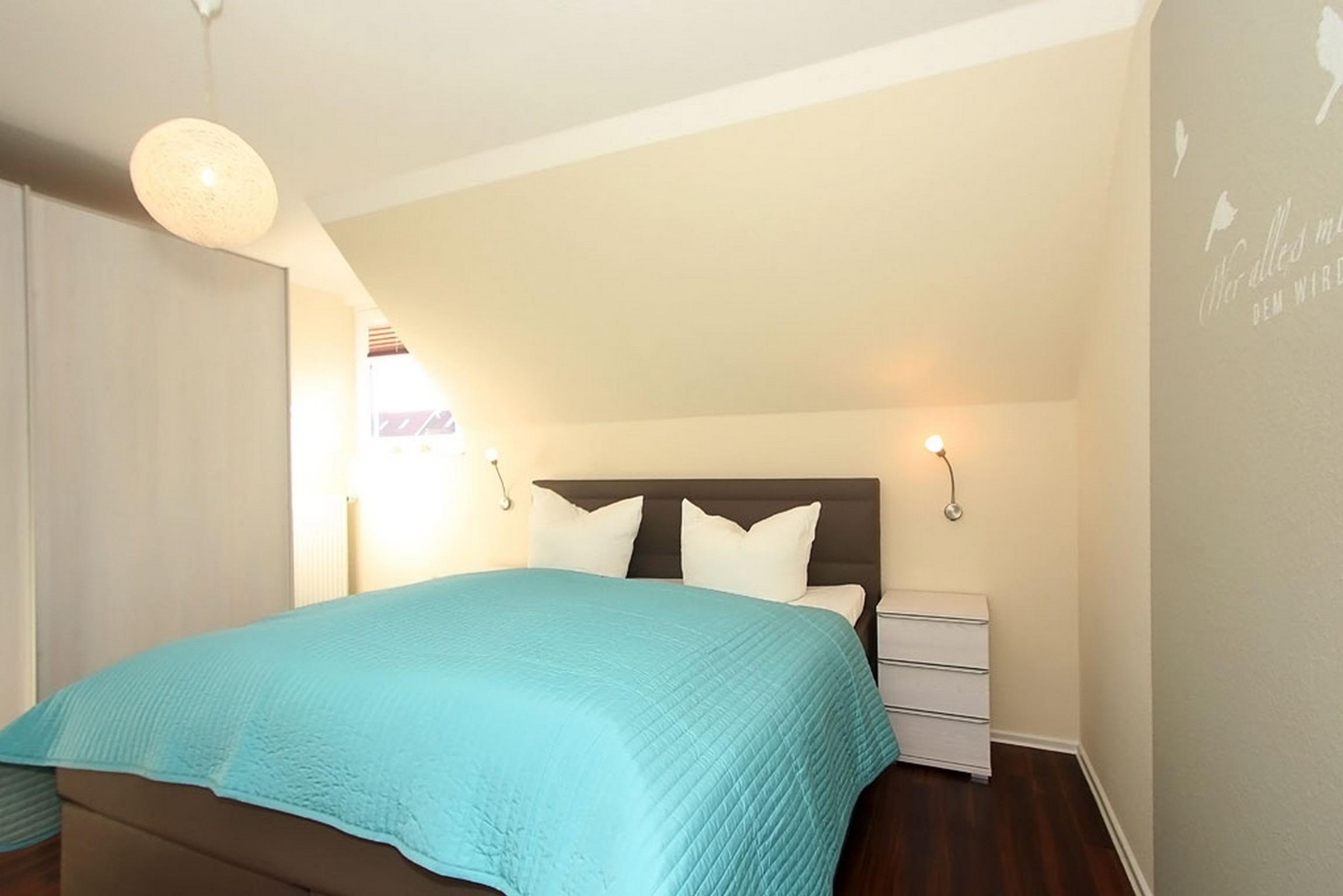 Die dritte Wohnebene, im DG, welche Sie über eine offene Holztreppe mit Treppenschutzgitter (oben) erreichen, ist mit einem weiteren Schlafzimmer mit zwei Einzelbetten (je 90x200cm), einer Kommode und SAT-TV ausgestattet. Ein Reisebettchen könnte hier bei Bedarf auch aufgestellt werden.