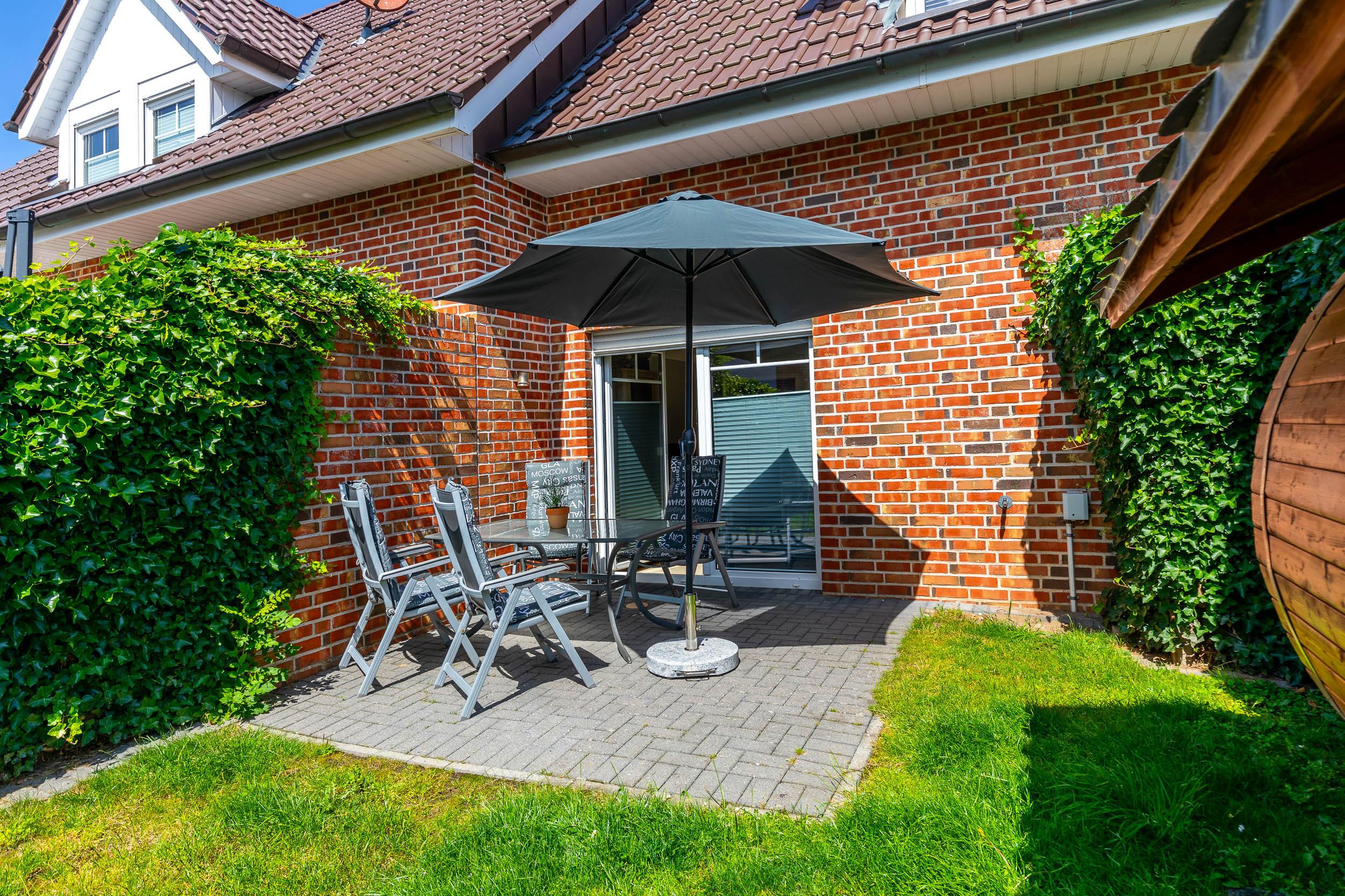 Die Gartenmöbel auf der Südwest-Terrasse sind mit passenden Bezügen ausgestattet, was den Komfort zusätzlich erhöht.