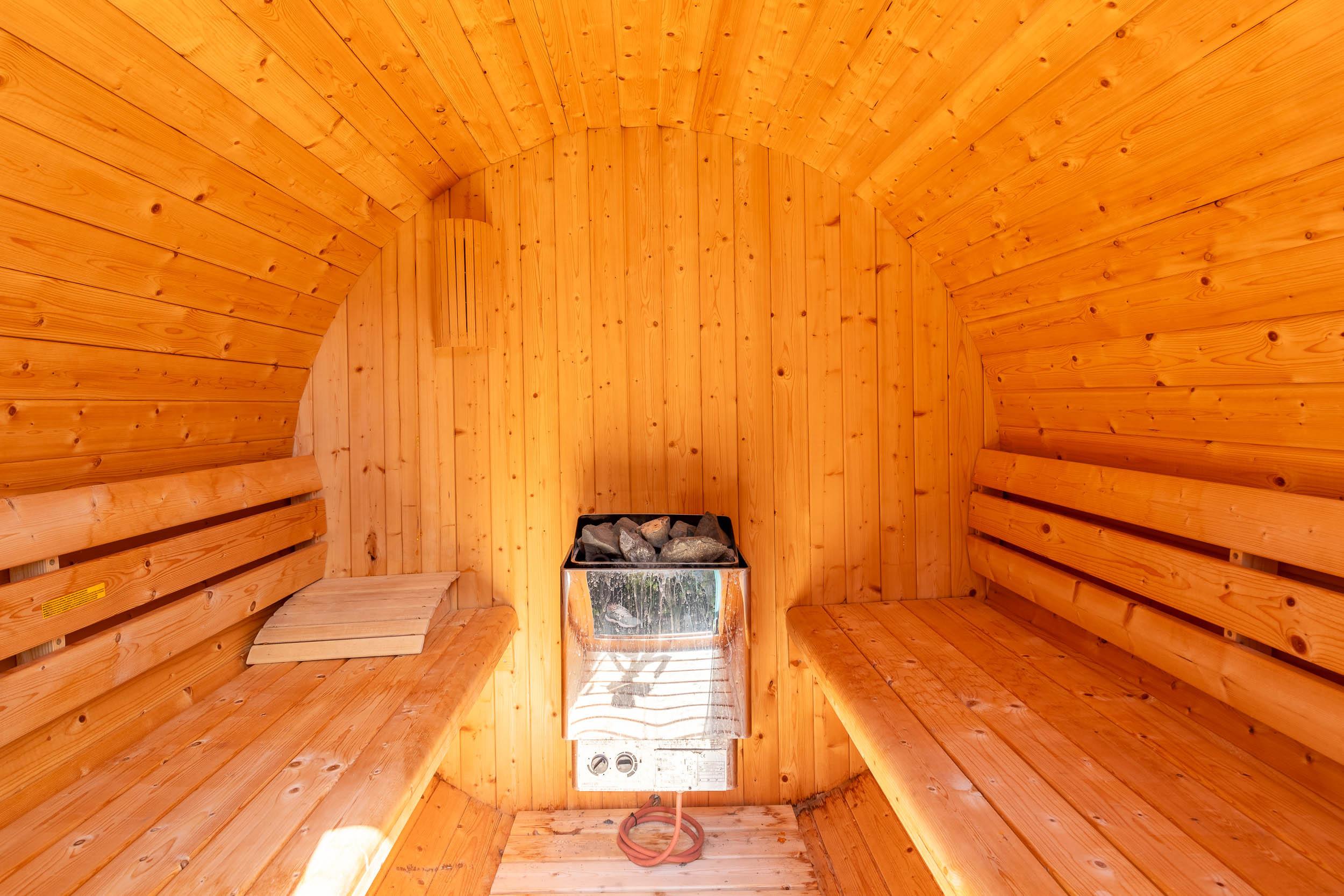 Die Fass-Sauna, welche sich auf dem hauseigenen Grundstück zwischen Haus 1 und 1a befindet, kann sowohl von den Gästen von Haus 1 als auch von den Gäste von Haus 1A kostenfrei genutzt werden. Gleichzeitig trennt die Sauna beide Grundstücke voneinander.