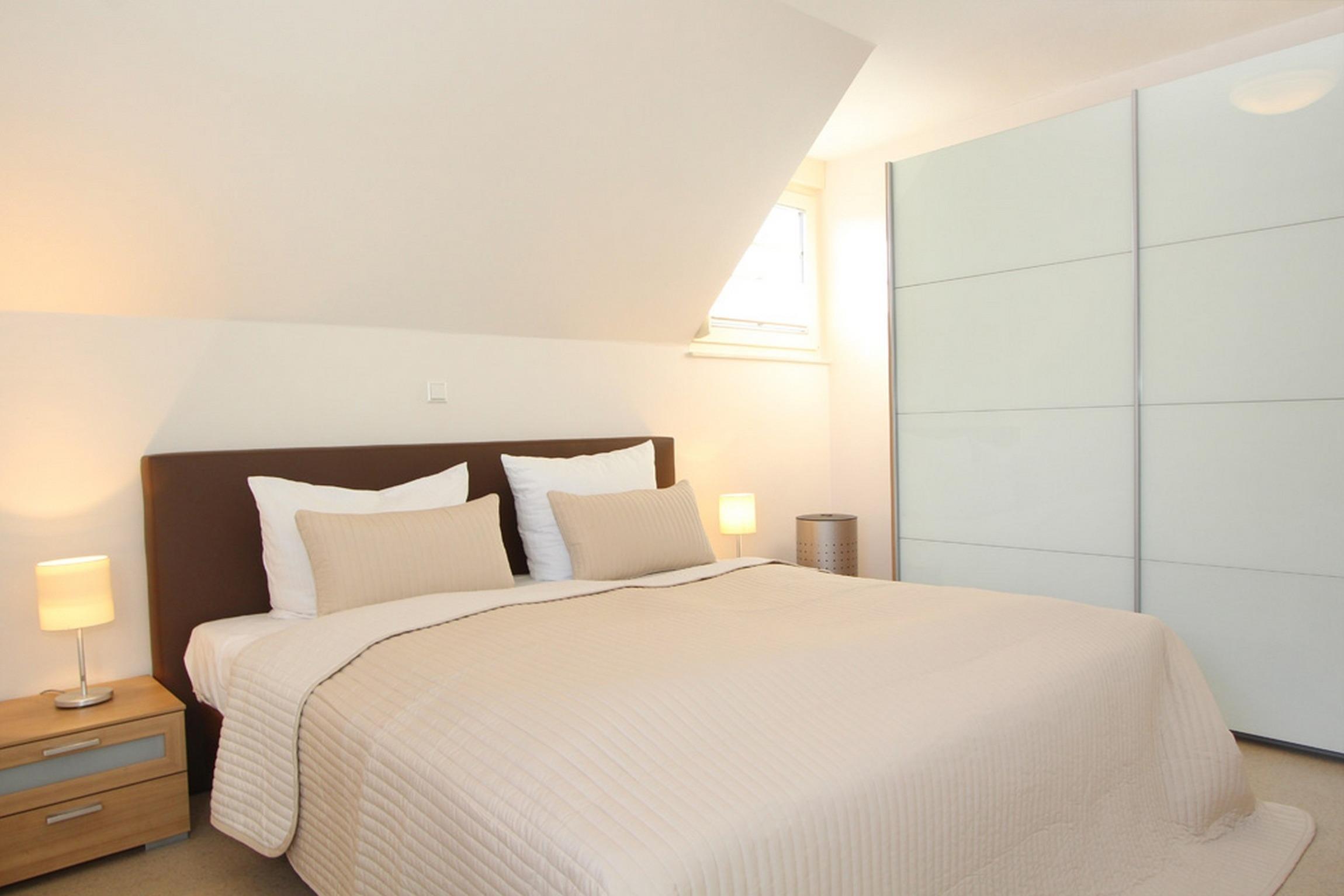Im 1. Obergeschoss, welche Sie über eine geflieste Treppe erreichen, befindet sich ein Schlafzimmer mit Boxspringbett (180x200cm) und geräumigem Kleiderschrank sowie ebenfalls SAT-TV.
