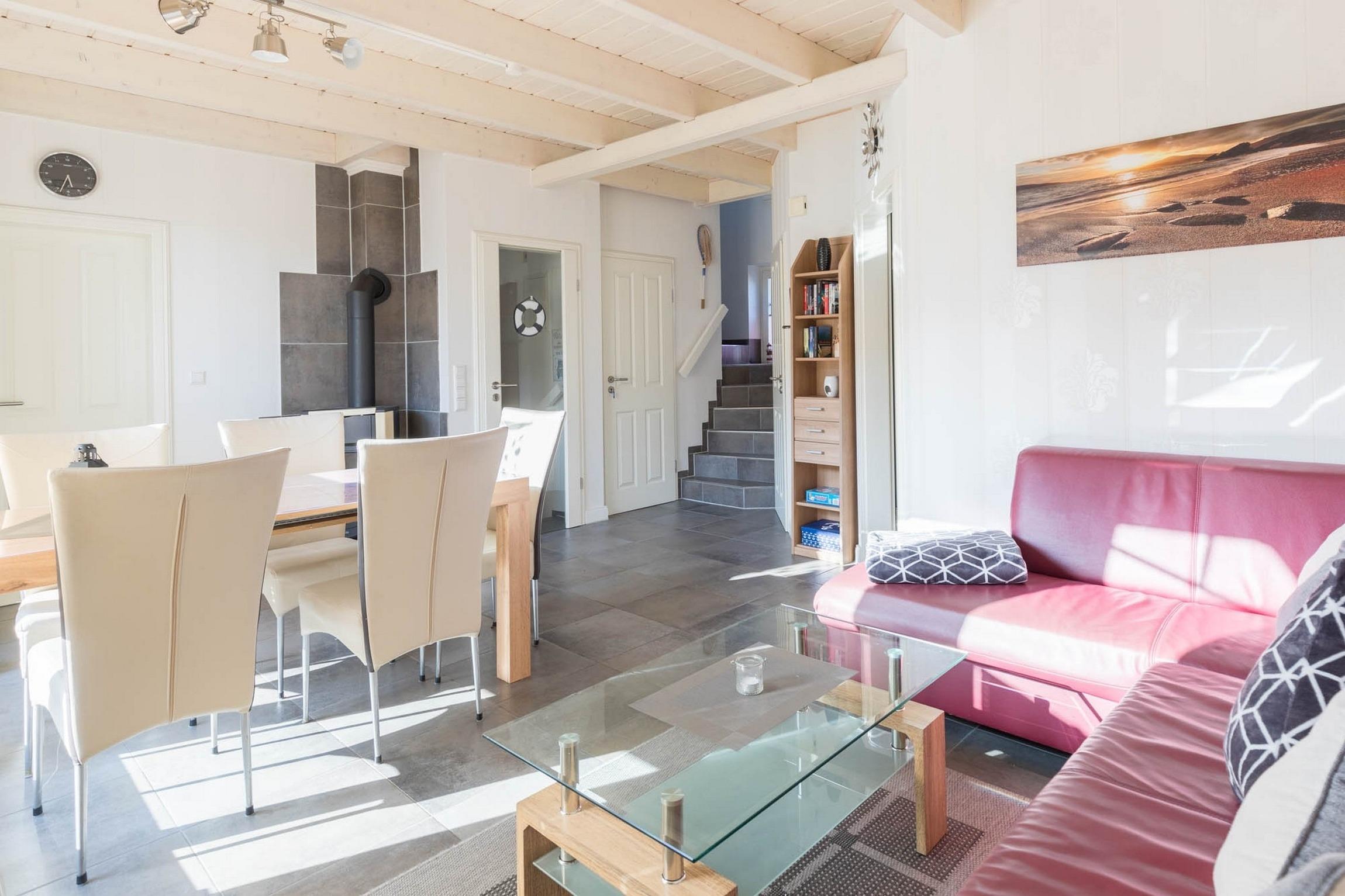 Auf der unteren Ebene lädt im Wohnbereich das große Sofa sowie der Kamin zu gemütlichen Abenden ein. Das Sofa lässt sich ausklappen (Liegefläche ausgeklappt 110x200cm) und bietet so eine weitere Aufteilungsmöglichkeit zum Schlafen der max. 6 Gäste. Für Ihre Unterhaltung stehen Ihnen hier SAT-TV (Flatscreen), DVD-Player und eine Musikanlage zur Verfügung. Ein Reisebettchen könnte hier ebenfalls bei Bedarf aufgestellt werden.
