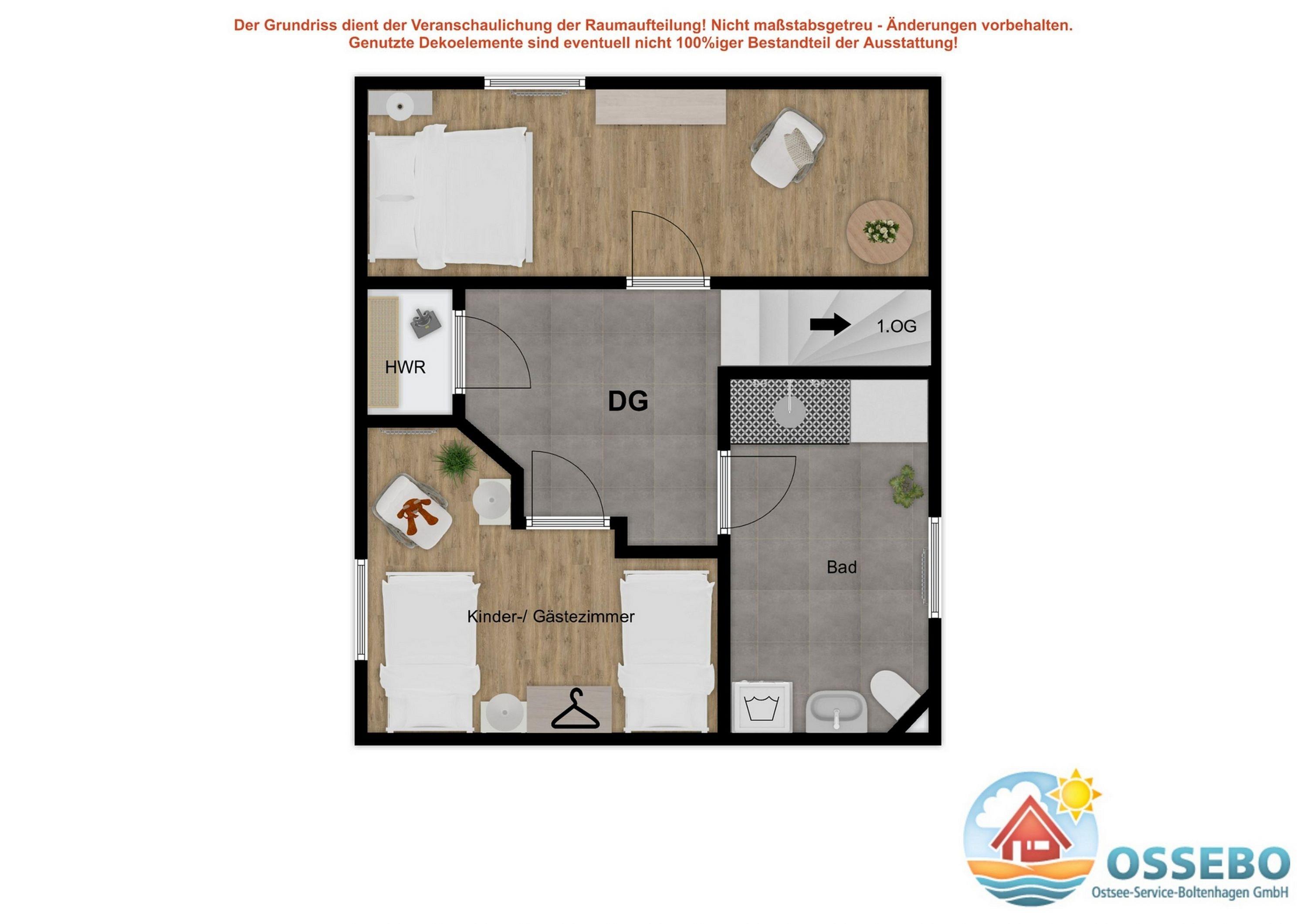Die Ferienwohnung im 1.OG in Boltenhagen verfügt über 4 Zimmer und bietet 6 Gästen + 1 Kleinkind auf 75qm Wohnfläche - verteilt auf 2 Ebenen - ausreichend Platz.