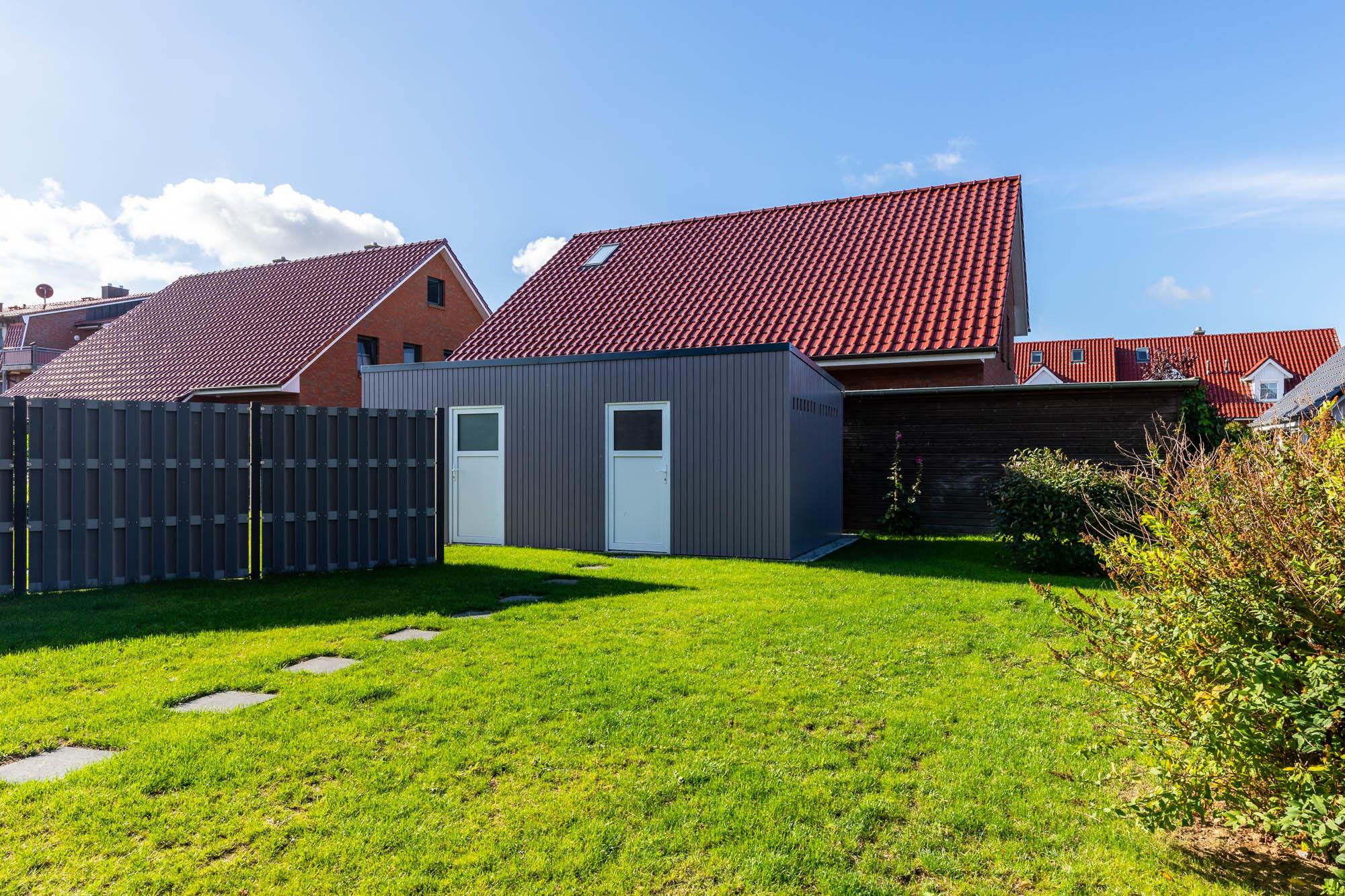 Auf dem Grundstück befindet sich auch ein eigenes abschließbares Abstellhäuschen (mit Steckdose, z.B. für E-Bikes). Hier können Räder [&] Co. sicher untergebracht werden.