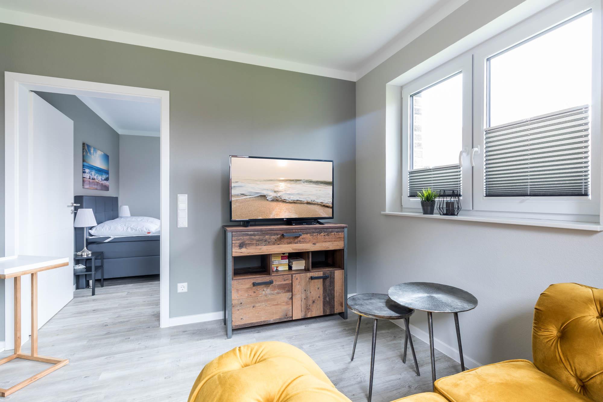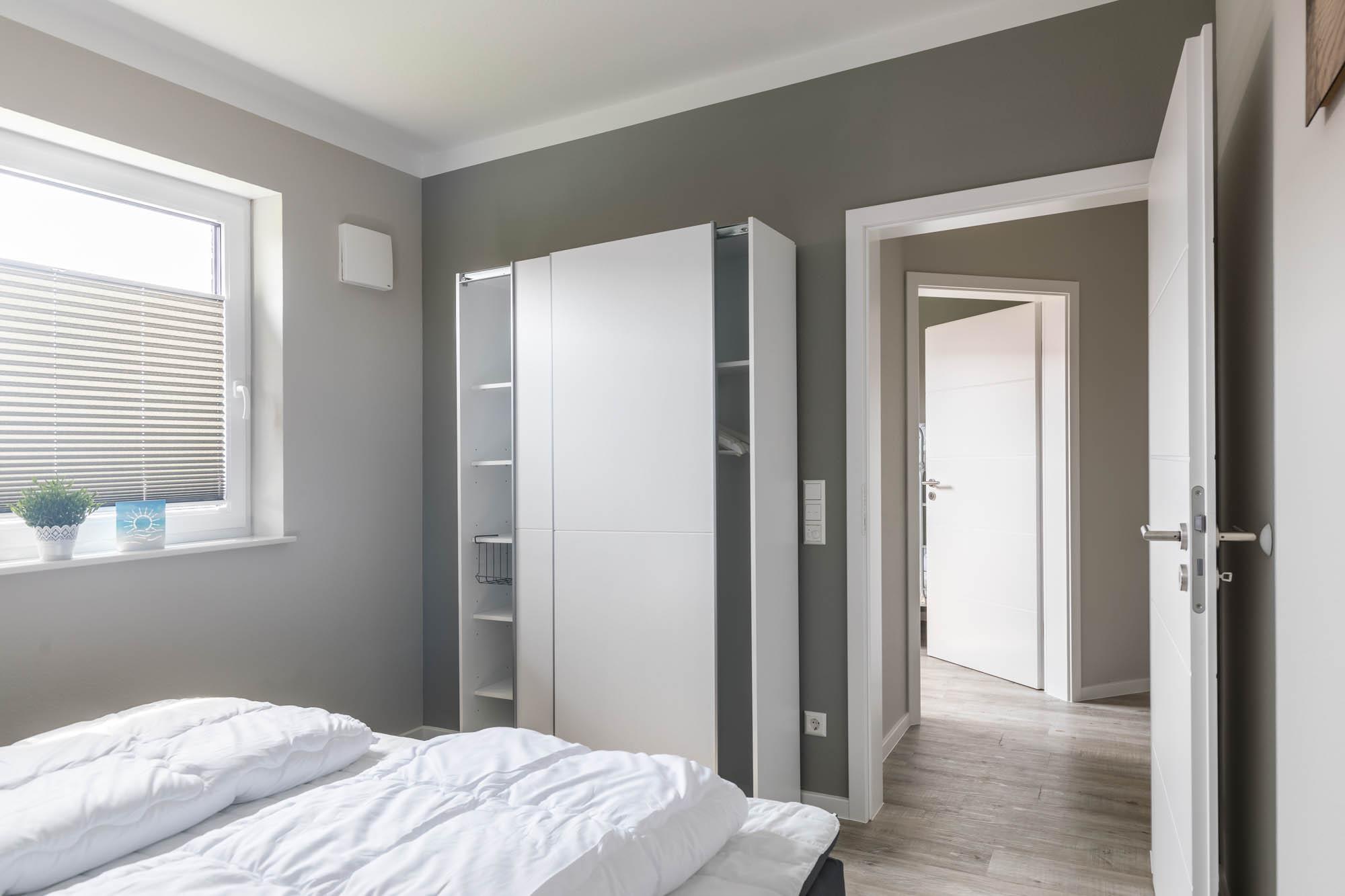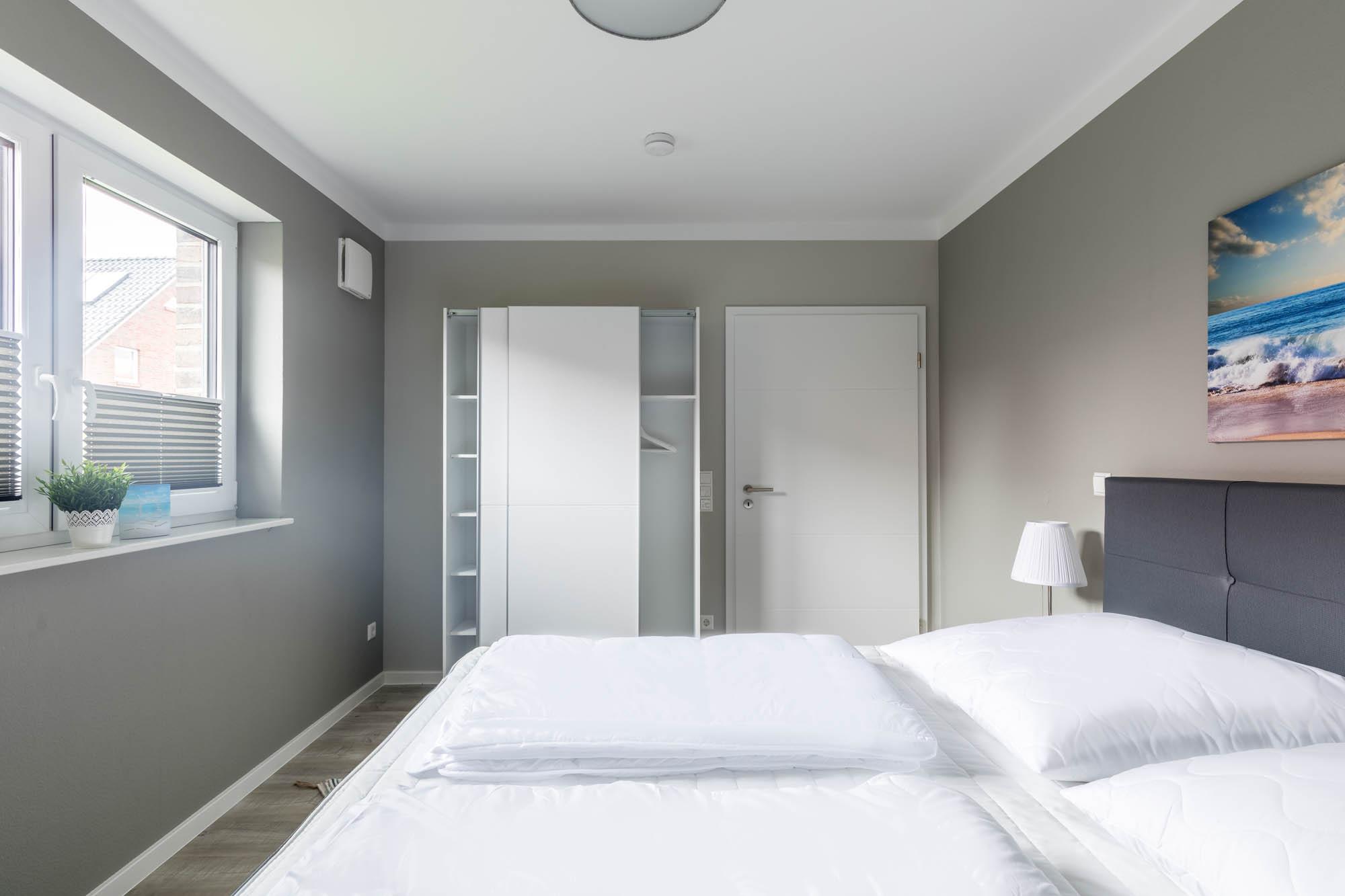 Eines der insgesamt drei Schlafzimmer finden Sie ebenfalls im Erdgeschoss, dieses ist mit einem Doppelbett (180x200cm) und einem Kleiderschrank ausgestattet. Ein Reisebettchen könnte in diesem Schlafzimmer auch noch mit aufgestellt werden.
